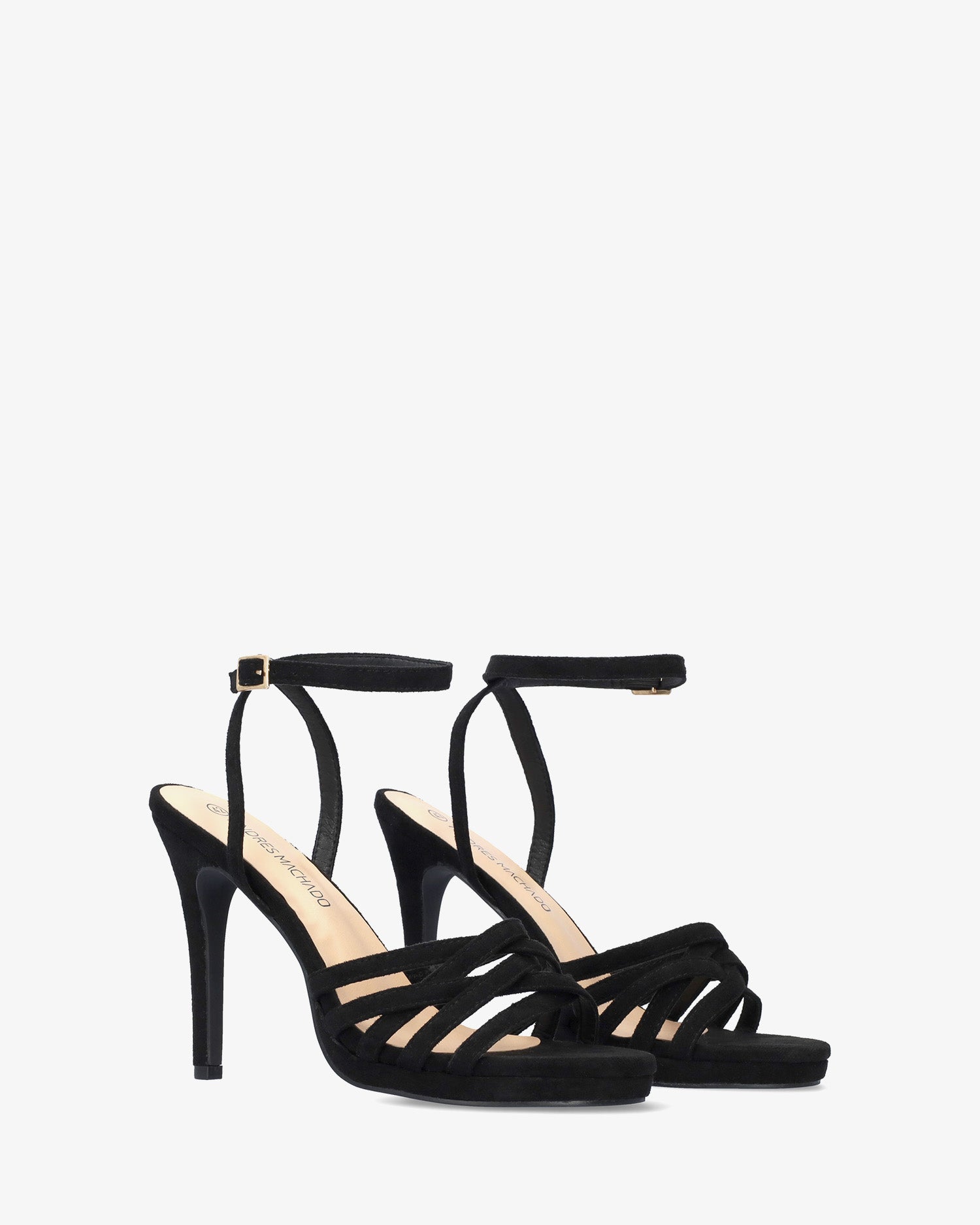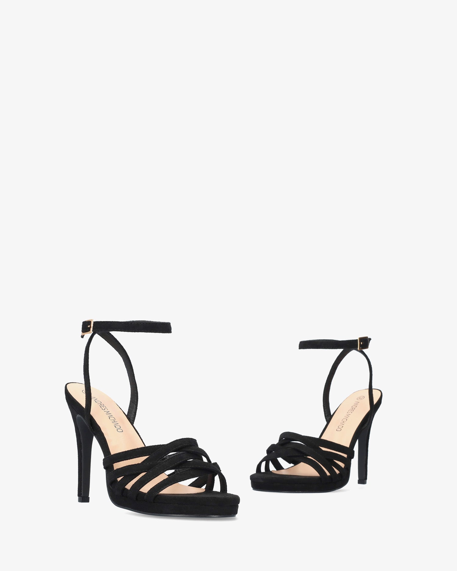 Black faux suede high-heeled sandals with a small platform. Open-toe design with thin straps in the front. Metallic buckle closure ankle strap. High heel. Heel height of 3,93" and platform height of 0,59" for small sizes from 32 to 35. Heel height of 4,92" and platform height of 0,78" for large sizes from 42 to 45.