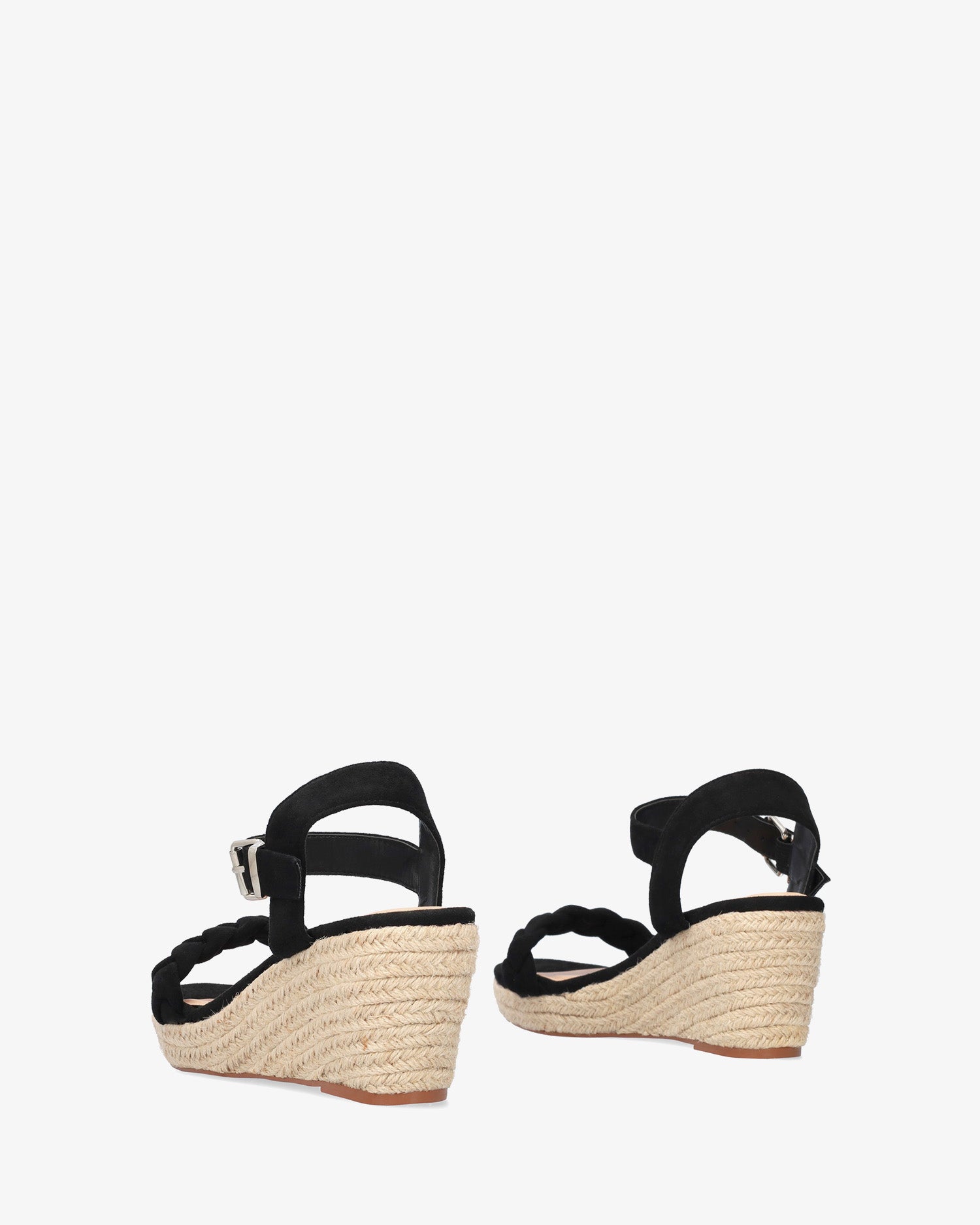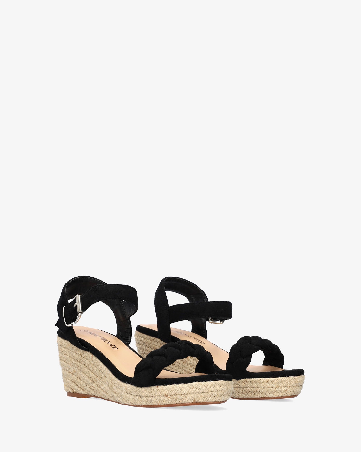 Black faux suede sandals with a wedge. Backless design with a wide braided strap in the front. Buckle closure with a wide strap around the ankle. Open toe. Jute wedge and front platform. Wedge measures 2,75", and the platform is 0,98" for small sizes from 32 to 35. Wedge measures 3,34", and the platform is 1,18" for large sizes from 42 to 45. This model may vary from the standard, we recommend you check the cms of the insole.