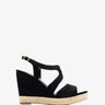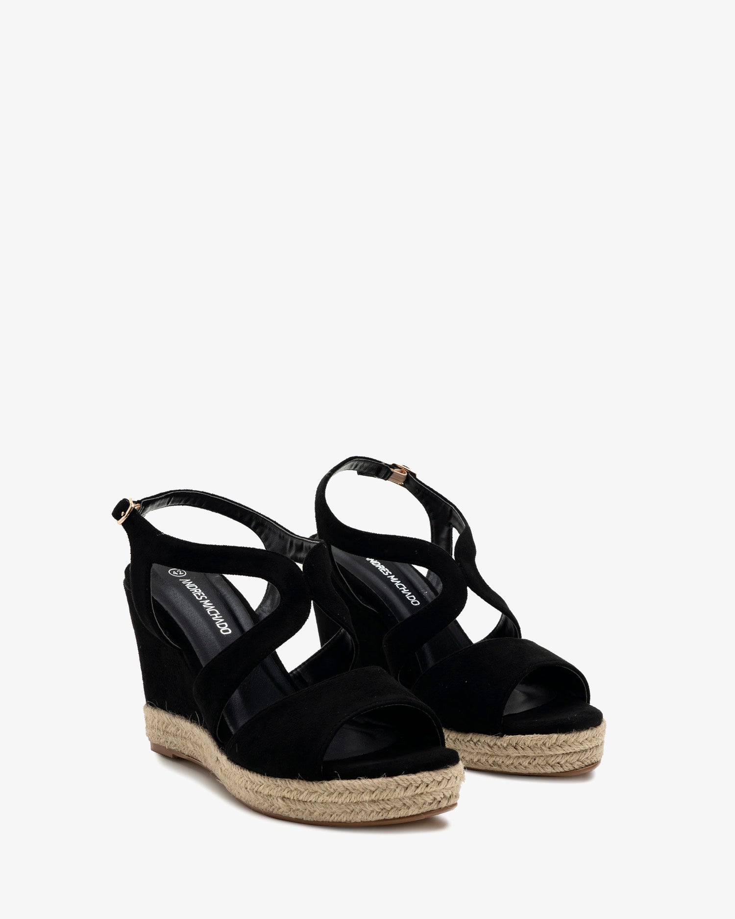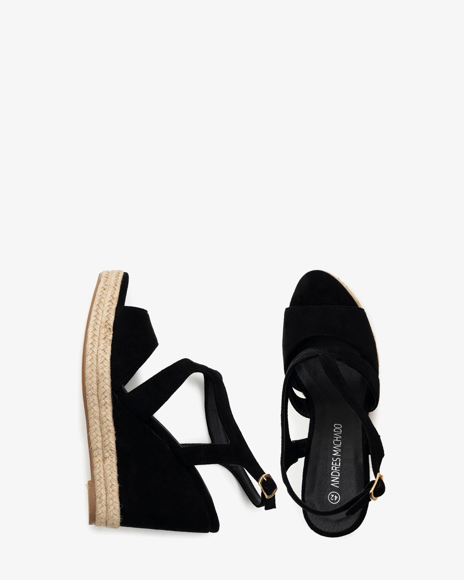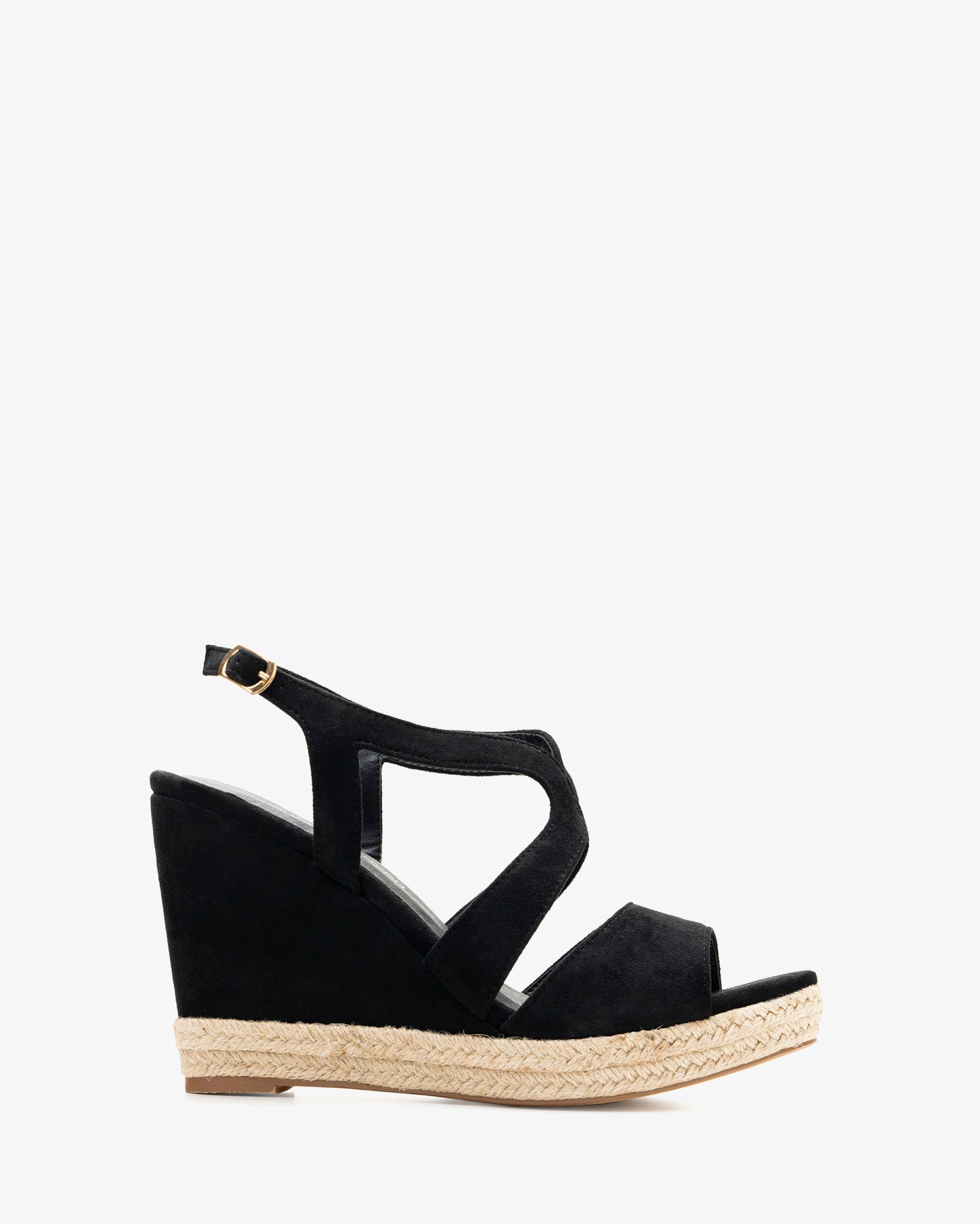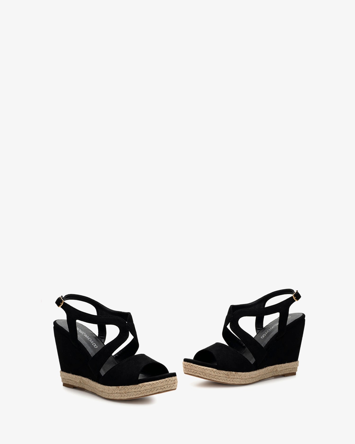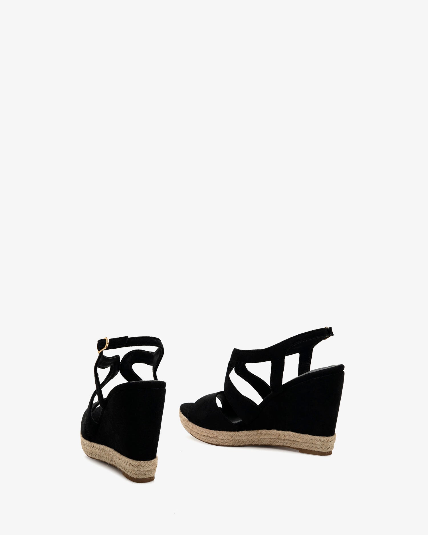 Black faux suede wedged sandals. Matching black, oval shaped straps joined at the instep and wide strap over the toes. Buckle closure on the external face, around the ankle. Open, almond shaped toe box. Jute trim detail covering the platform and base of the faux suede wedge. The wedge is 10 cm / 3.93`` high and the platform is 2 cm / 0.78`` high for small sizes from 32 to 35 EU. The wedge is 11 cm / 4.33`` high and the platform is 2 cm / 0.78`` high for large sizes from 42 to 45 EU.