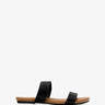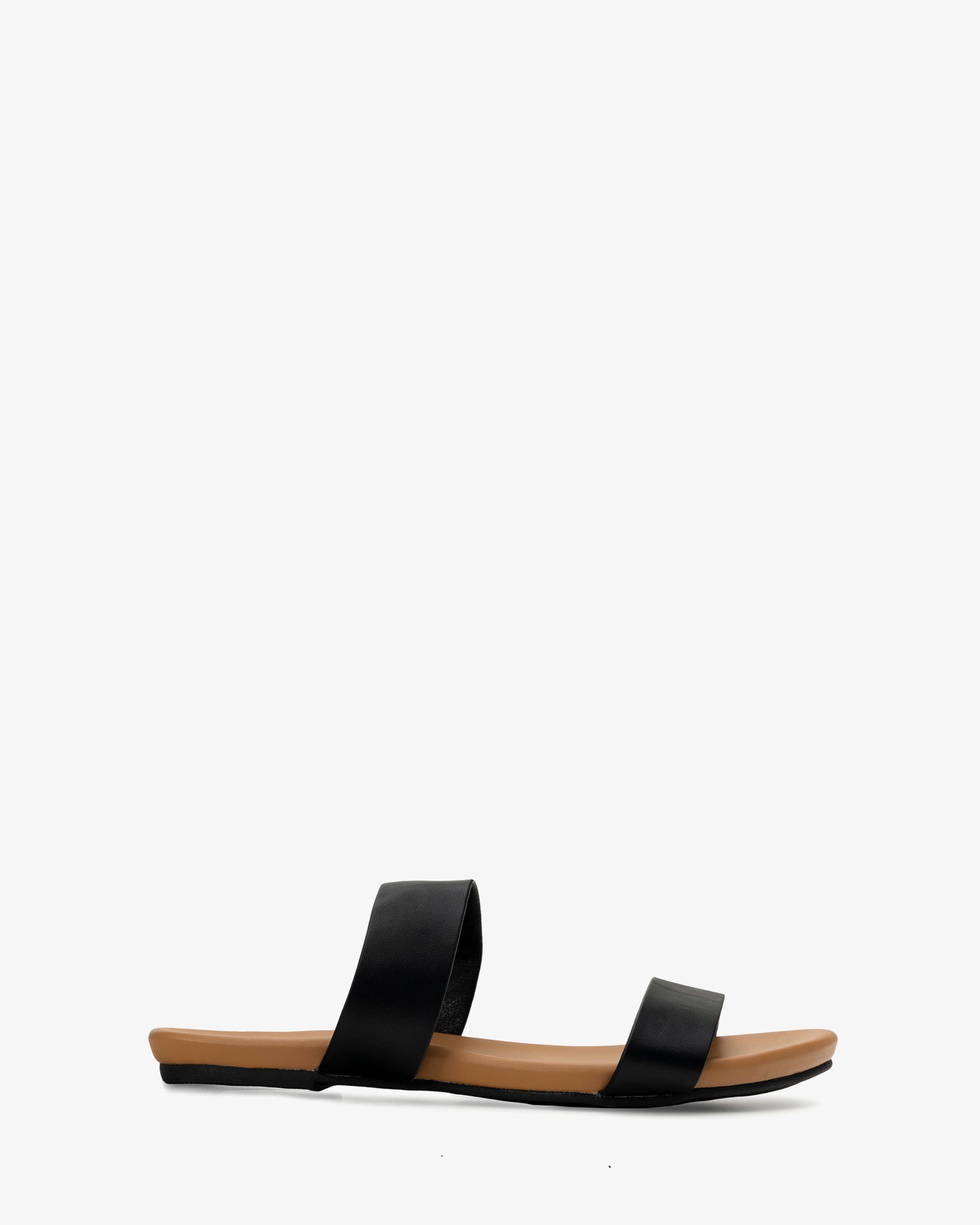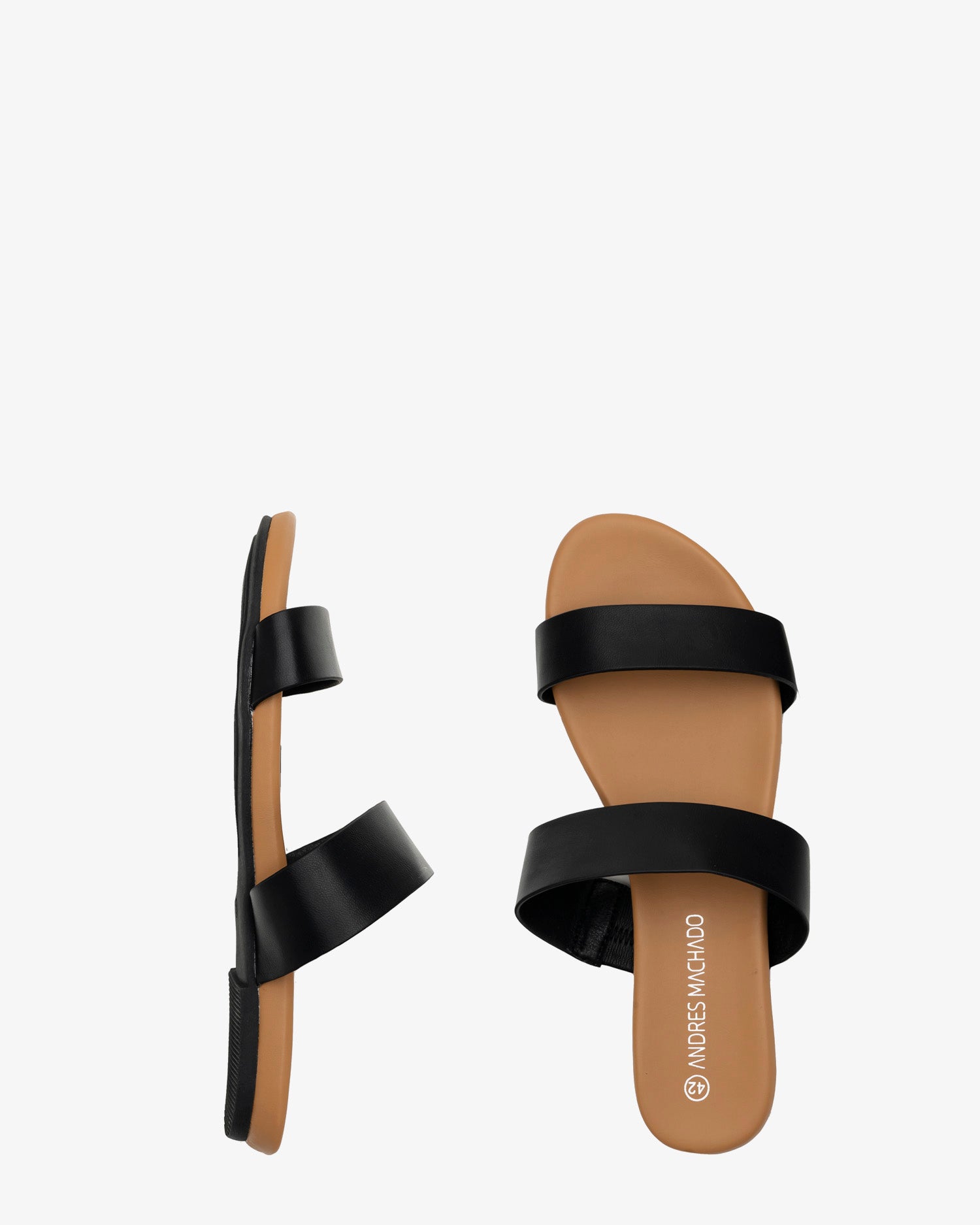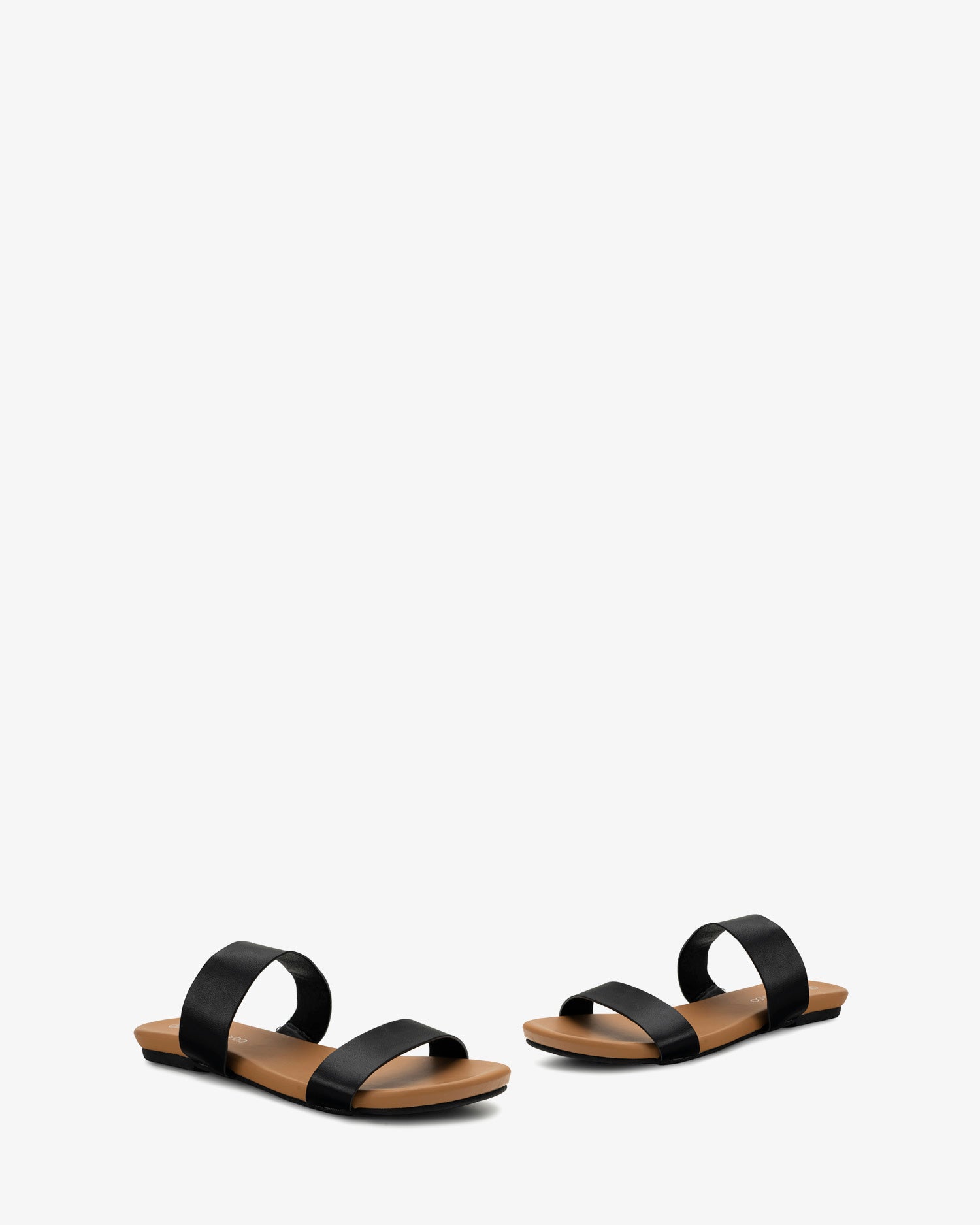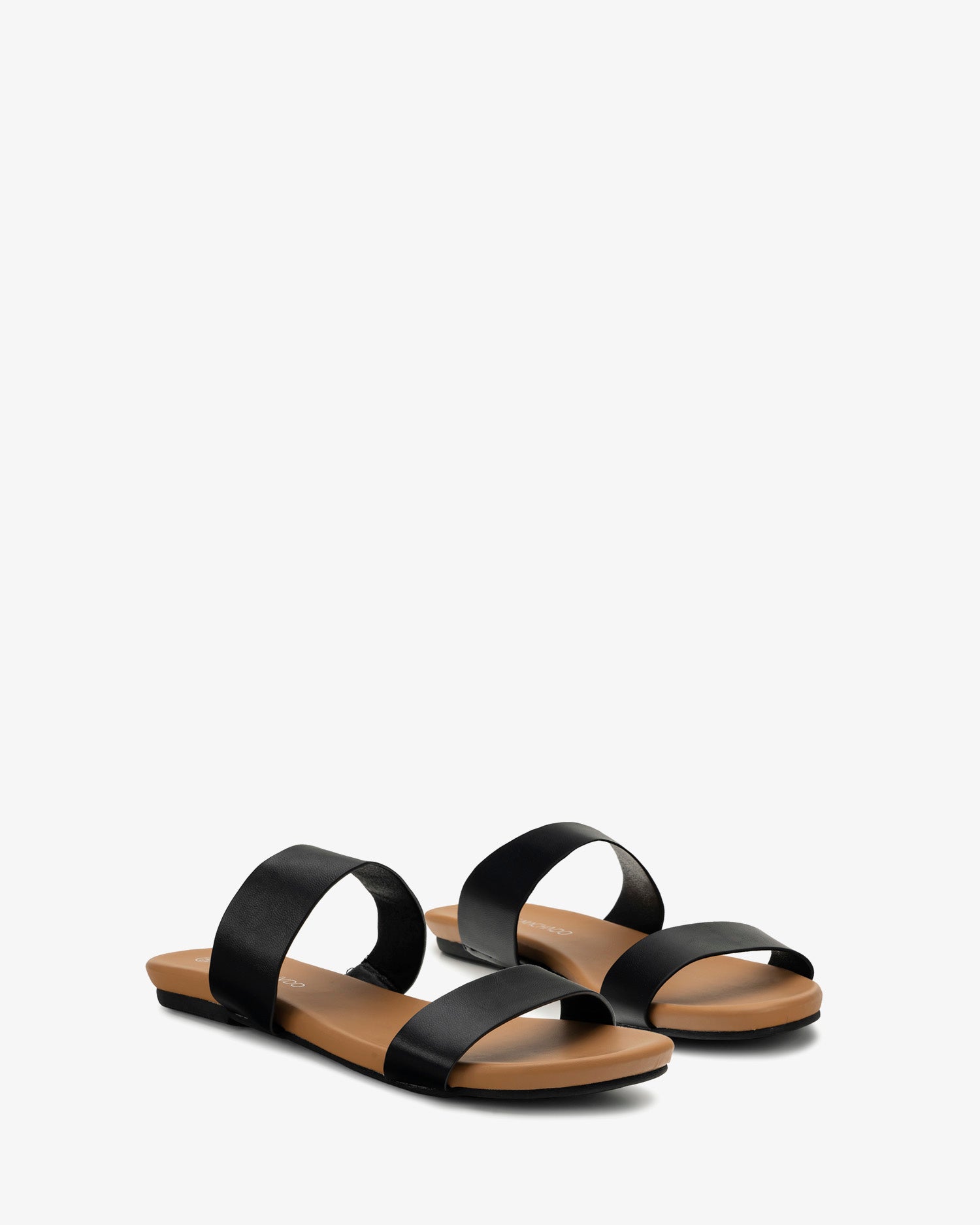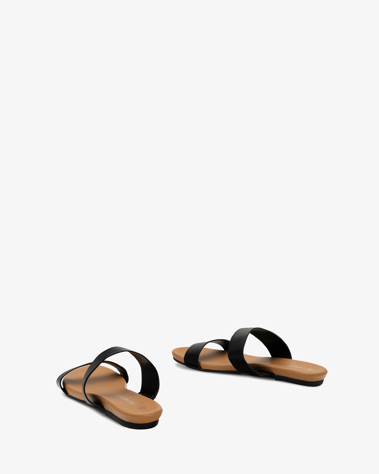 Black faux leather flat sandals featuring two matching, wide straps over the vamp and instep. Open, round toe box and cushioned insole. Available in large sizes from 42 to 45 EU.