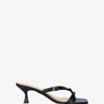 Kitten heel sandals in black leather. The design features a thin strap over the vamp and a V-shaped toe-strap. Buckle detail on one of the straps. Finished in a square toe. The matching heel is 7cm / 2,76`` high for small sizes from 32 to 35 EU. The heel is 7,5cm / 2,95" high for large sizes from 42 to 45 EU. Made in Spain