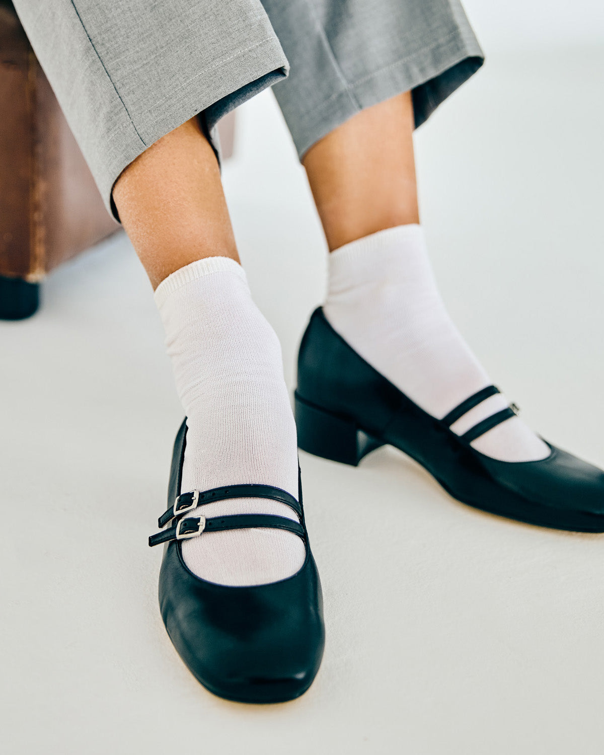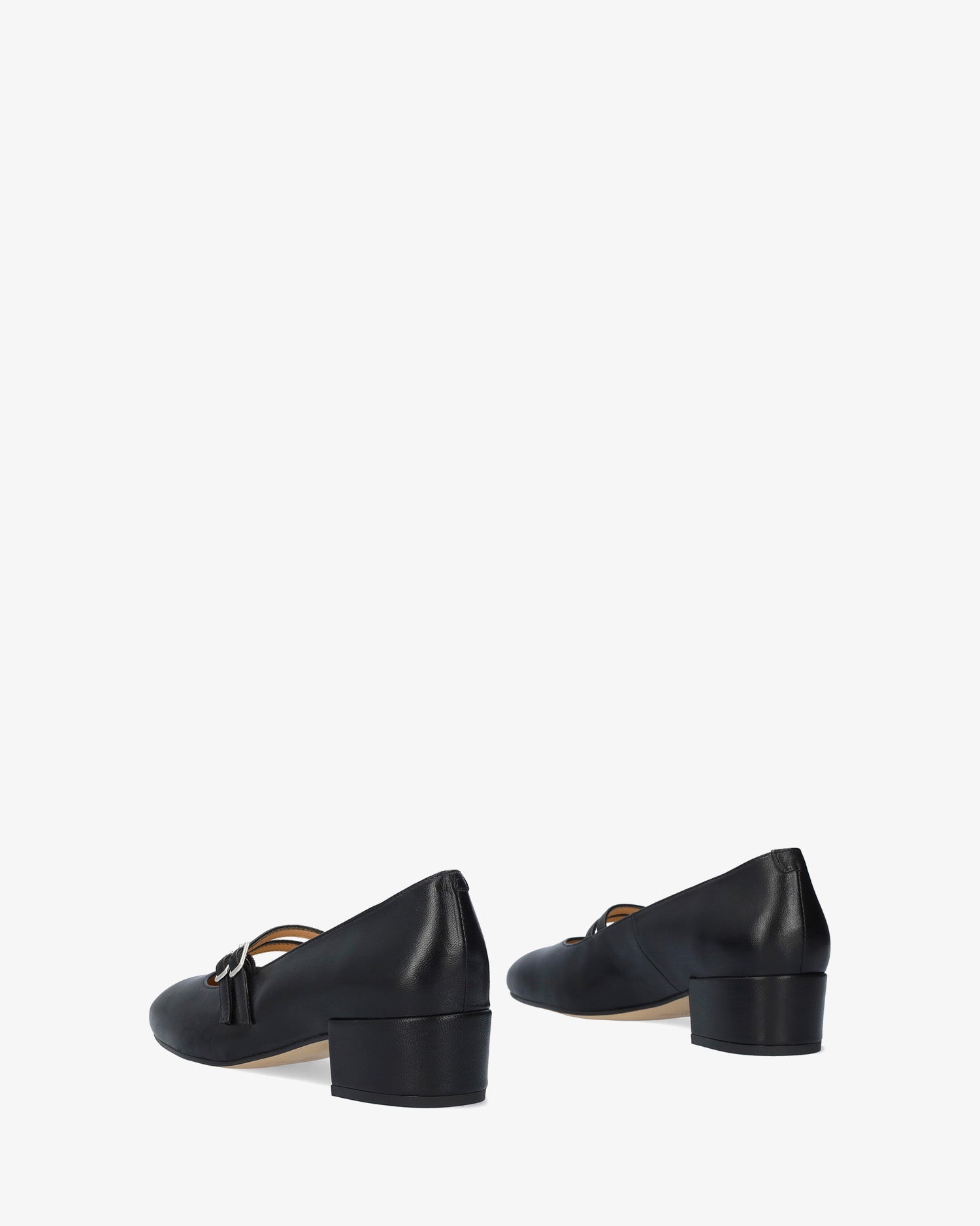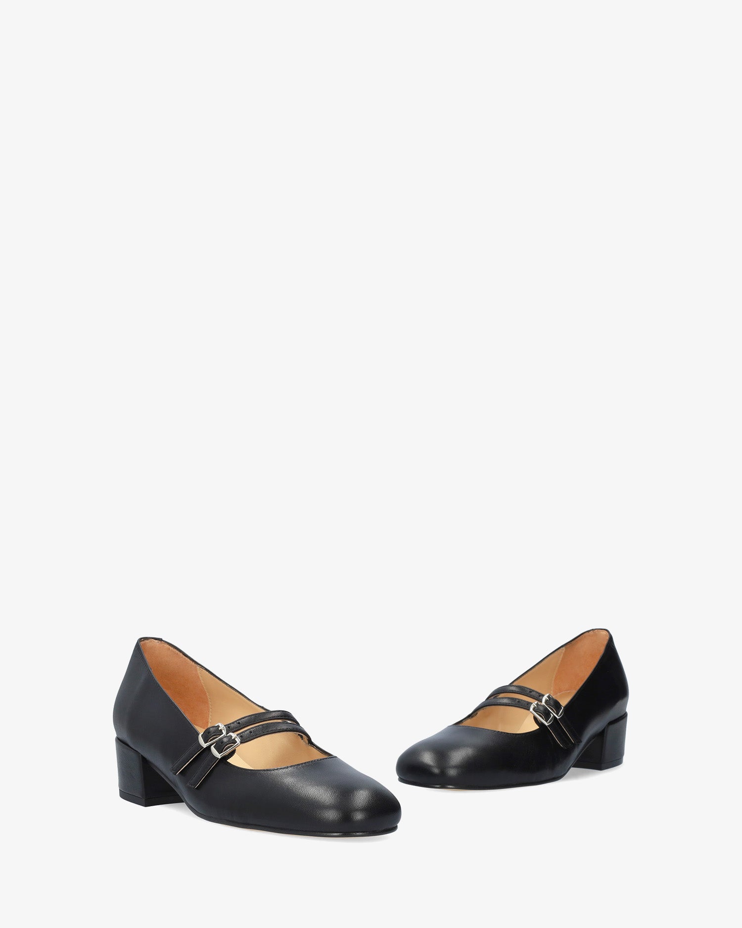 Black leather shoe with two tone-matching elastic straps across the instep and a metal buckle fastening, leather lining and round toe finish. Wide covered heel measuring 4cm / 1,57" for smaller sizes (32 to 35) and 4,5cm / 1,77" for larger sizes (42 to 45). Made in Spain