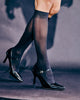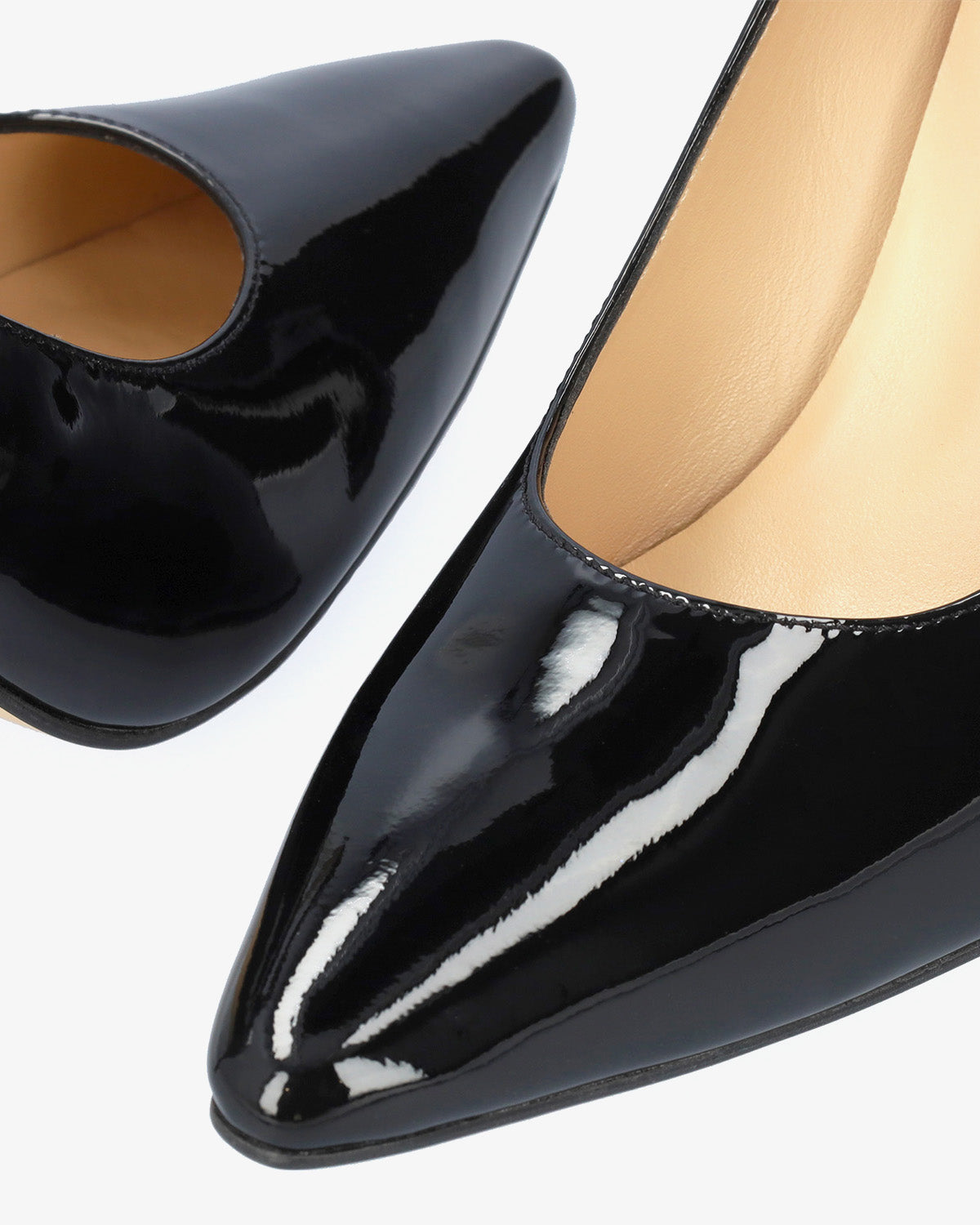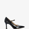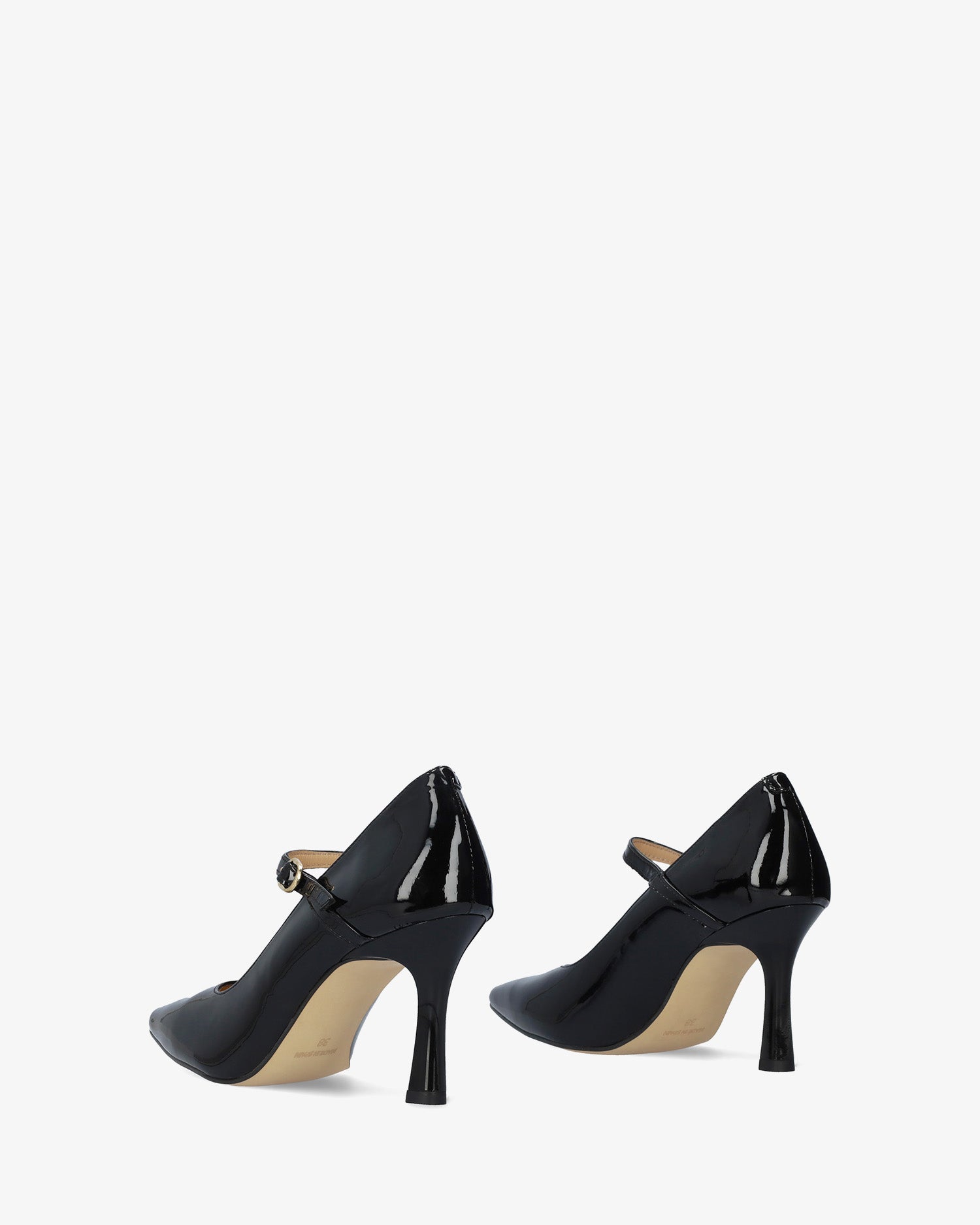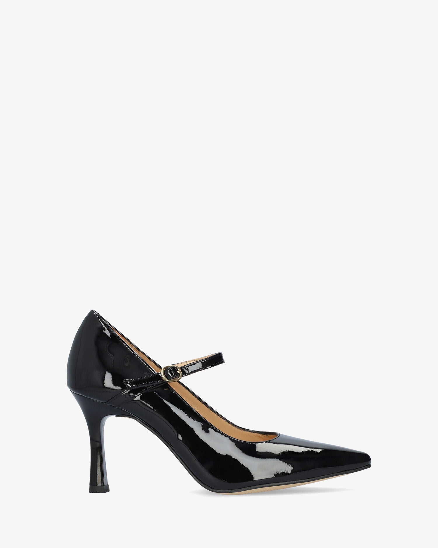 Black patent leather court shoe with a leather lining and pointed toe. Features a strap across the instep with a side metal buckle. The slender black heel measures 8,5cm / 3,34" for smaller sizes (32 to 35) and 9,5cm / 3,74" for larger sizes (42 to 45). Made in Spain.