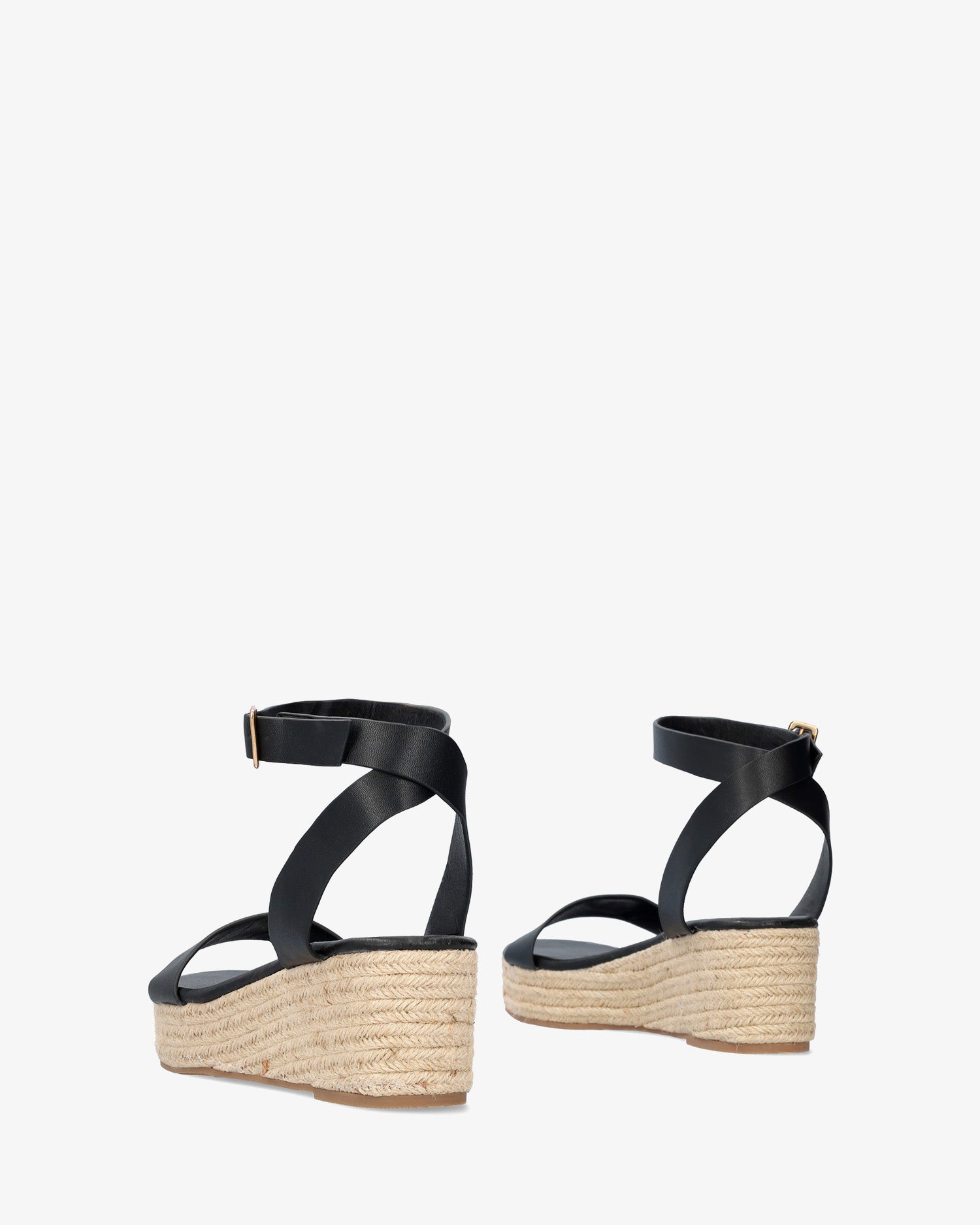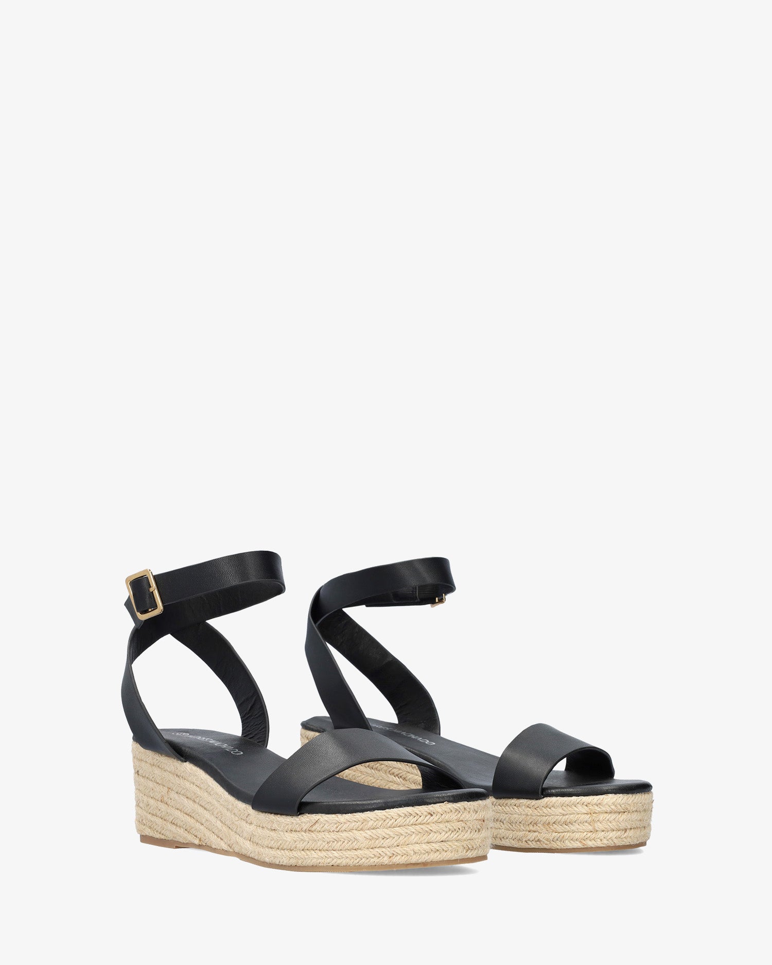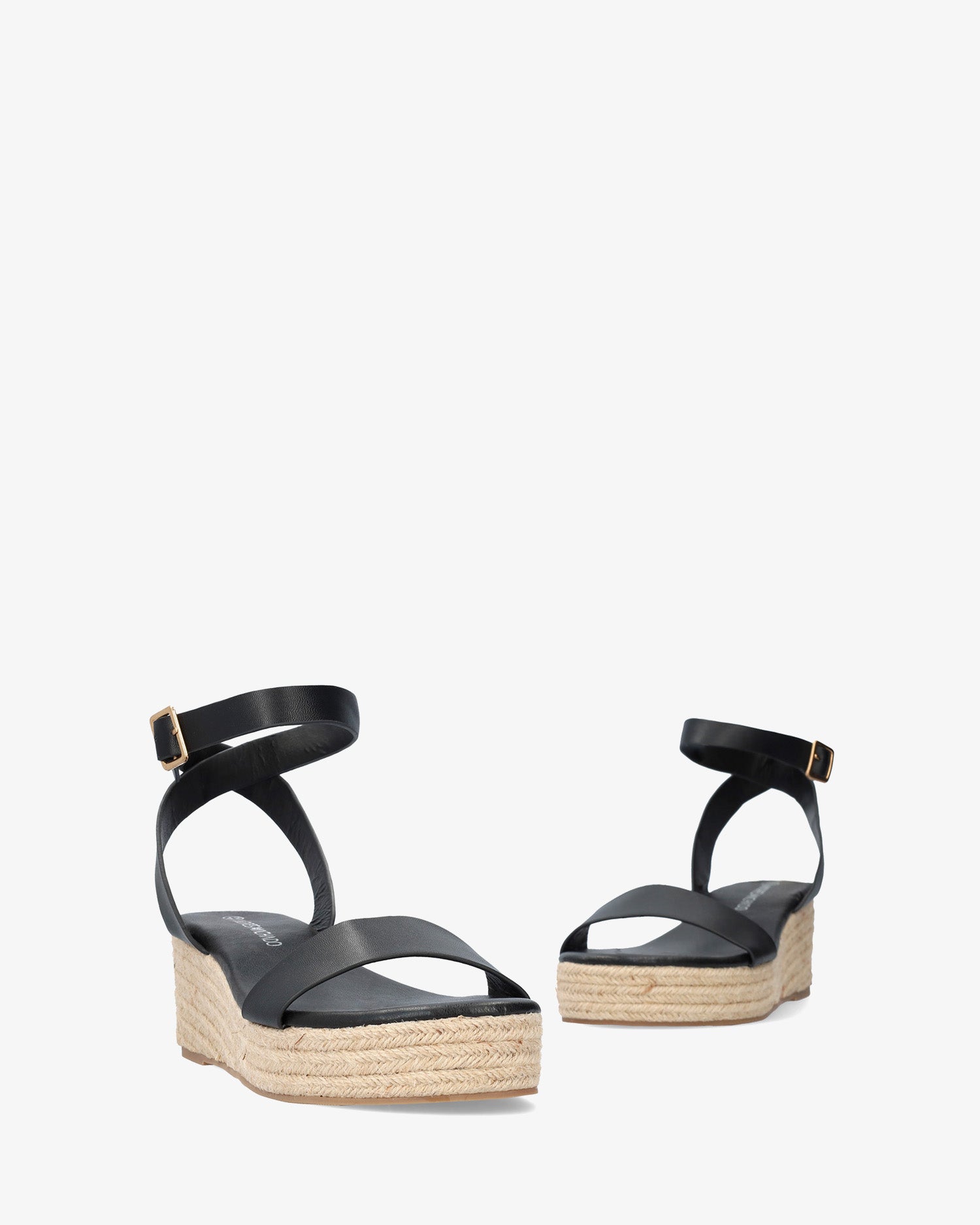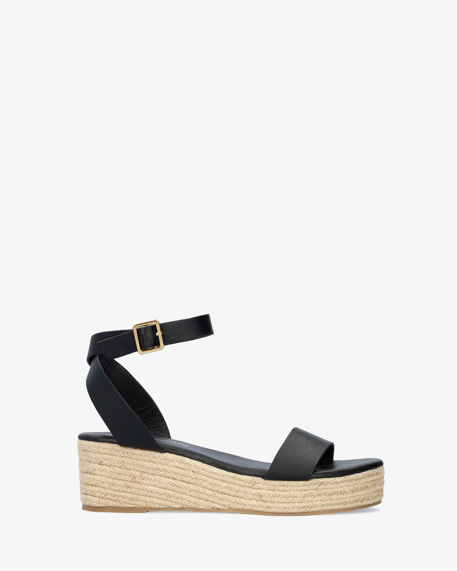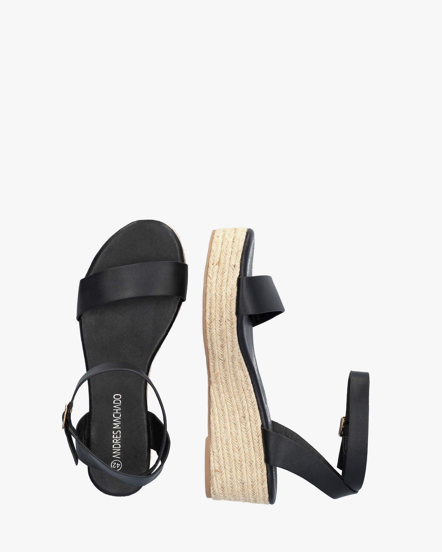 Black soft sandals with a jute wedge. Backless design with a wide front strap. Metallic buckle closure with a strap in the same tone around the ankle. Open toe. Wedges and front platform in jute. Wedge measures 2,56", and the platform measures 1,18" for small sizes from 32 to 35. Wedge measures 2,56", and the platform measures 1,18" for large sizes from 42 to 45.