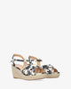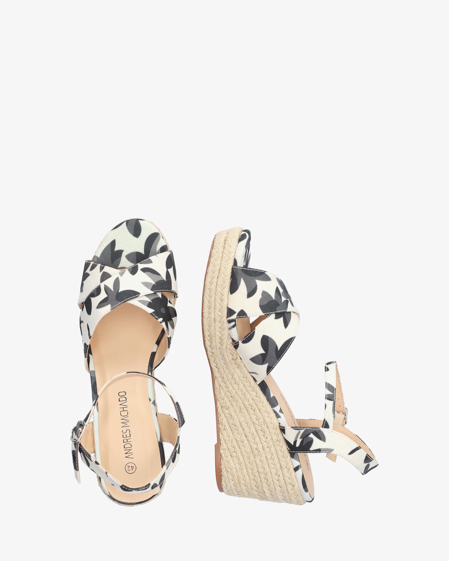 Floral black and gray fabric sandals with a wedge. Open-back design with a heel strap. Open and round toe with wide crossed straps on the front. Metal buckle closure with a matching ankle strap. Wedges and front platform made of jute. Wedge measures 2,73", and the platform measures 0,78" for small sizes from 32 to 35. Wedge measures 3,31", and the platform measures 0,97" for large sizes from 42 to 45.
