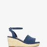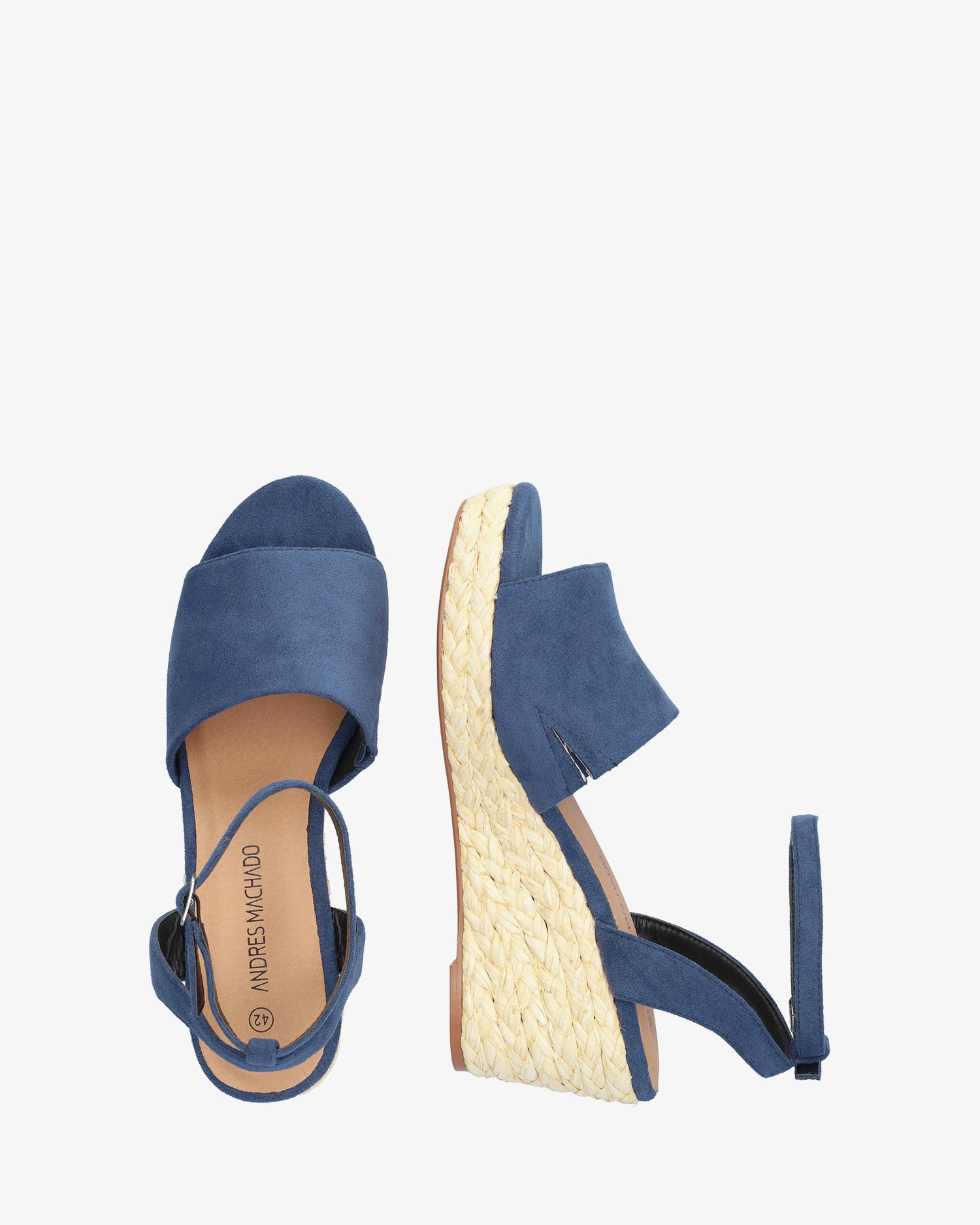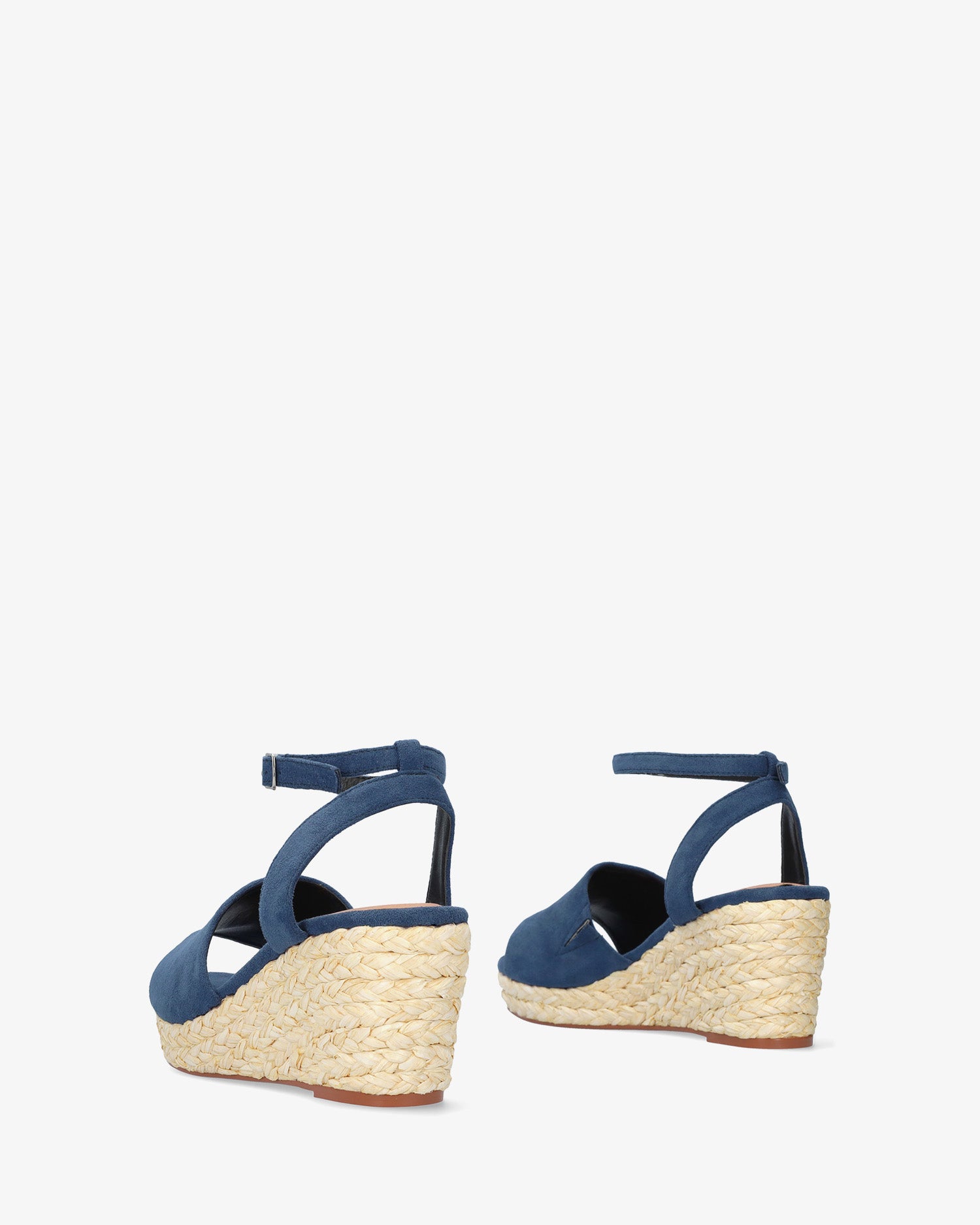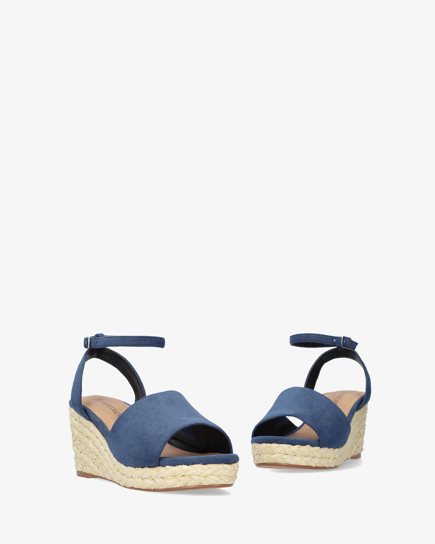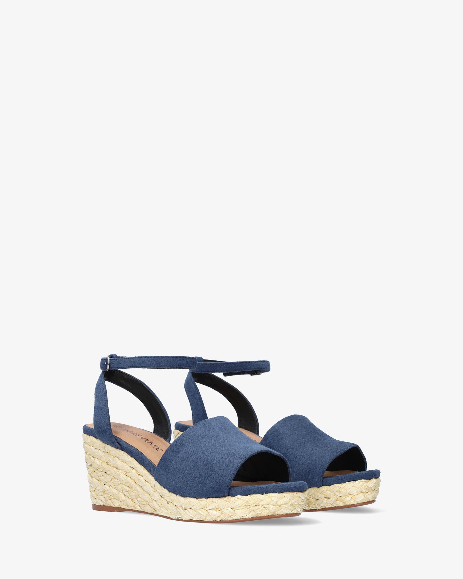 Blue faux suede sandals with a wedge. Open-back design with a wide strap matching the instep. Closure with a metal buckle fastened around the ankle. Open toe. Wedges and front platform made of jute. Wedge measures 2,95", and the platform measures 0,98" for small sizes from 32 to 35. Wedge measures 3,54", and the platform measures 1,18" for large sizes from 42 to 45. Ce modèle peut varier par rapport à la norme, nous vous recommandons de vérifier les cms de la semelle intérieure.
