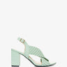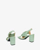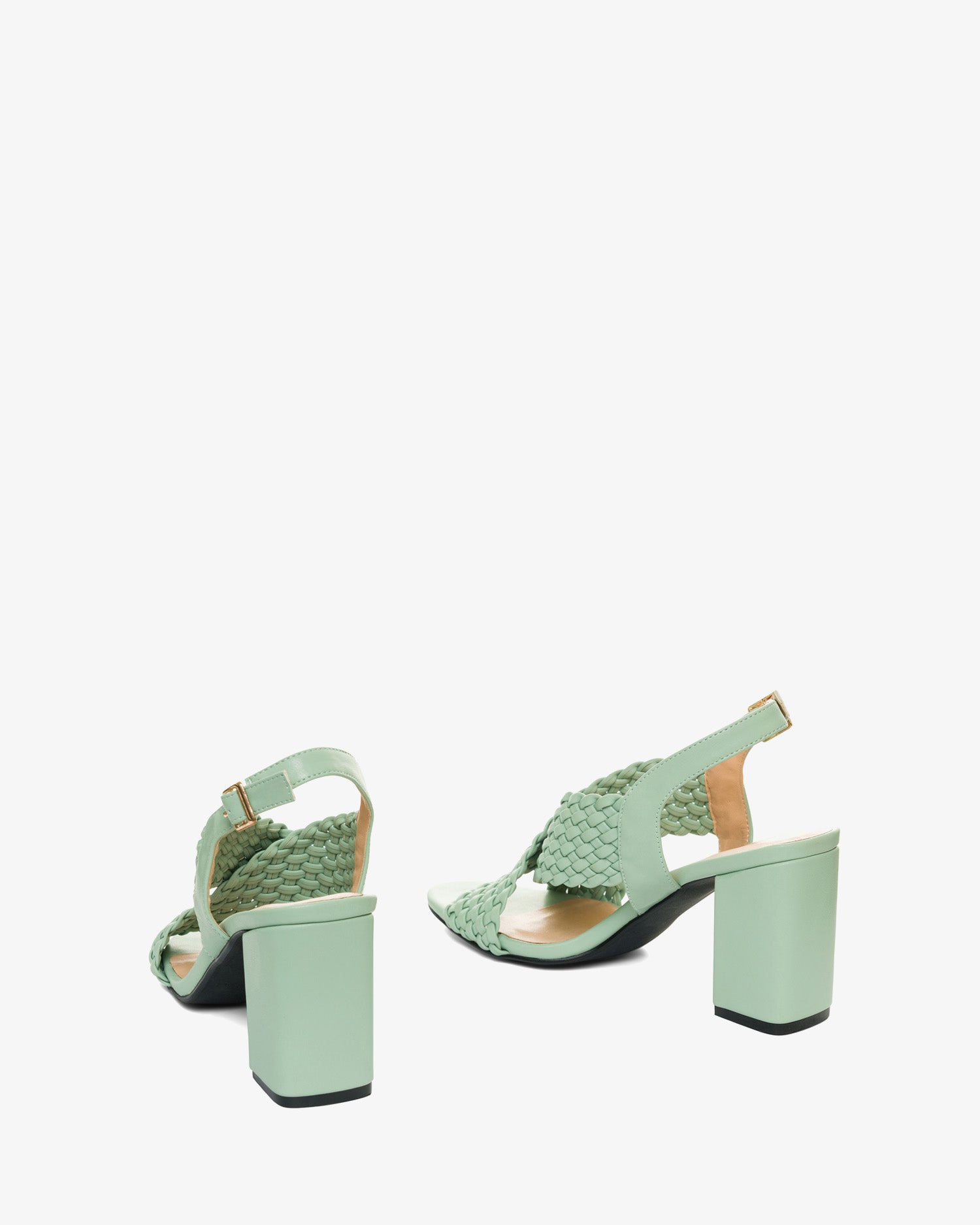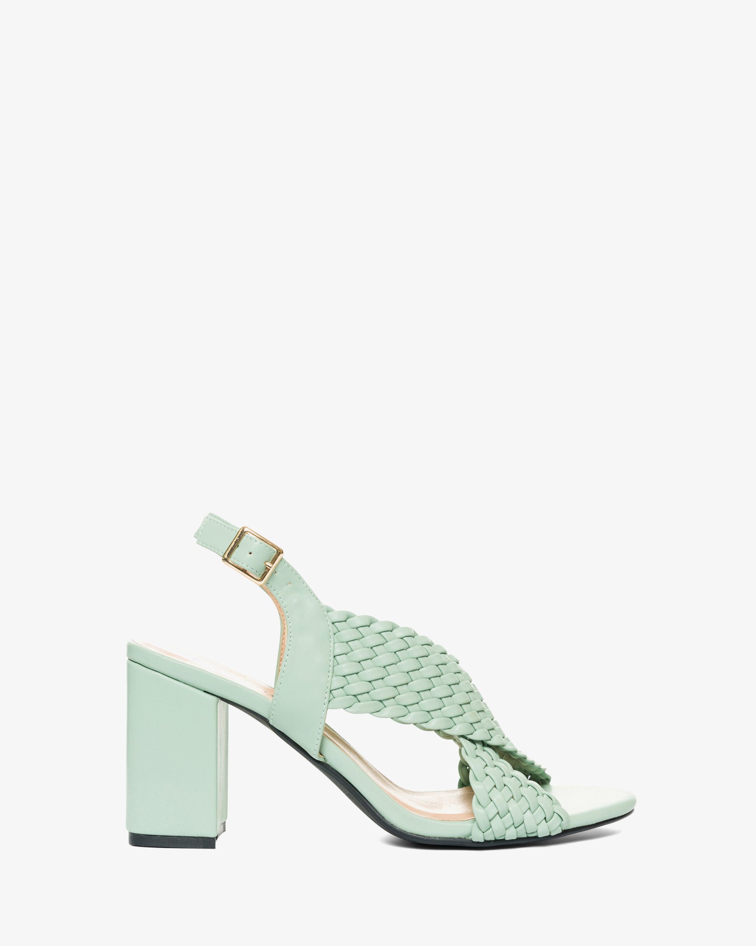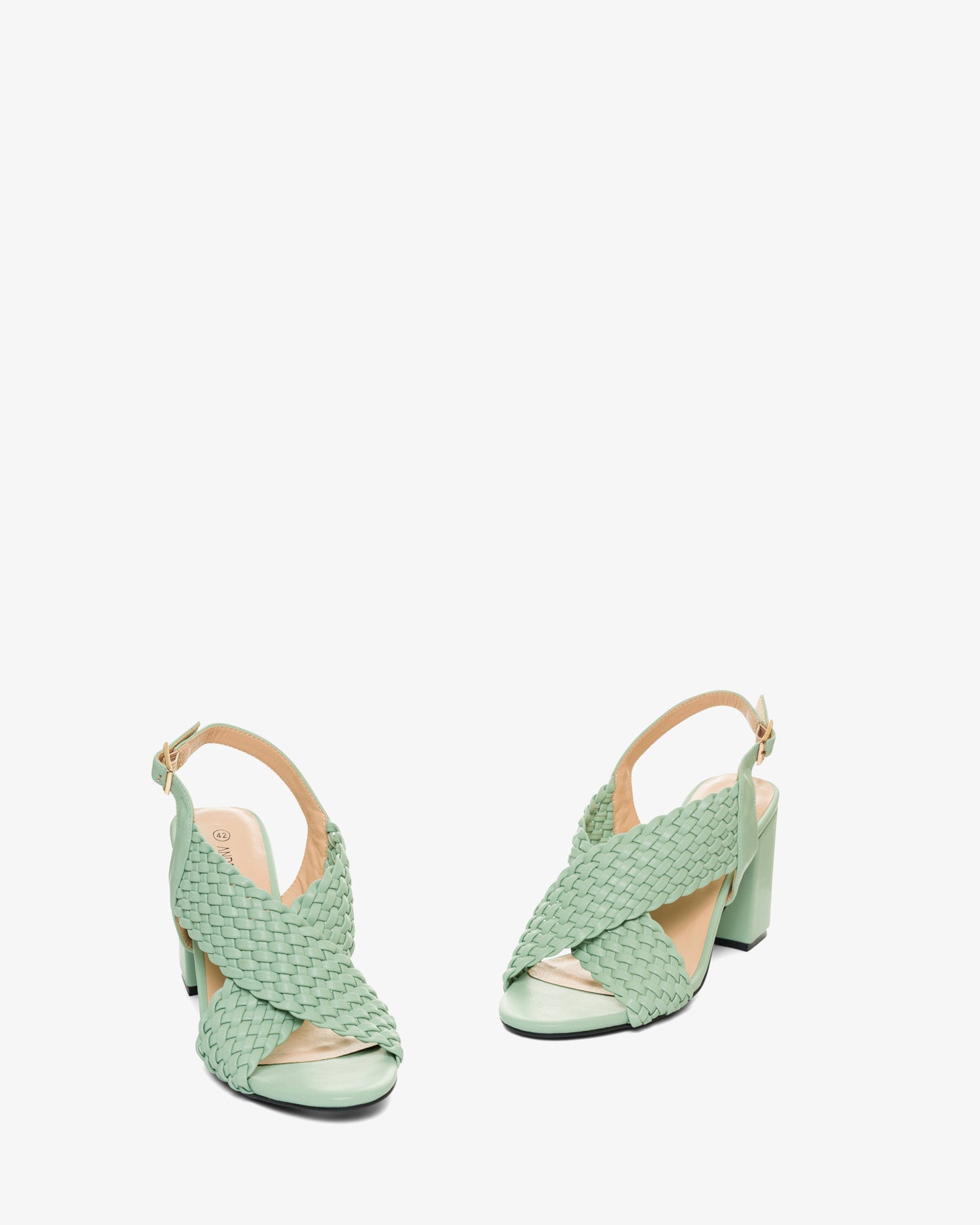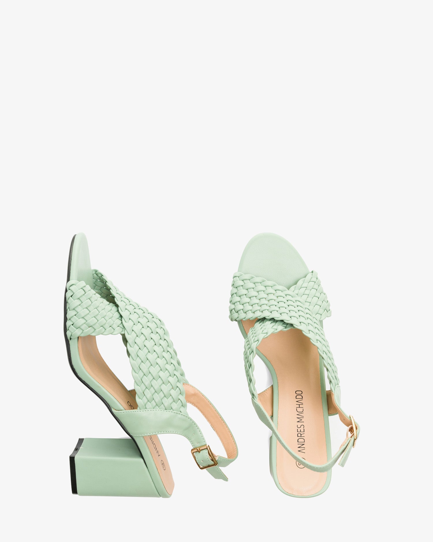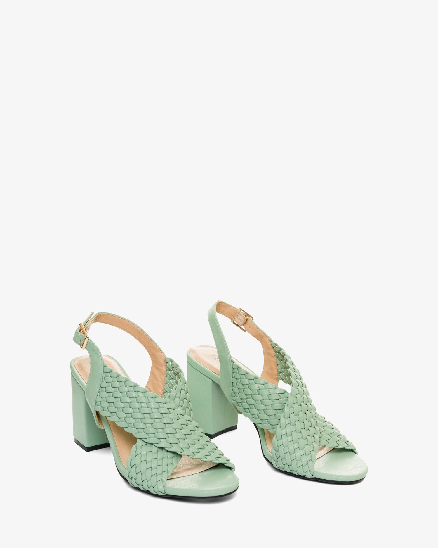 Mint faux leather sandals with a block heel. Slingback design featuring two matching braided wide straps over the instep. Buckled strap closure around the ankle. Round and open toe box. Heel of 3,35" for small sizes from 32 to 35 EU. Heel of 3,74" for large sizes from 42 to 45 EU.