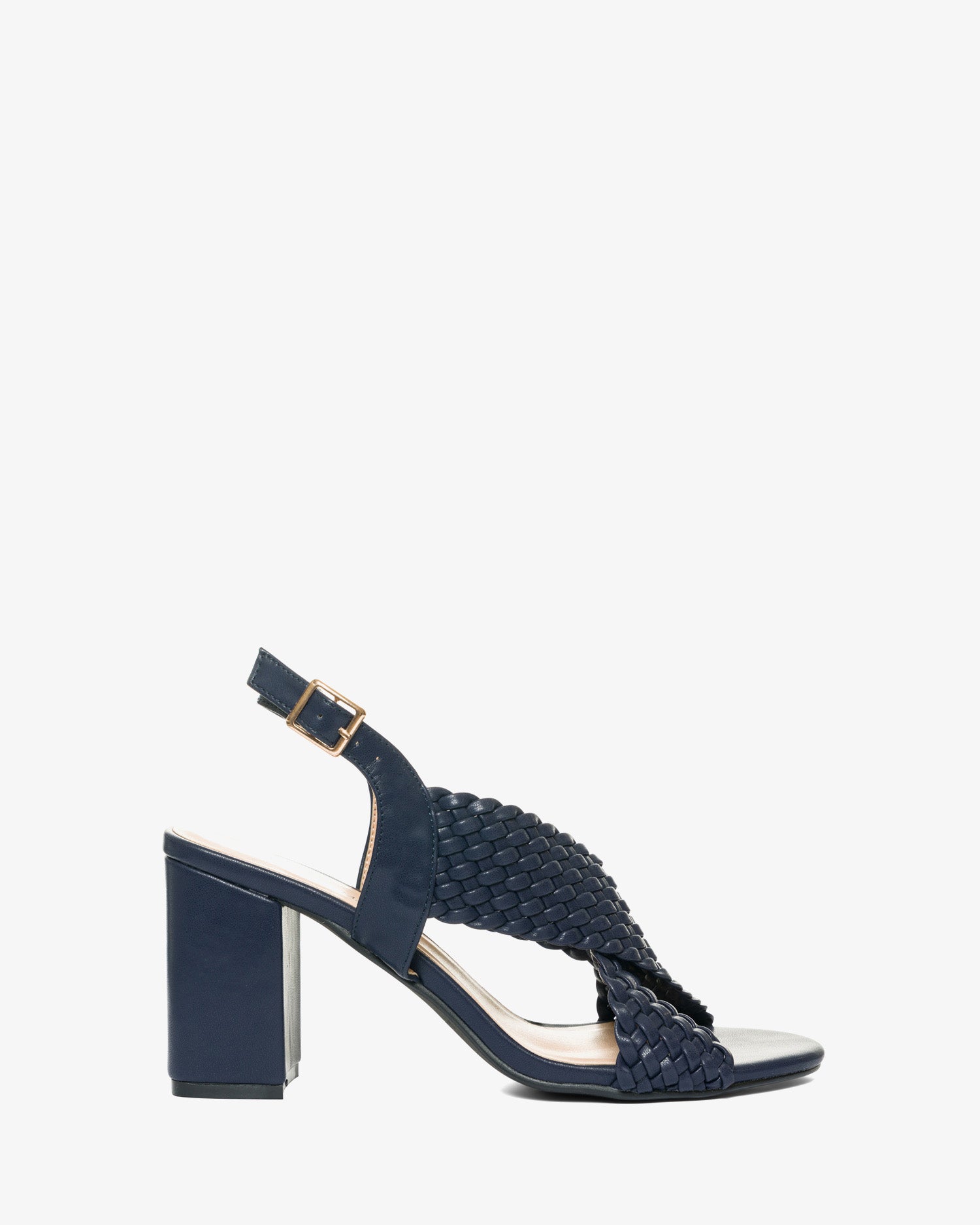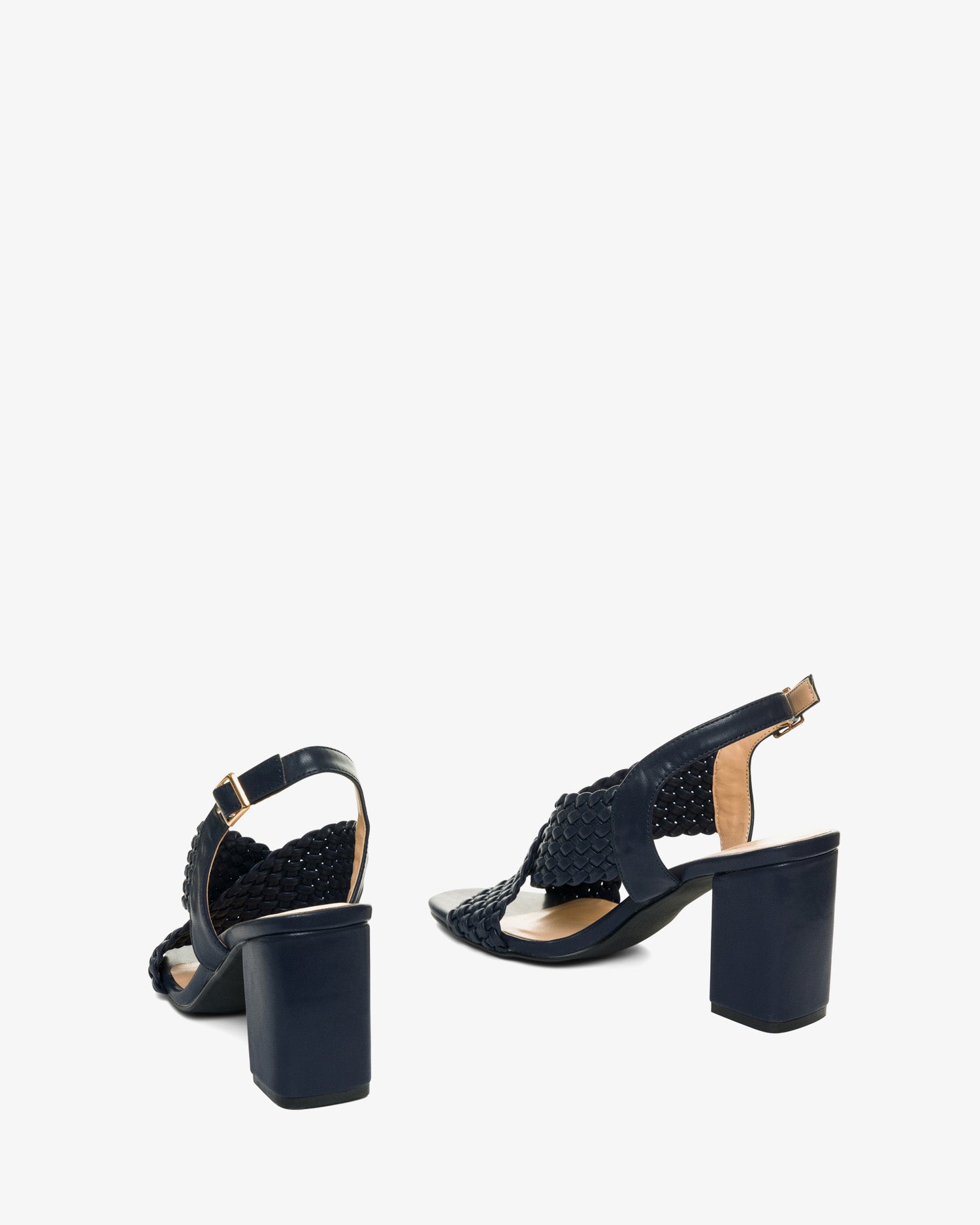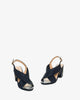 Navy faux leather sandals with a block heel. Slingback design featuring two matching braided wide straps over the instep. Buckled strap closure around the ankle. Round and open toe box. Heel of 3,35" for small sizes from 32 to 35 EU. Heel of 3,74" for large sizes from 42 to 45 EU.