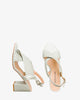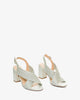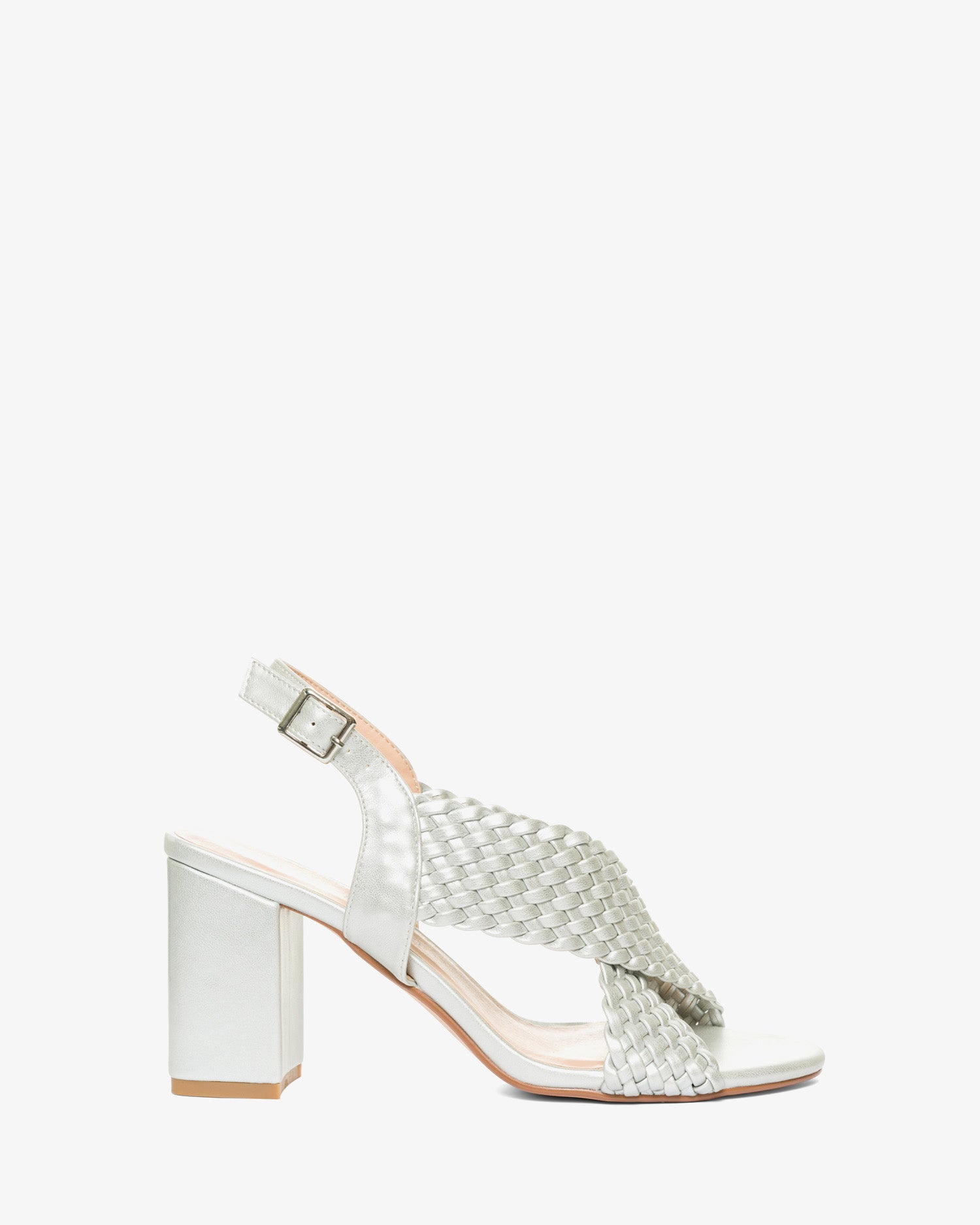 Silver faux leather sandals with a block heel. Slingback design featuring two matching braided wide straps over the instep. Buckled strap closure around the ankle. Round and open toe box. Heel of 3,35" for small sizes from 32 to 35 EU. Heel of 3,74" for large sizes from 42 to 45 EU.