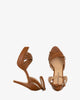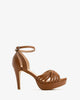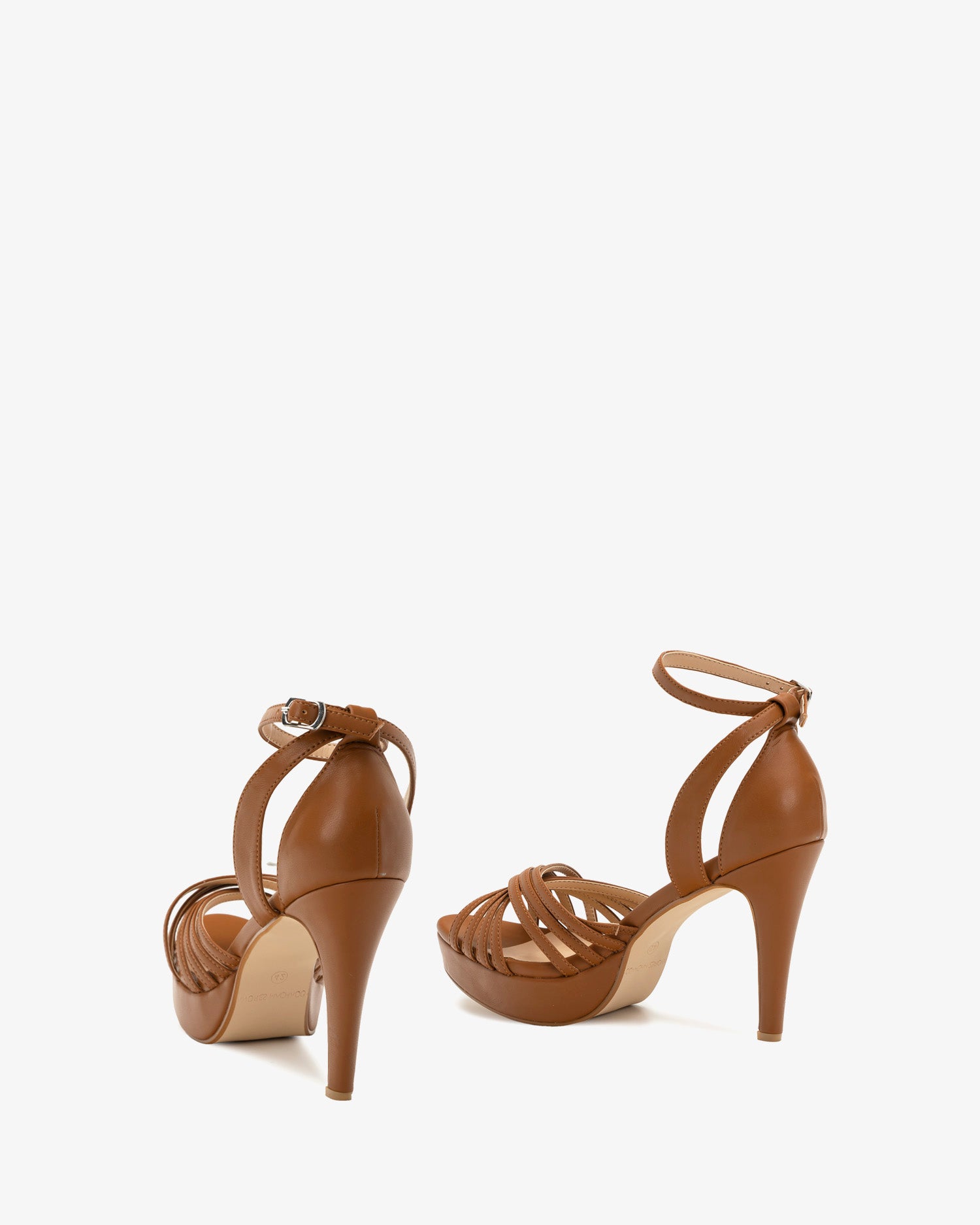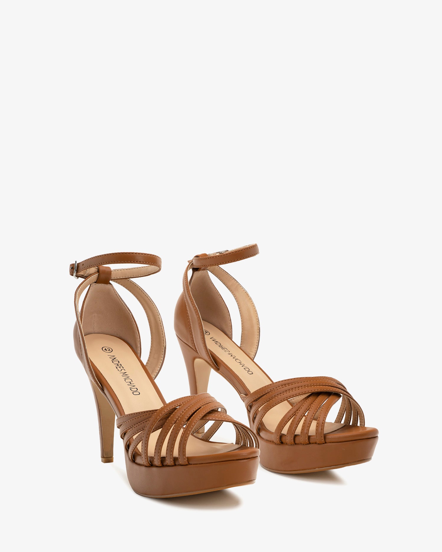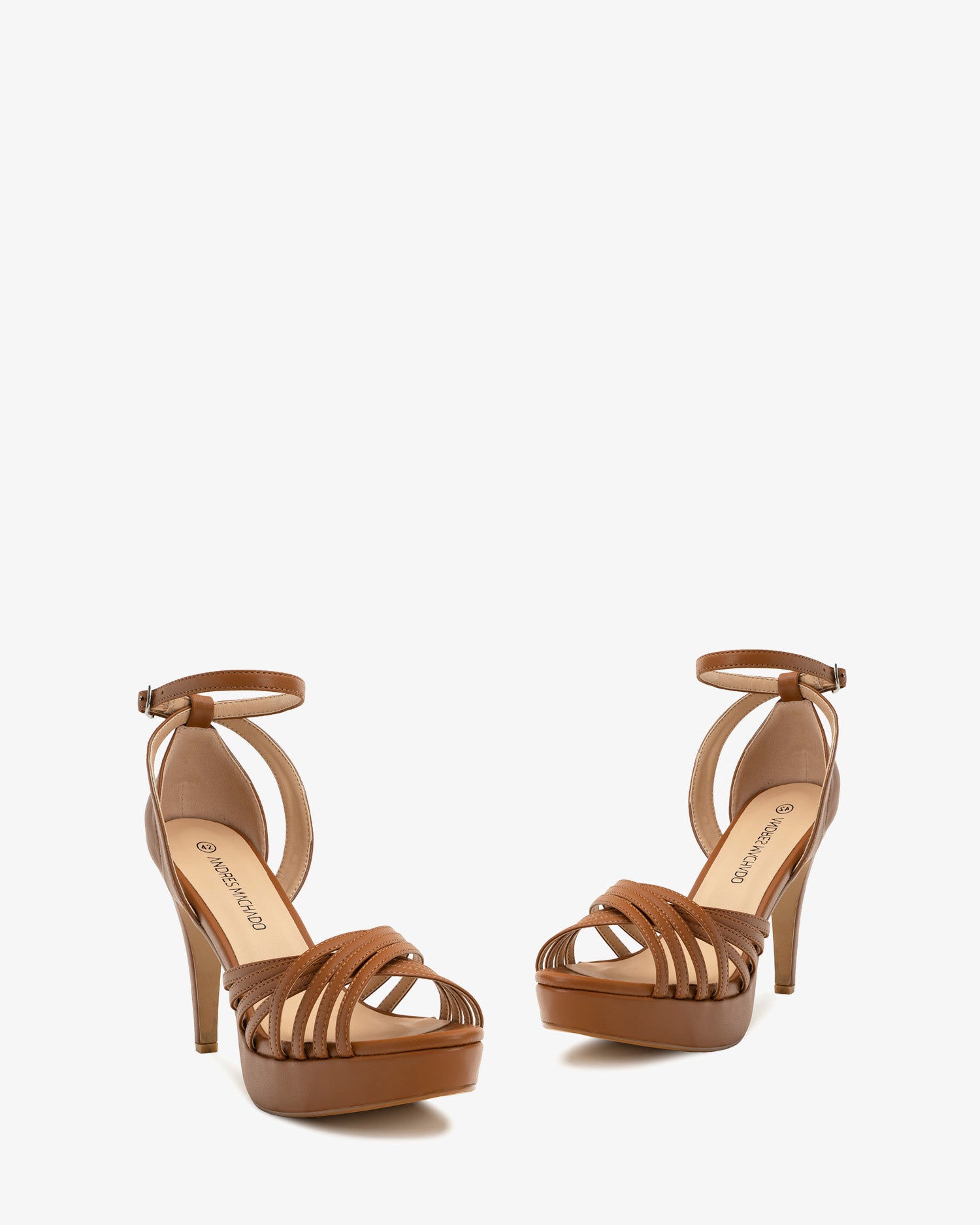 Brown faux leather platform sandals designed with multiple matching, thin straps crossed over the vamp. Buckled strap closure around the ankle. Counter lined in matching faux leather. Open and poined toe. Heel and platform are lined in matching brown faux leather. The heel is 9.5 cm / 3.74`` high and the platform is 2 cm / 0.78`` high for small sizes from 32 to 35 EU. The heel is 11 cm / 4.33`` high and the platform is 2 cm / 0.78`` high for large sizes from 42 to 45 EU.