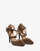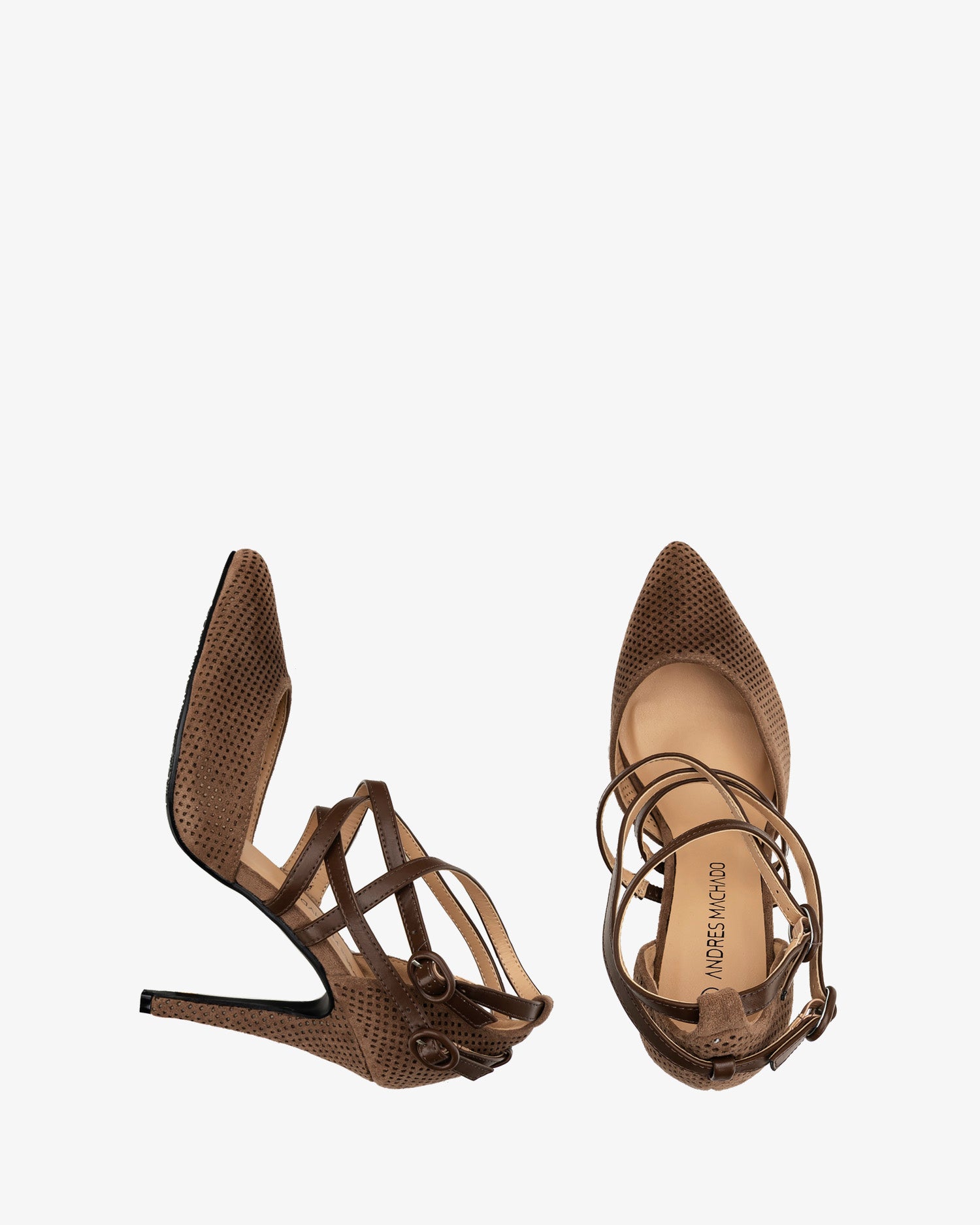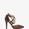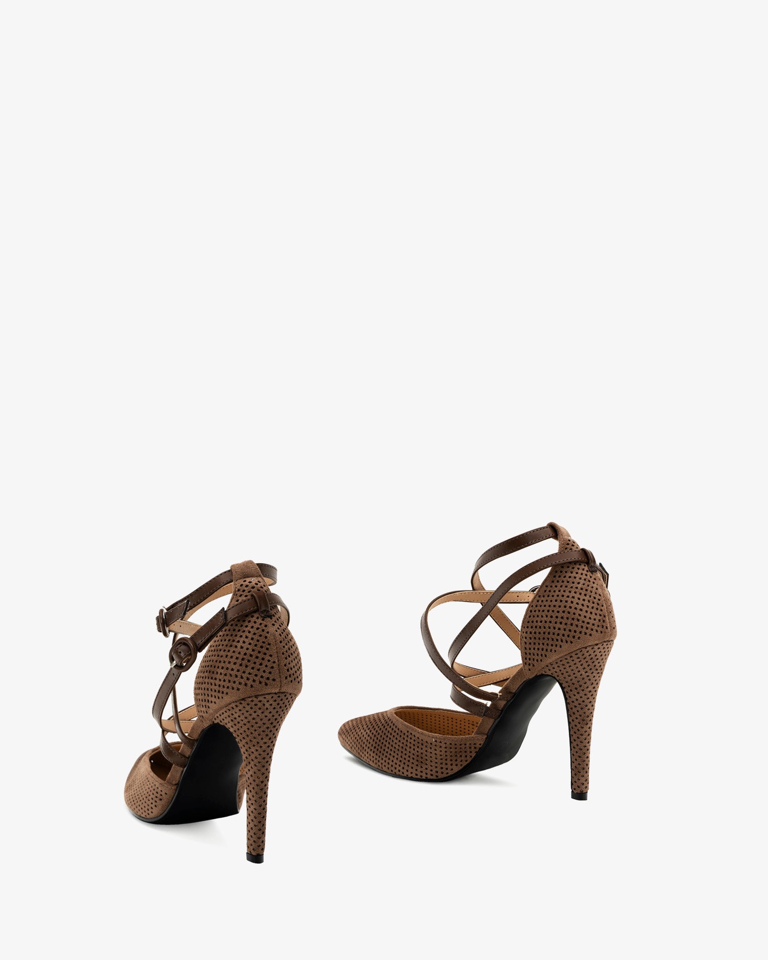 Brown faux suede court shoe. Die-cut faux suede leather on the vamp. Multiple brown, thin straps crossed over the instep. Double buckled strap closure on the side. Closed, pointed toe. Counter lined in matching embossed brown faux suede leather. The thin, lined heel is 10 cm / 3.93`` high for small sizes from 32 to 35 EU. The heel is 11 cm / 4.33`` high for large sizes from 42 to 45 EU.