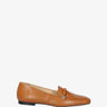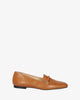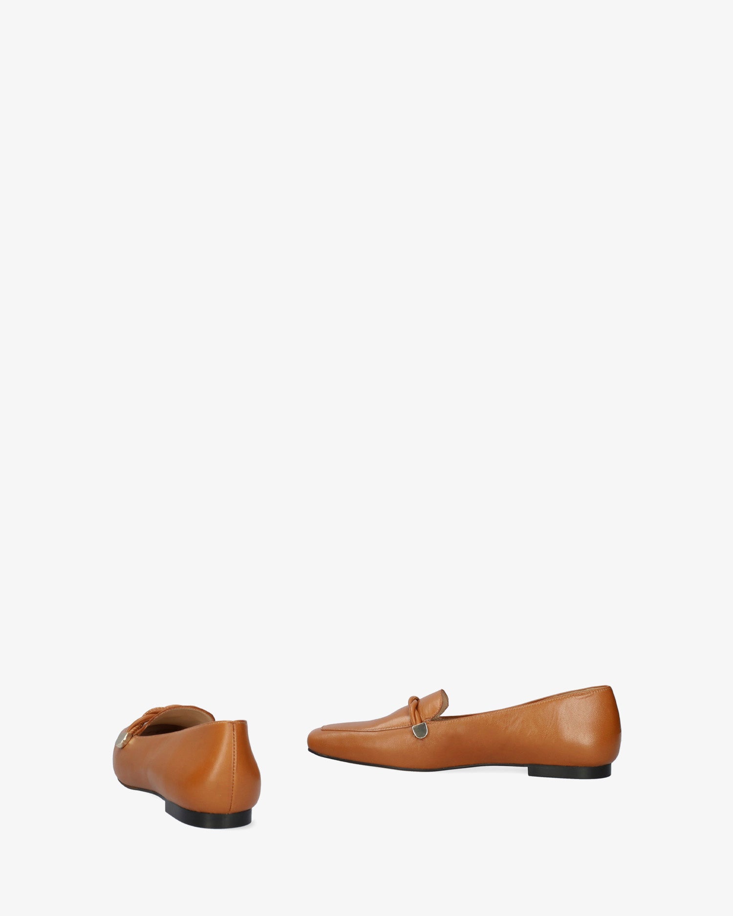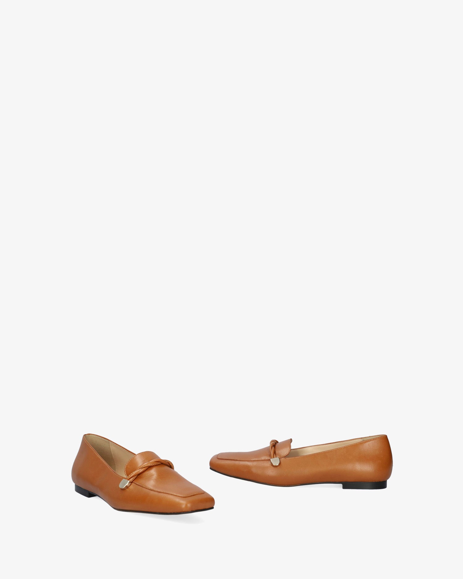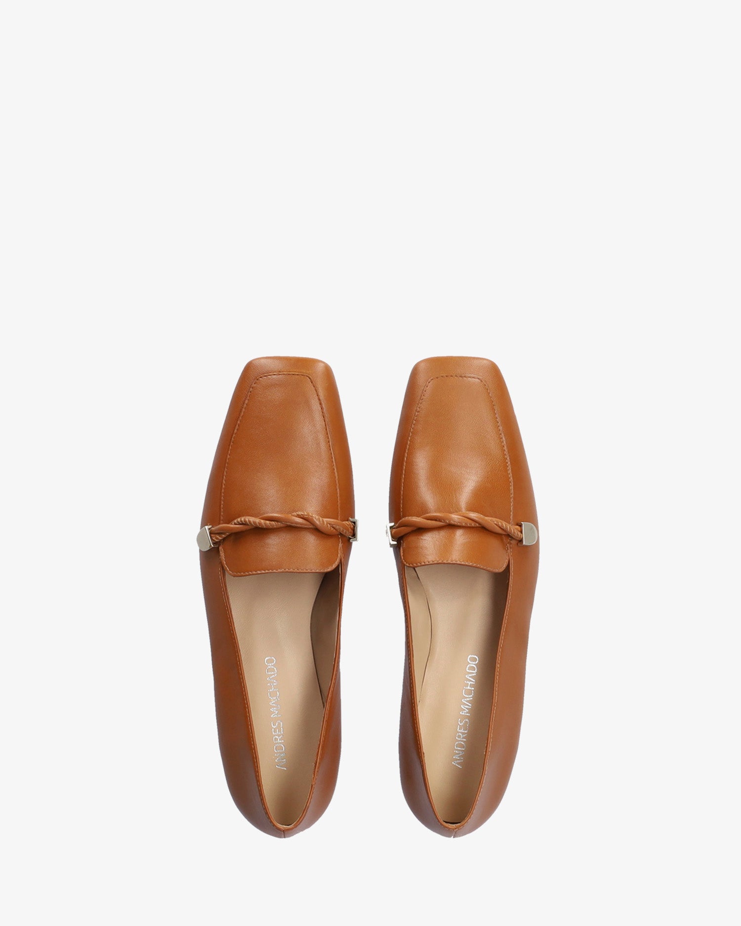 Brown leather loafers featuring a decorative twisted leather strap over the vamp, finished with metallic appliques on the sides. Decorative stitching. Beige leather inner lining. Finished in a square toe box. Available from size 32 to 45 EU. Made in Spain.