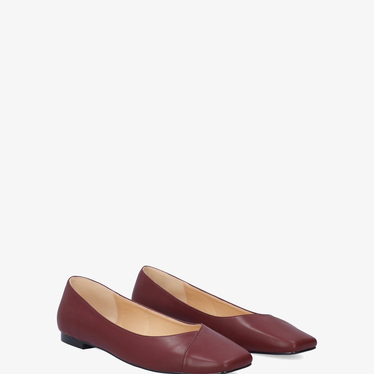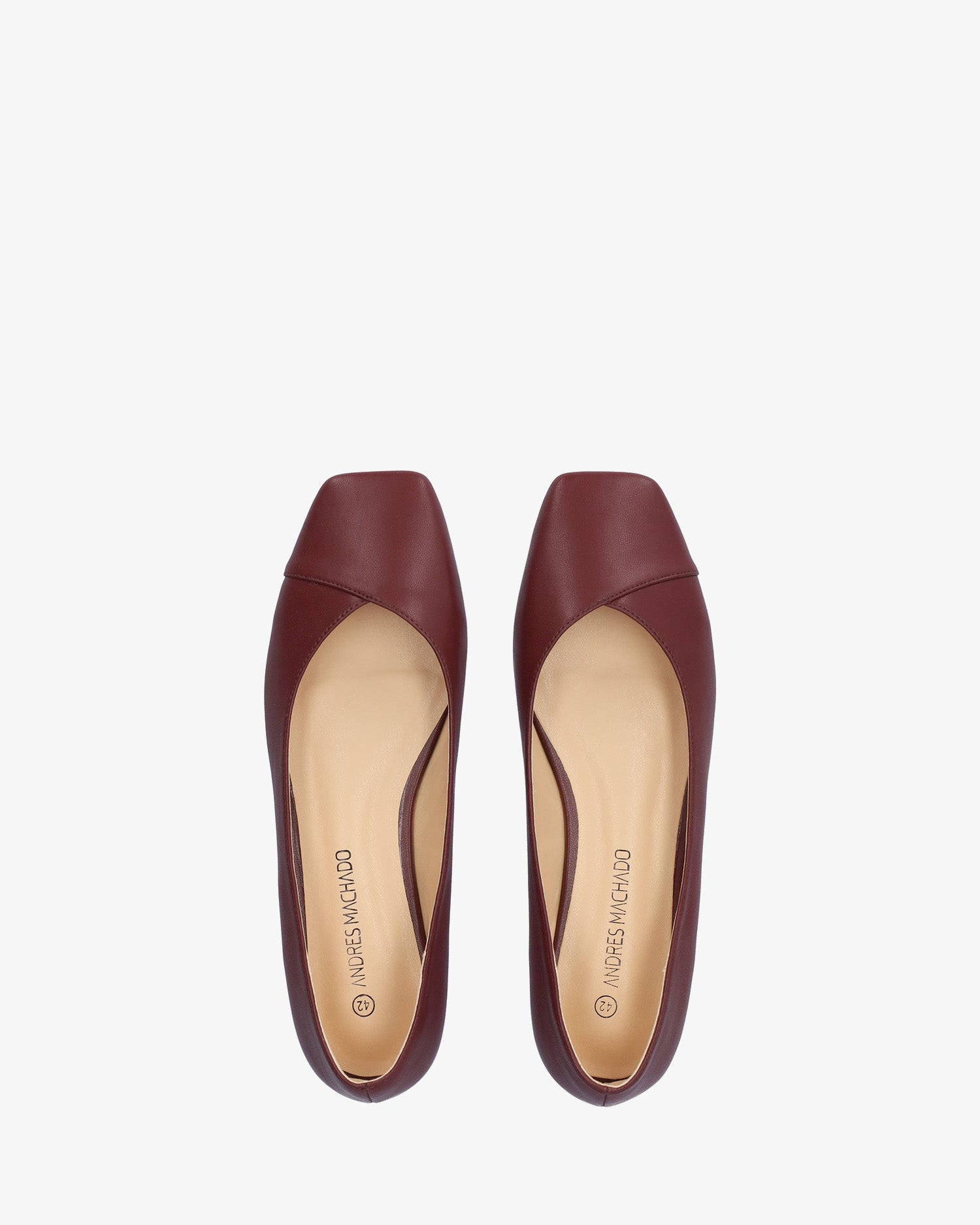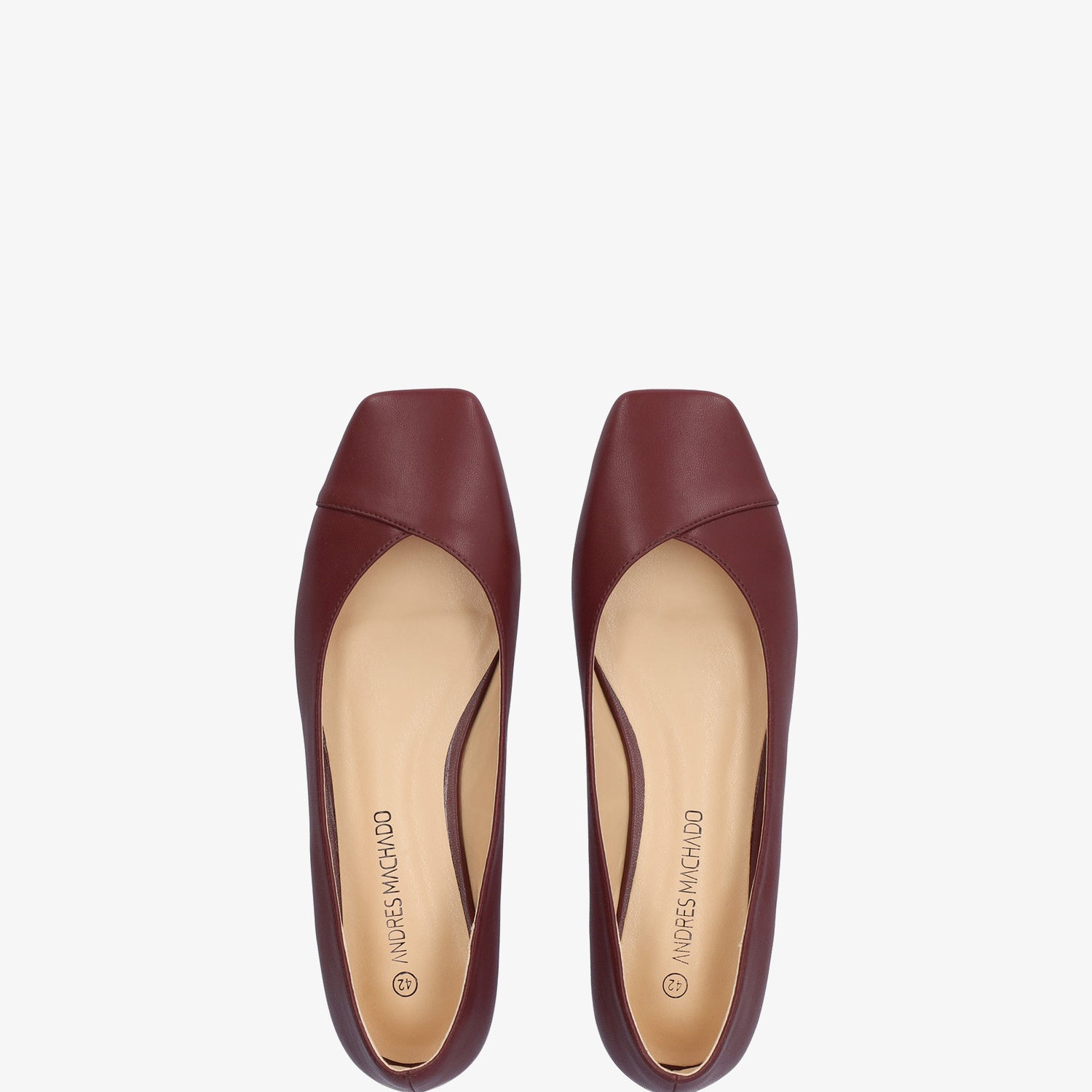 Burgundy faux leather ballerina finished in a squared toe with decorative crossed matching straps. Tone-on-tone stitching over the toe. Mini-block heel for large sizes from 42 to 45 EU. This model fits small, we recommend taking one size larger than usual.
