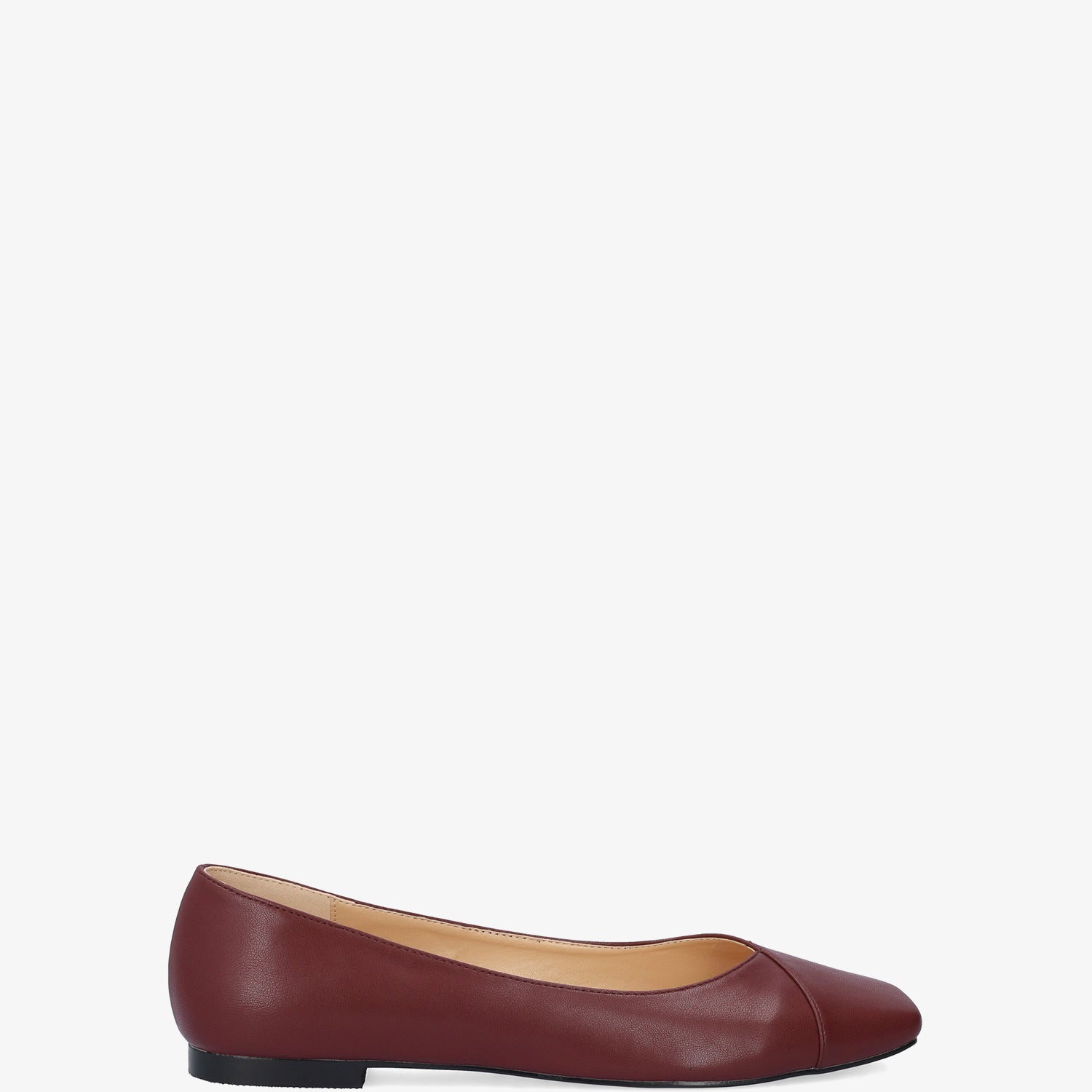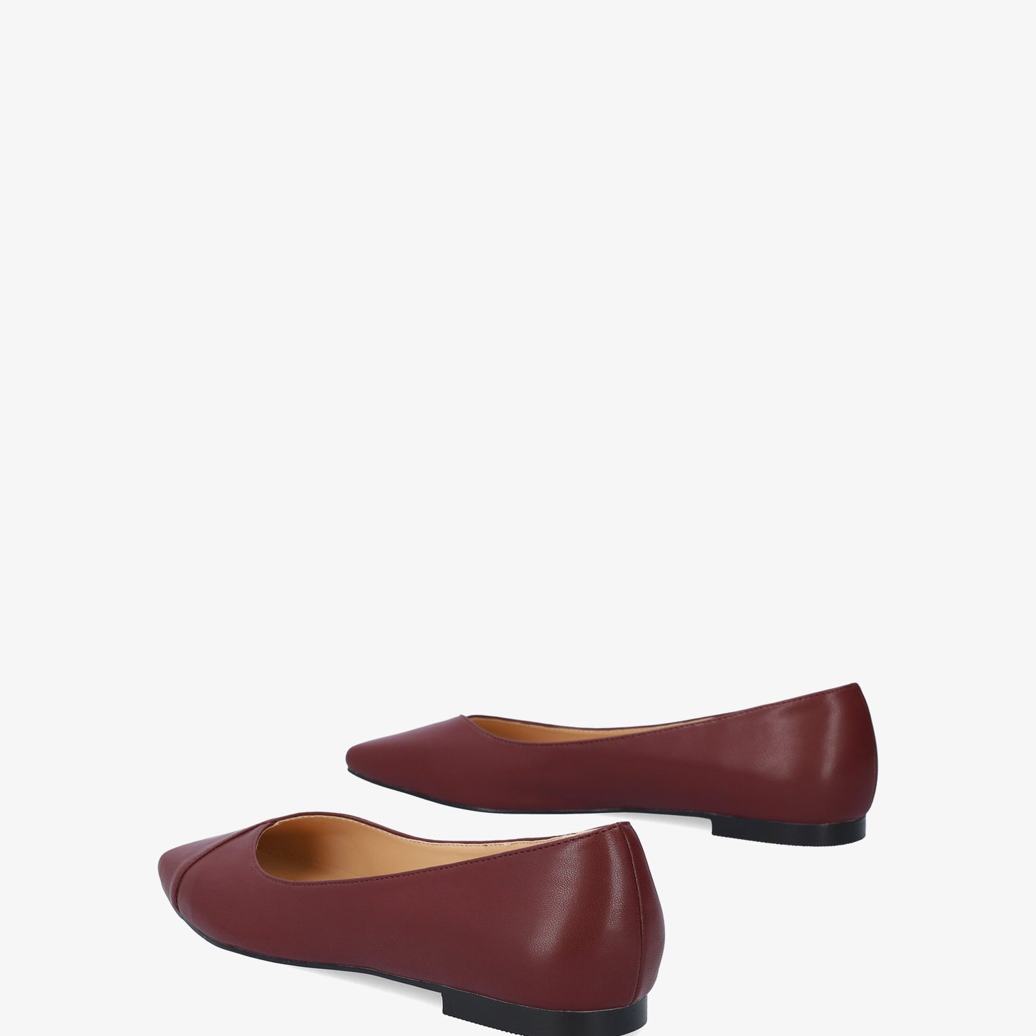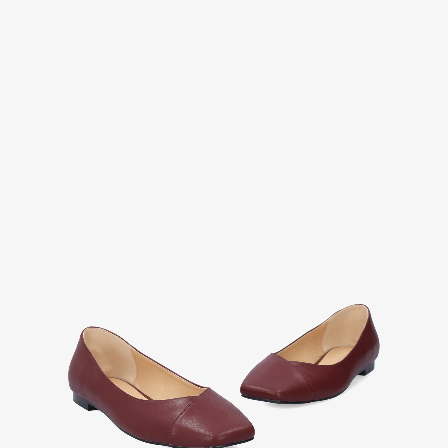Burgundy faux leather ballerina finished in a squared toe with decorative crossed matching straps. Tone-on-tone stitching over the toe. Mini-block heel for large sizes from 42 to 45 EU. This model fits small, we recommend taking one size larger than usual.