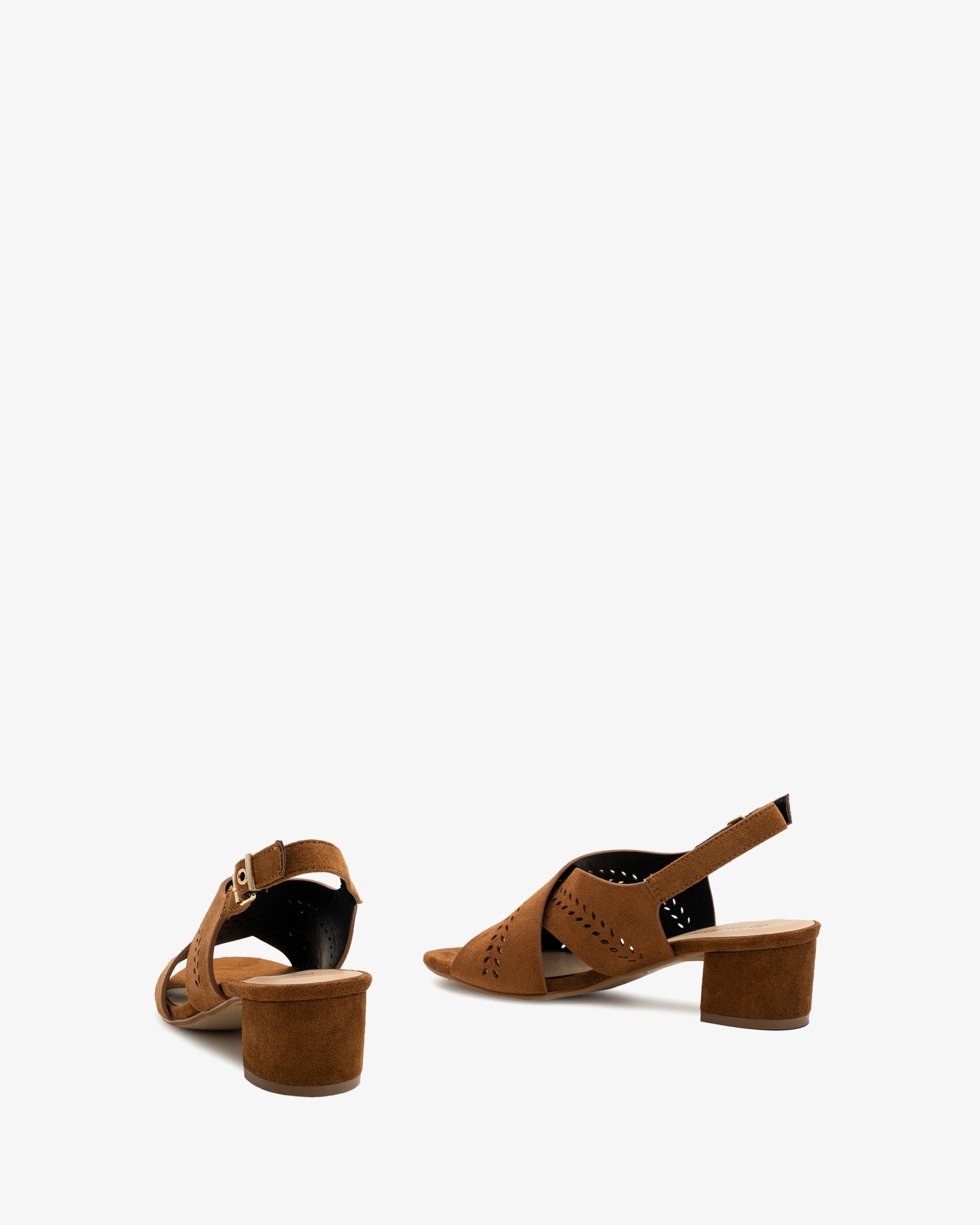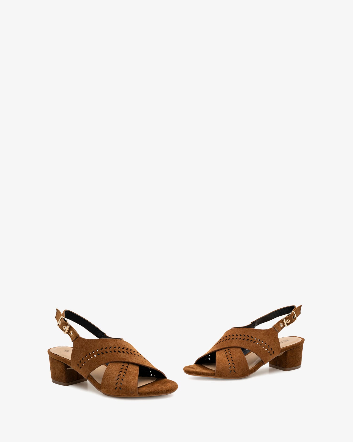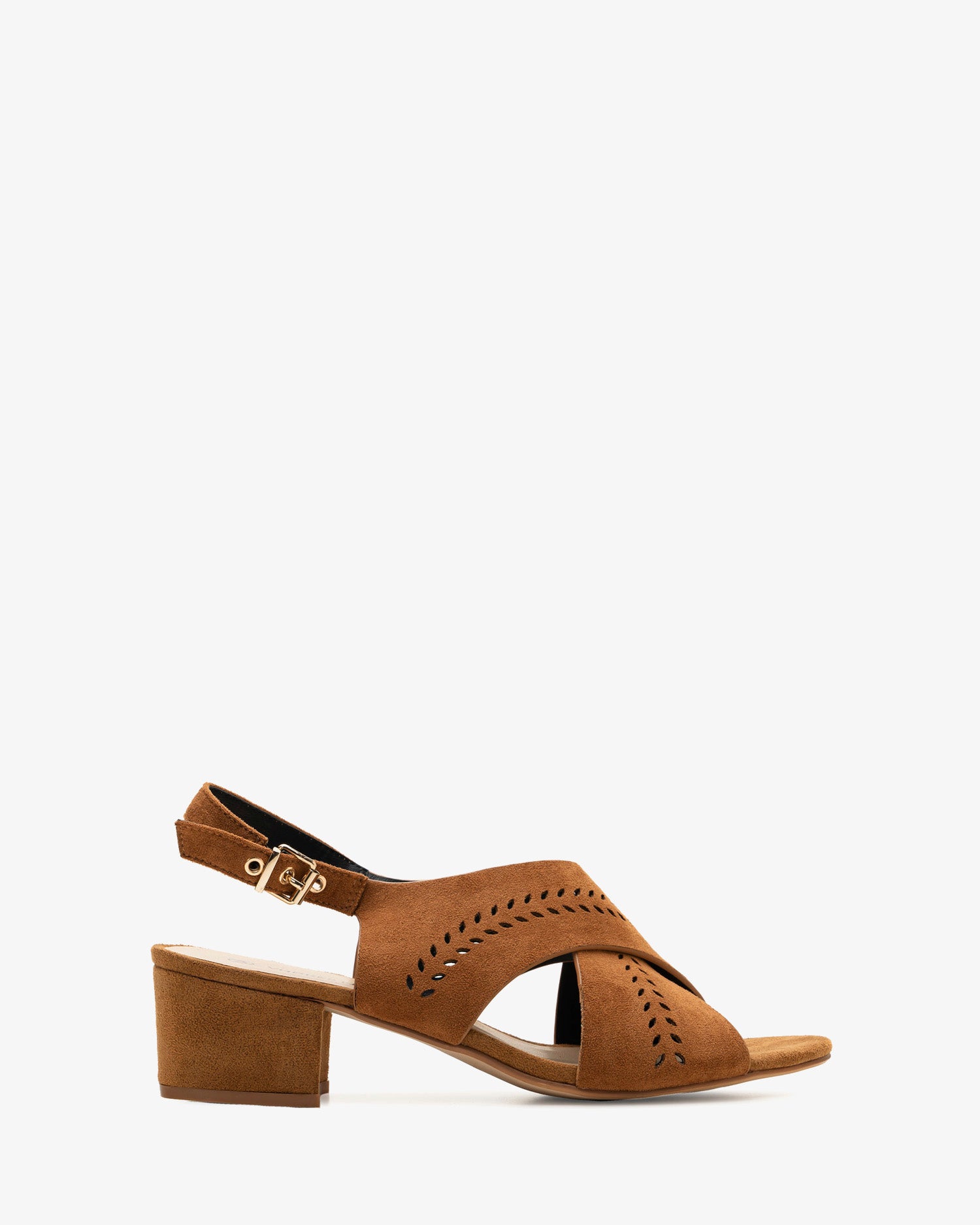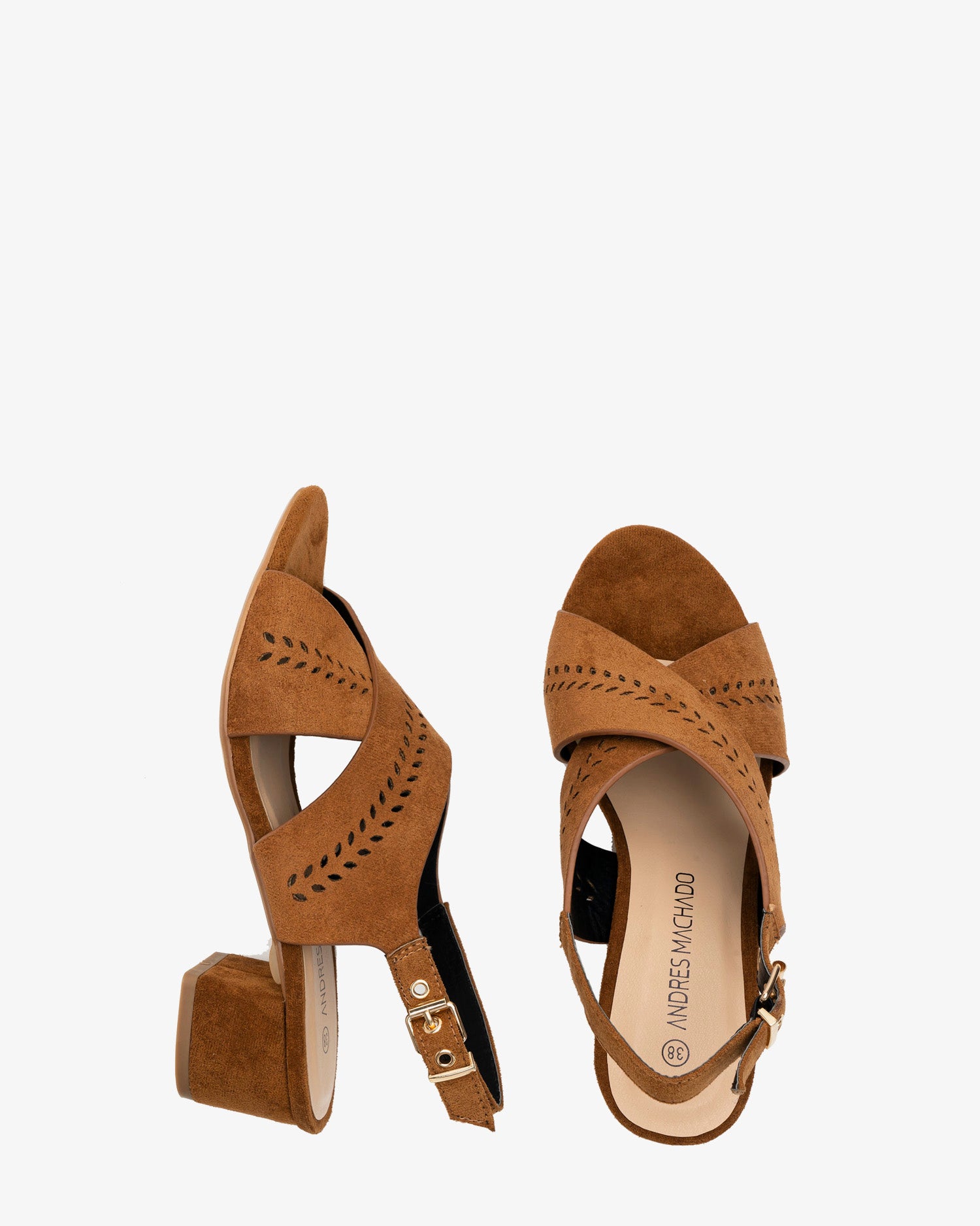 Camel embossed faux leather sandals designed with matching, wide straps crossed over the vamp with an embossed leaf detail. Matching buckled strap closure around the ankle. Round and elongated toe box. The wide heel is 4,5 cm / 1.77`` high for small sizes from 32 to 35 EU. The wide heel is 5 cm / 1.96`` high for large sizes from 42 to 45 EU.