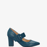 Classic pumps in blue faux leather. Matching thick strap over the insole with a buckle closing. Classic last finished with a fine pointed toe. Square heel lined in tone 2,92" high for small sizes from 32 to 35. Heel 3,12" high for large sizes from 42 to 45.