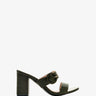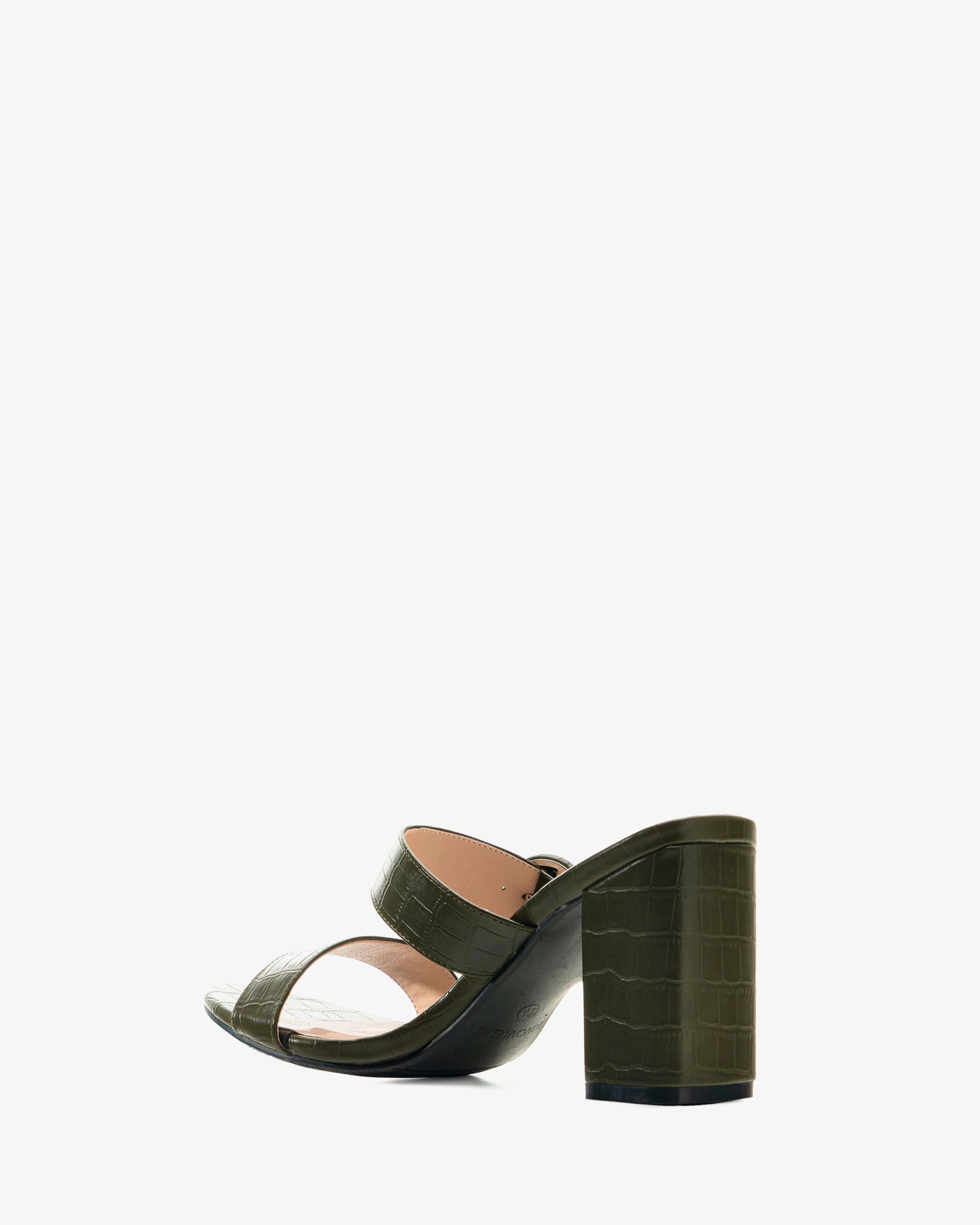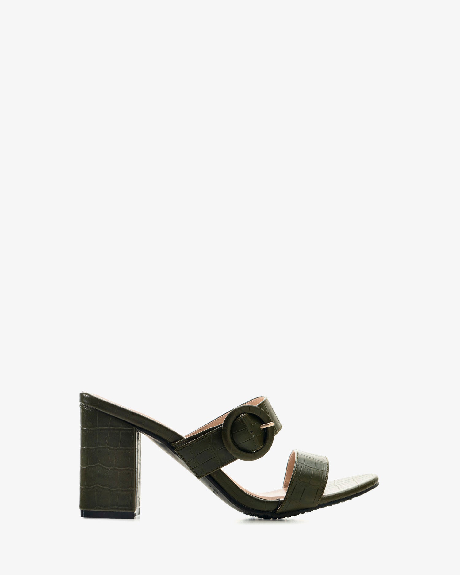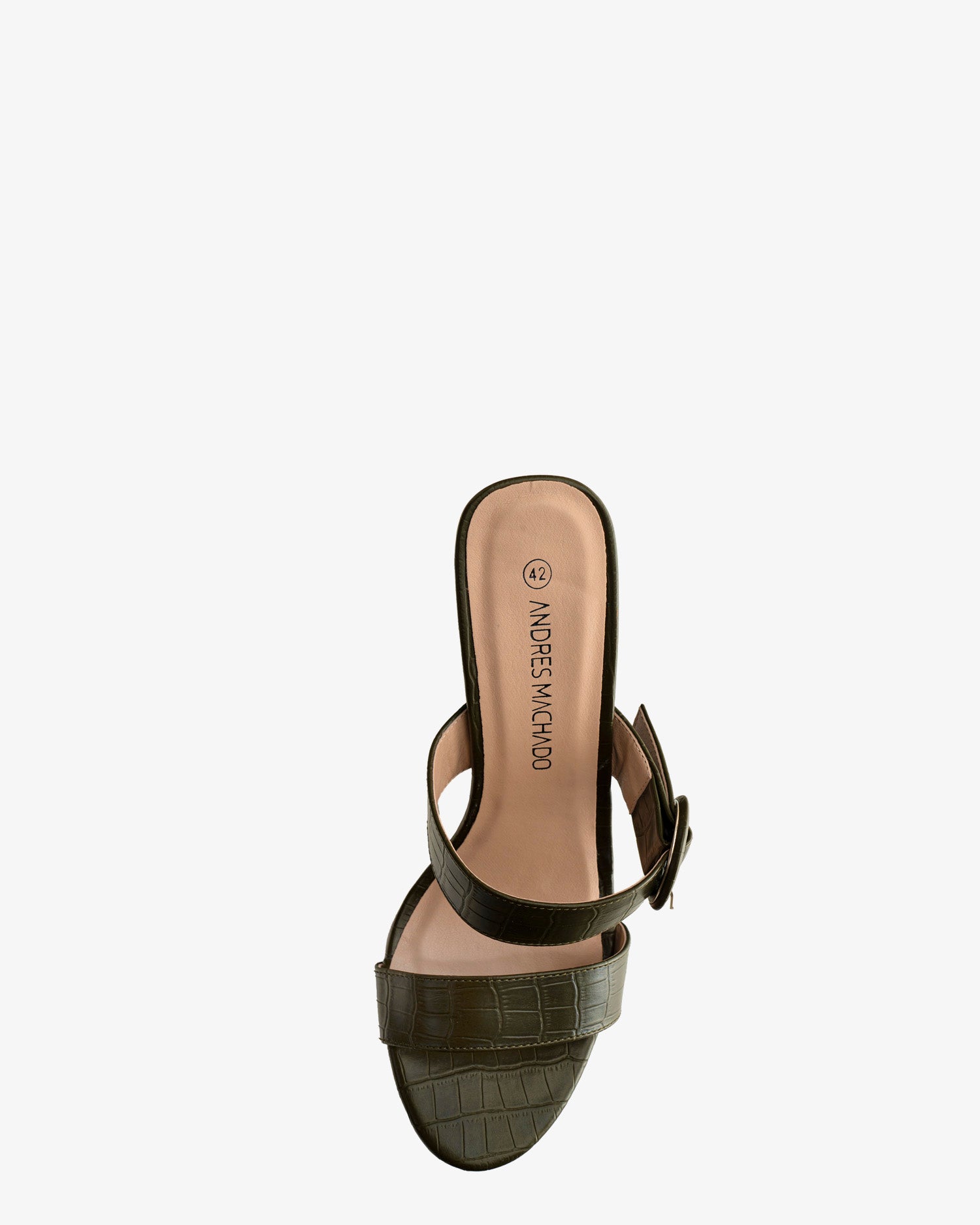 Sandals made of croc embossed faux leather in Olive Green colour. The upper is composed of one frontal horizontal band, and another one likewise, but located over the instep. This last band is topped with a decorative rounded buckle covered in the same material. Matching lined block heel of 3.35" / 8.5 cm of height for the small sizes UK 0.5 to 2.5 / EU 32 to 35. Matching lined block heel of 3.74" / 9.5 cm of height for the large sizes from UK 8 to 10.5 / EU 42 to 45.