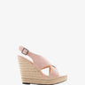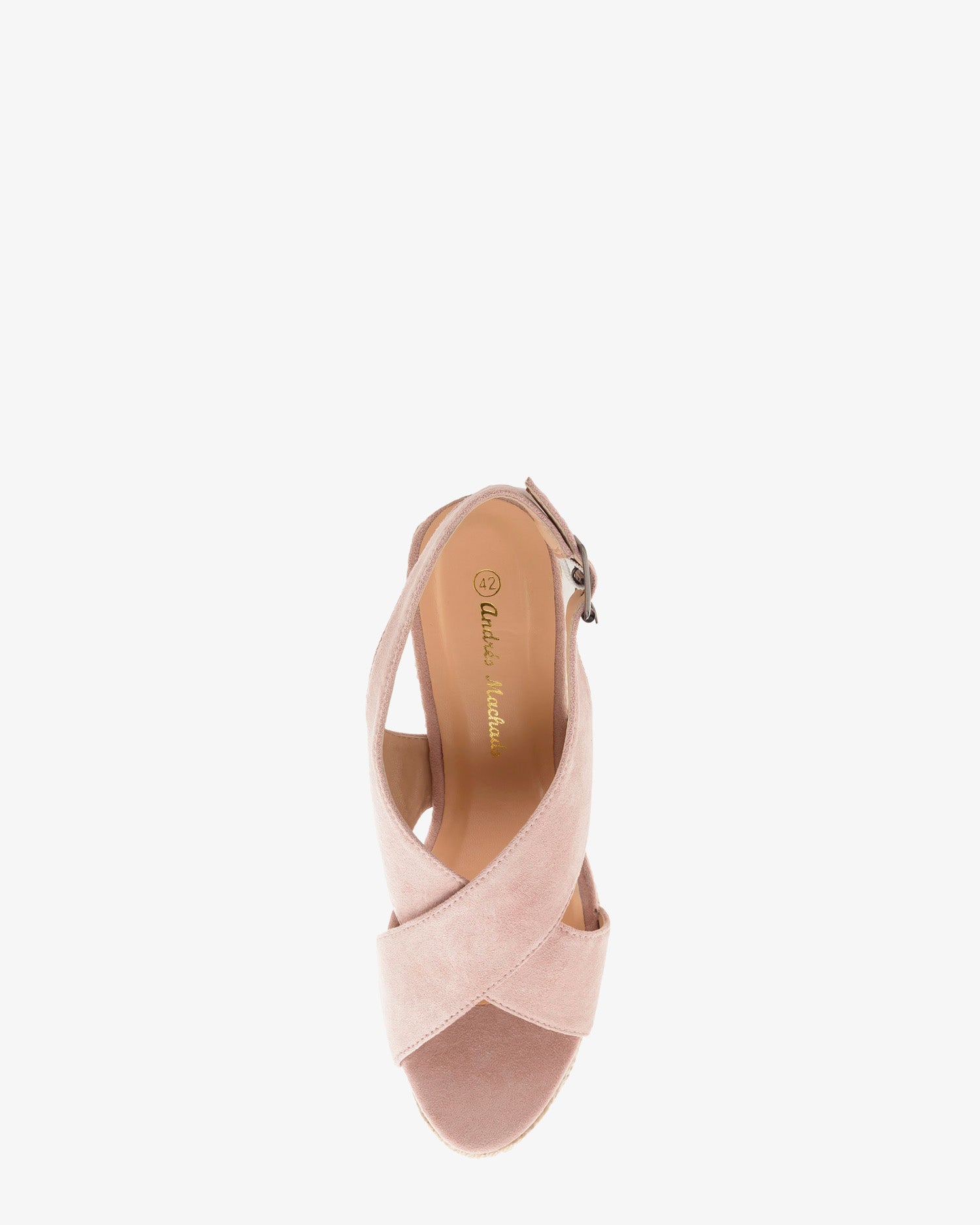 Wedge sandals made of Rose manmade suede. Crossed wide bands over the instep. Slingback buckle closure. Braided jute wedge of 4.33" / 11 cm with front platform of 0.79" / 2 cm for Small sizes from UK 0.5 to 2.5 / EU 32 to 35. Braided jute wedge of 5.51" / 14 cm with front platform of 1.18" / 3 cm for Big sizes from UK 8 to 10.5 / EU 42 to 45.