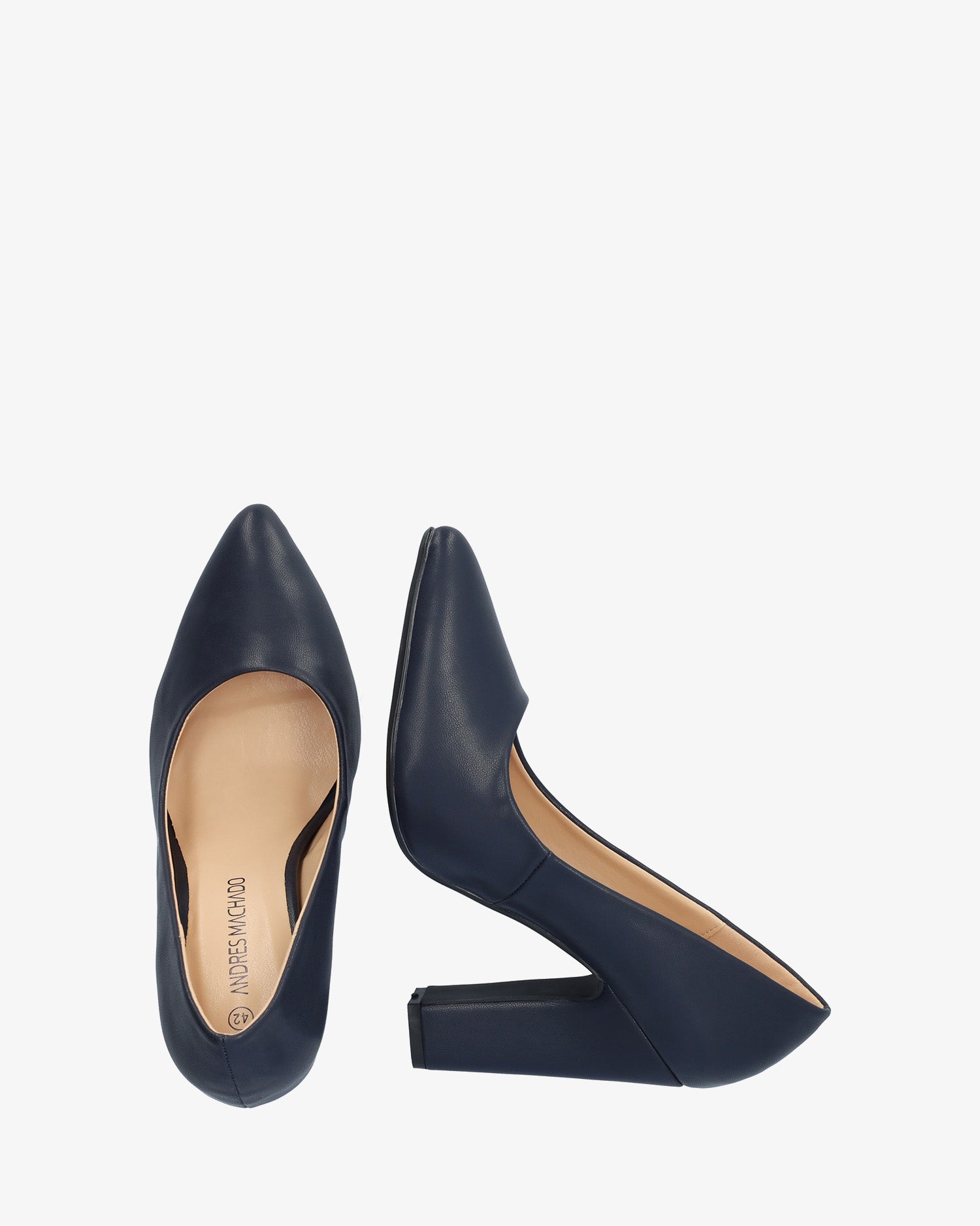 Classic pumps in dark blue faux leather. Classic last and heel. Finished with a fine pointed toe. Square heel lined in tone 9,5 cm high for small sizes from 32 to 35. Heel 11 cm high for large sizes from 42 to 45. This model fits small, we recommend taking one size larger than usual.
