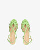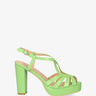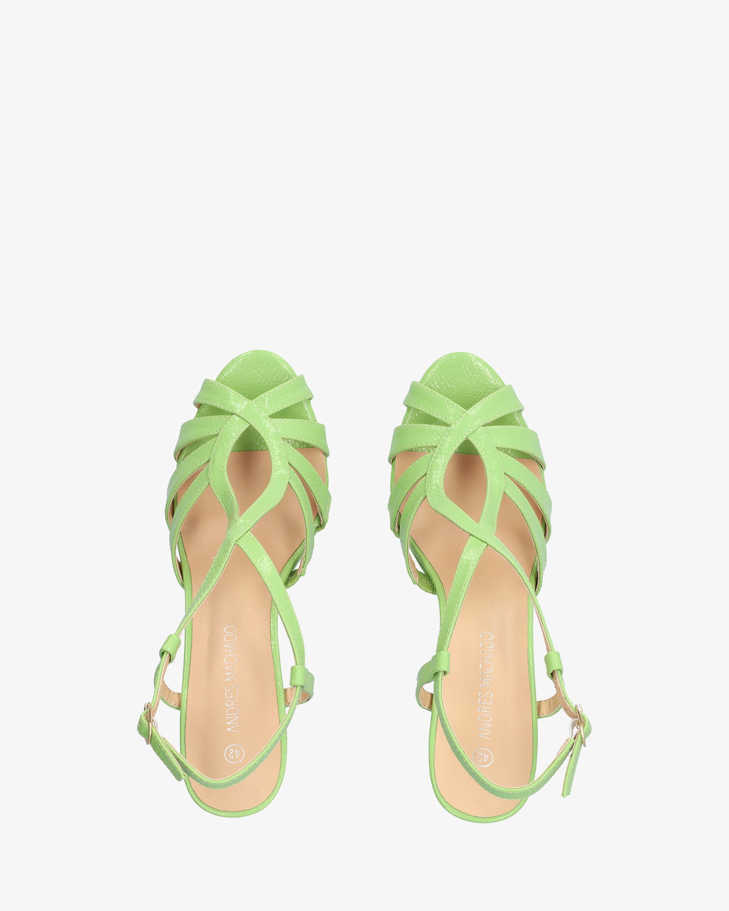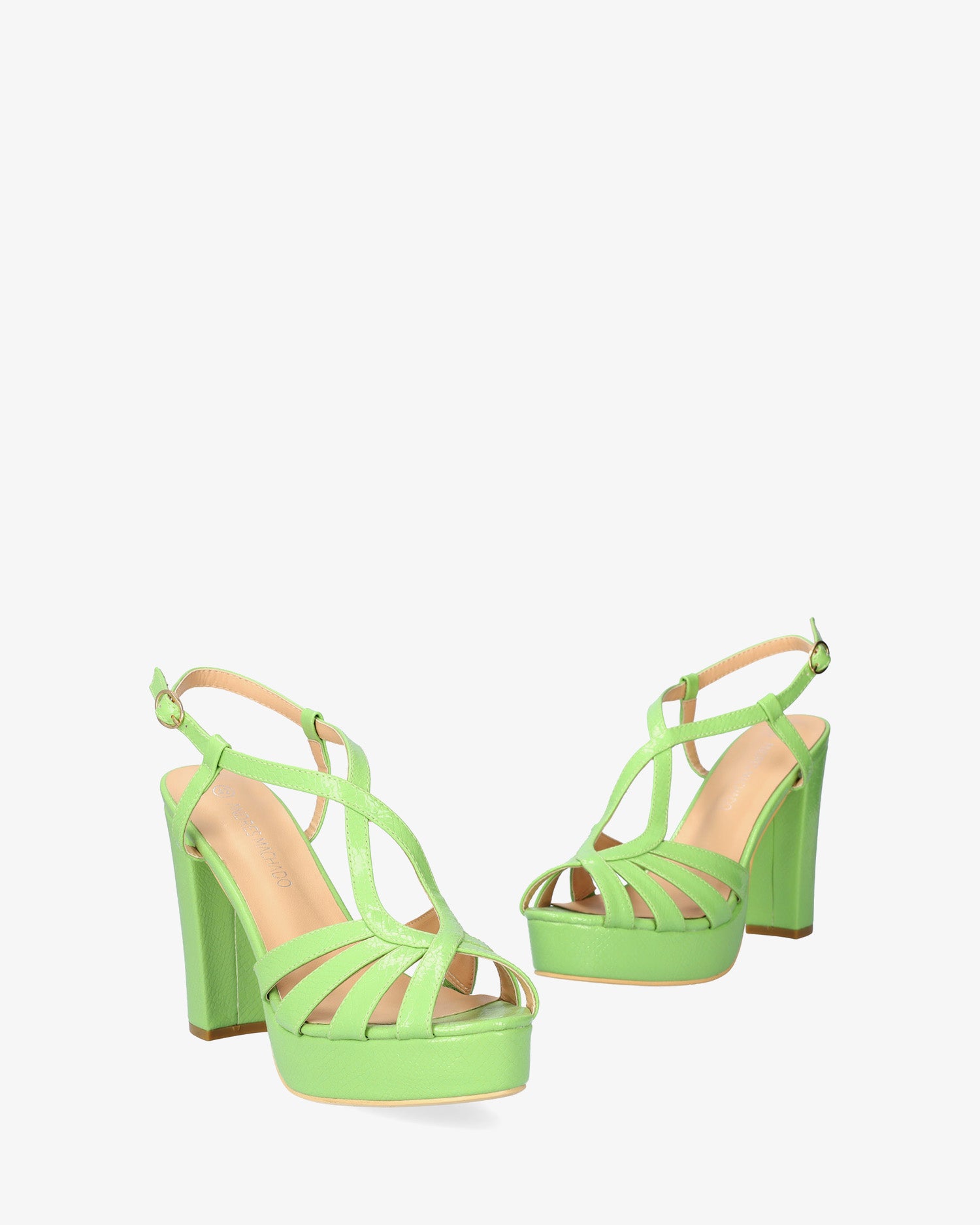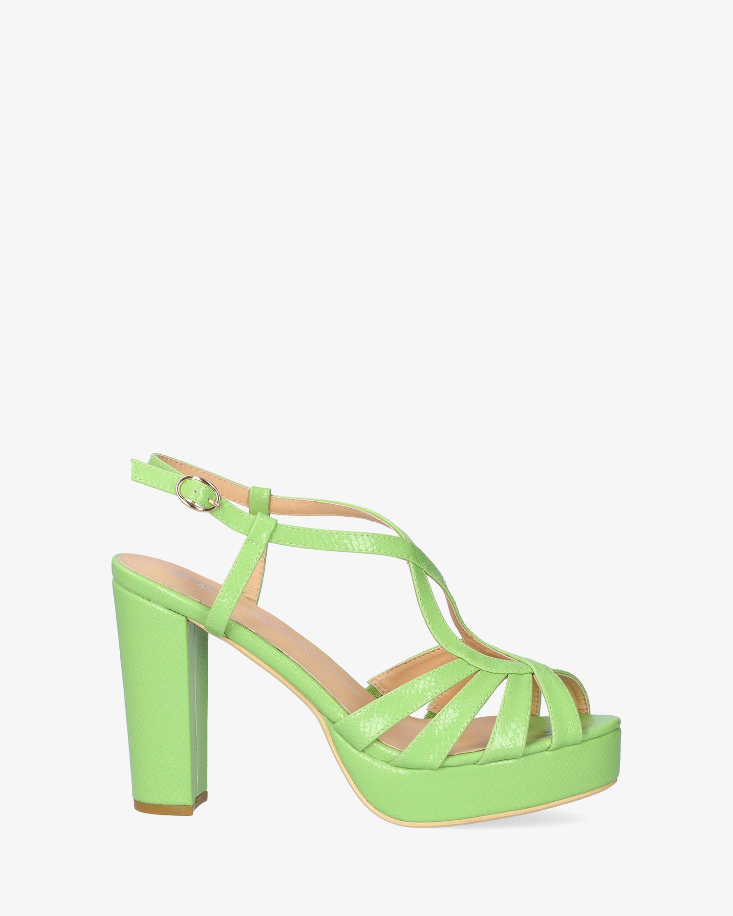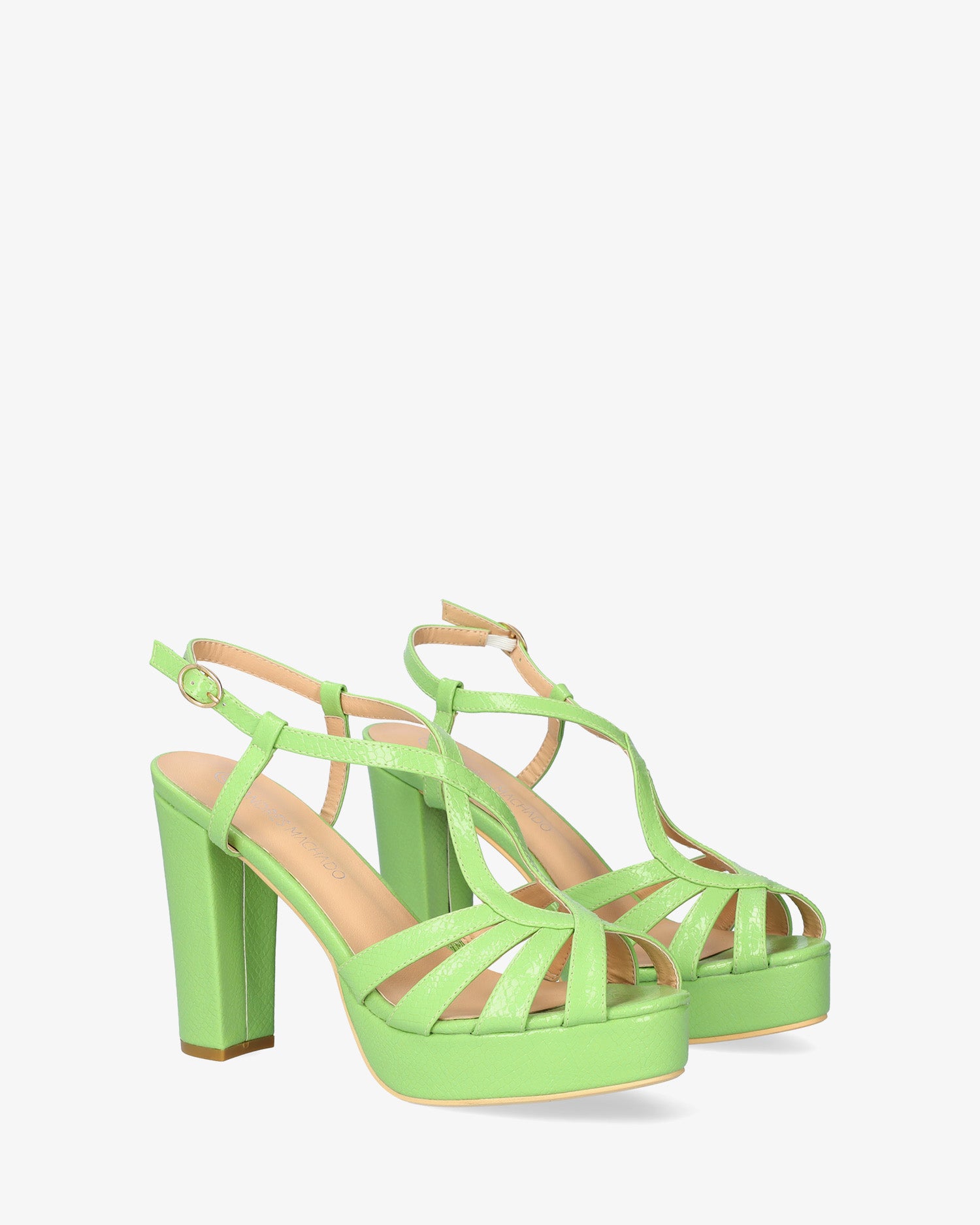 Green embossed faux patent sandlas with wide heel. Slingback design with oval straps over the instep and matching buckled strap closure around the ankle. Round and open toe box. Heel of 4,13"/10,5cm and platform of 1,18"/3cm for small sizes from 32 to 35 EU. Heel of 4,92"/12,5cm and platform of 1,18"/3cm for large sizes from 42 to 45 EU.