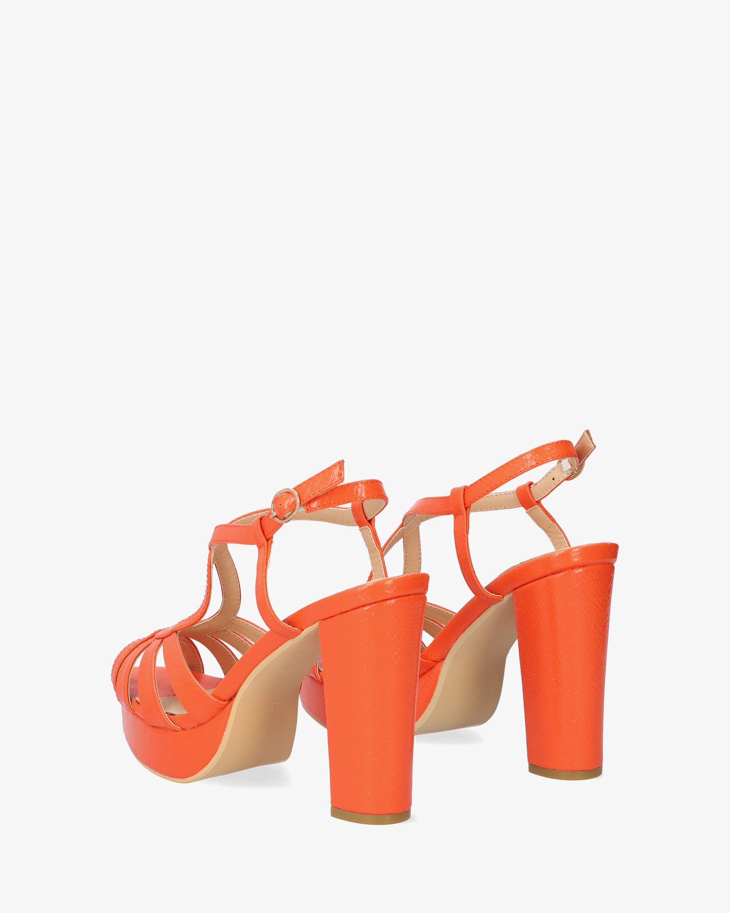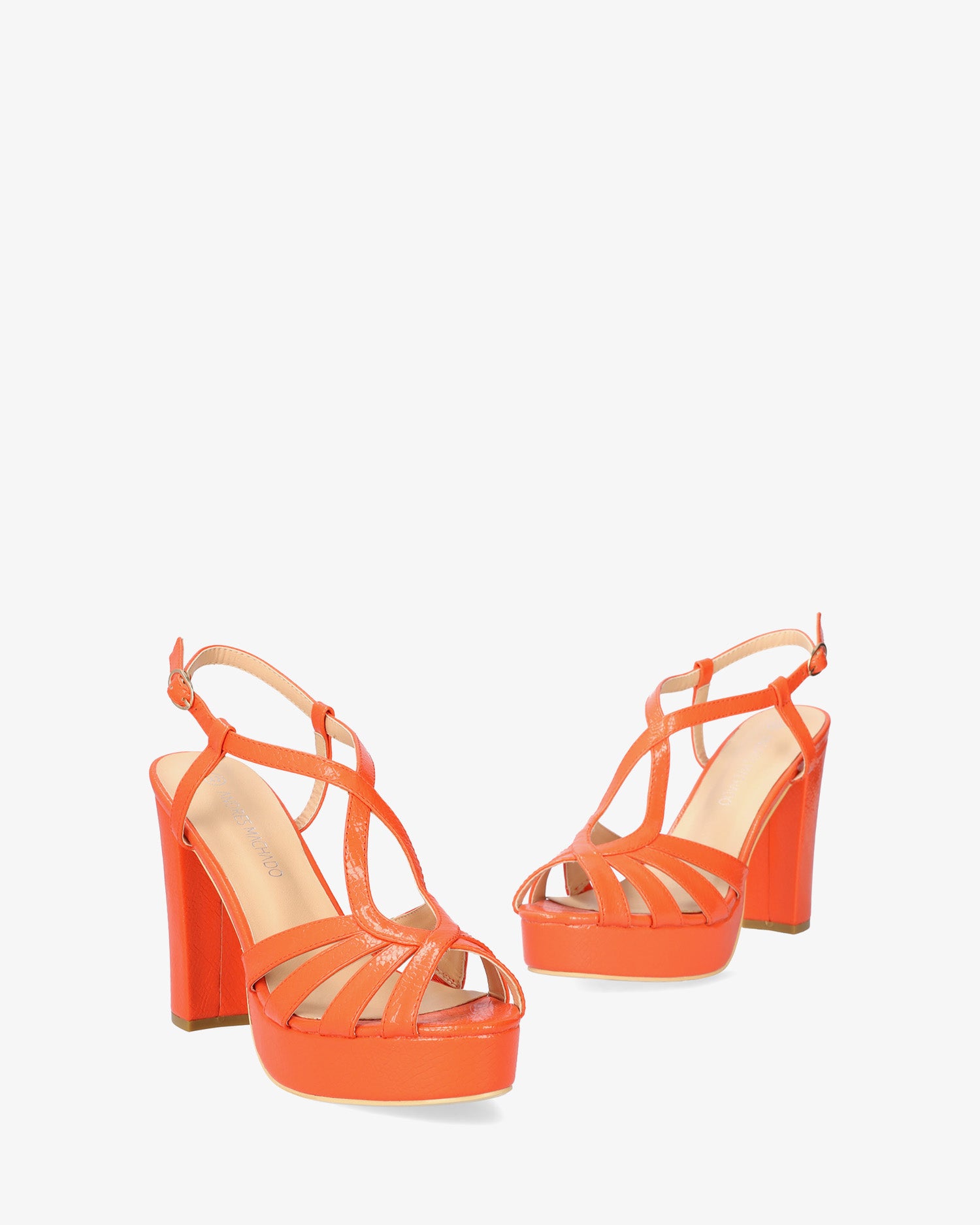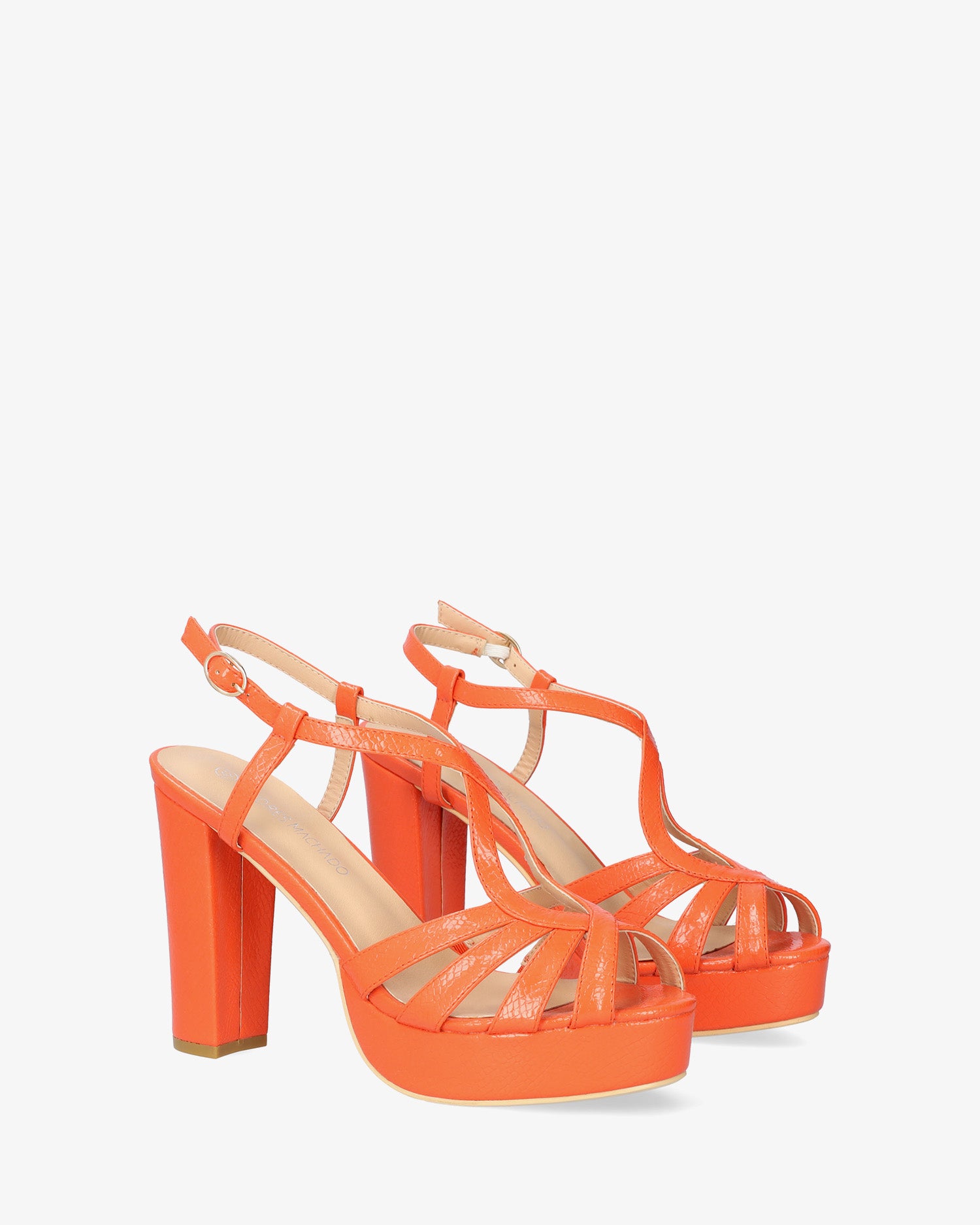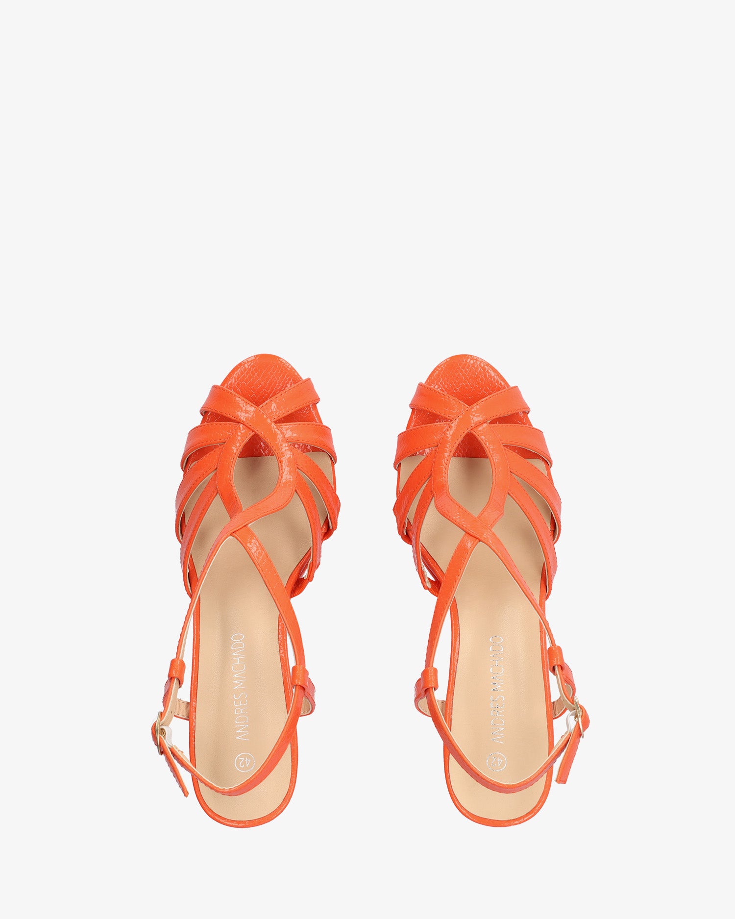 Orange embossed faux patent sandlas with wide heel. Slingback design with oval straps over the instep and matching buckled strap closure around the ankle. Round and open toe box. Heel of 4,13"/10,5cm and platform of 1,18"/3cm for small sizes from 32 to 35 EU. Heel of 4,92"/12,5cm and platform of 1,18"/3cm for large sizes from 42 to 45 EU.