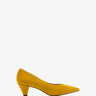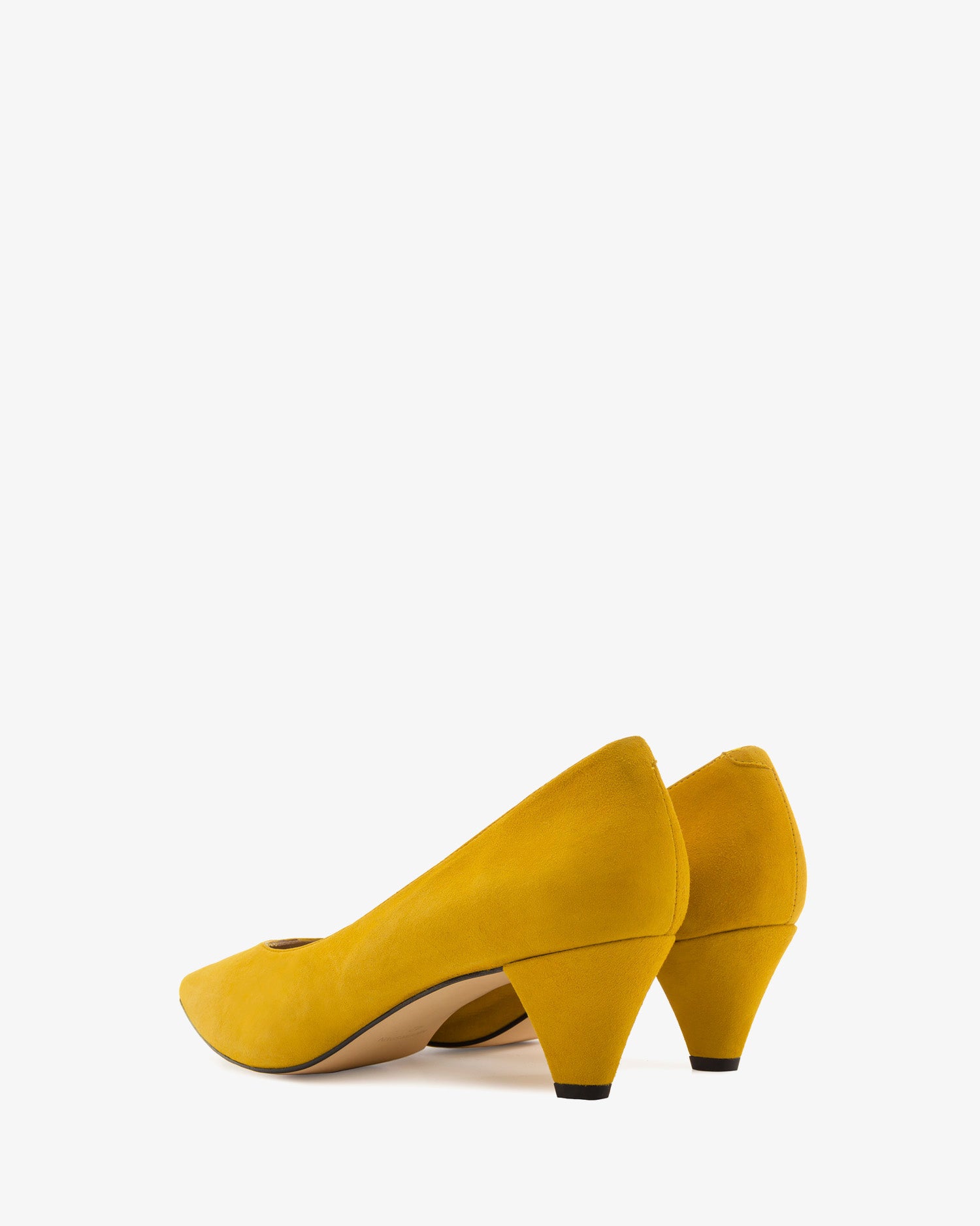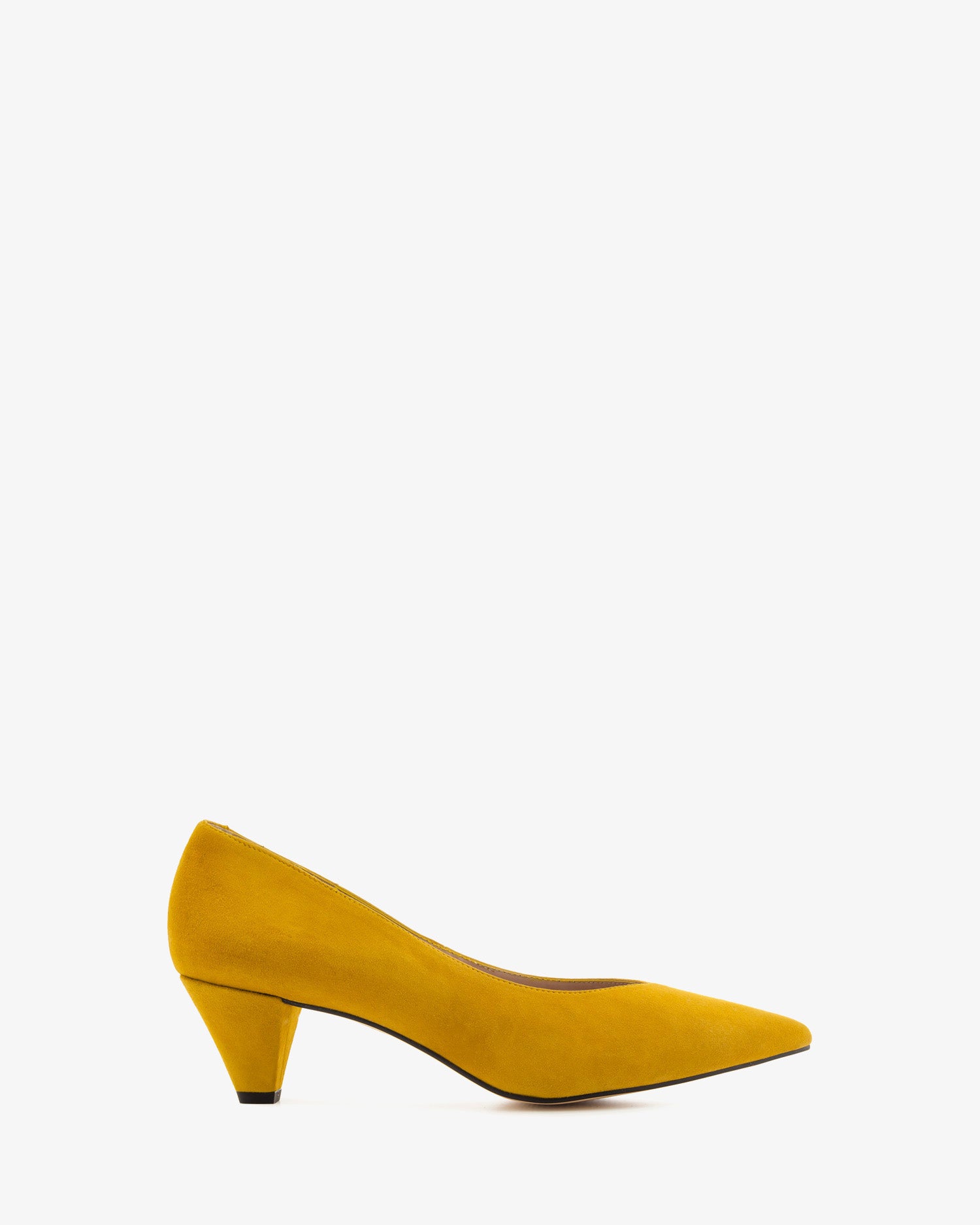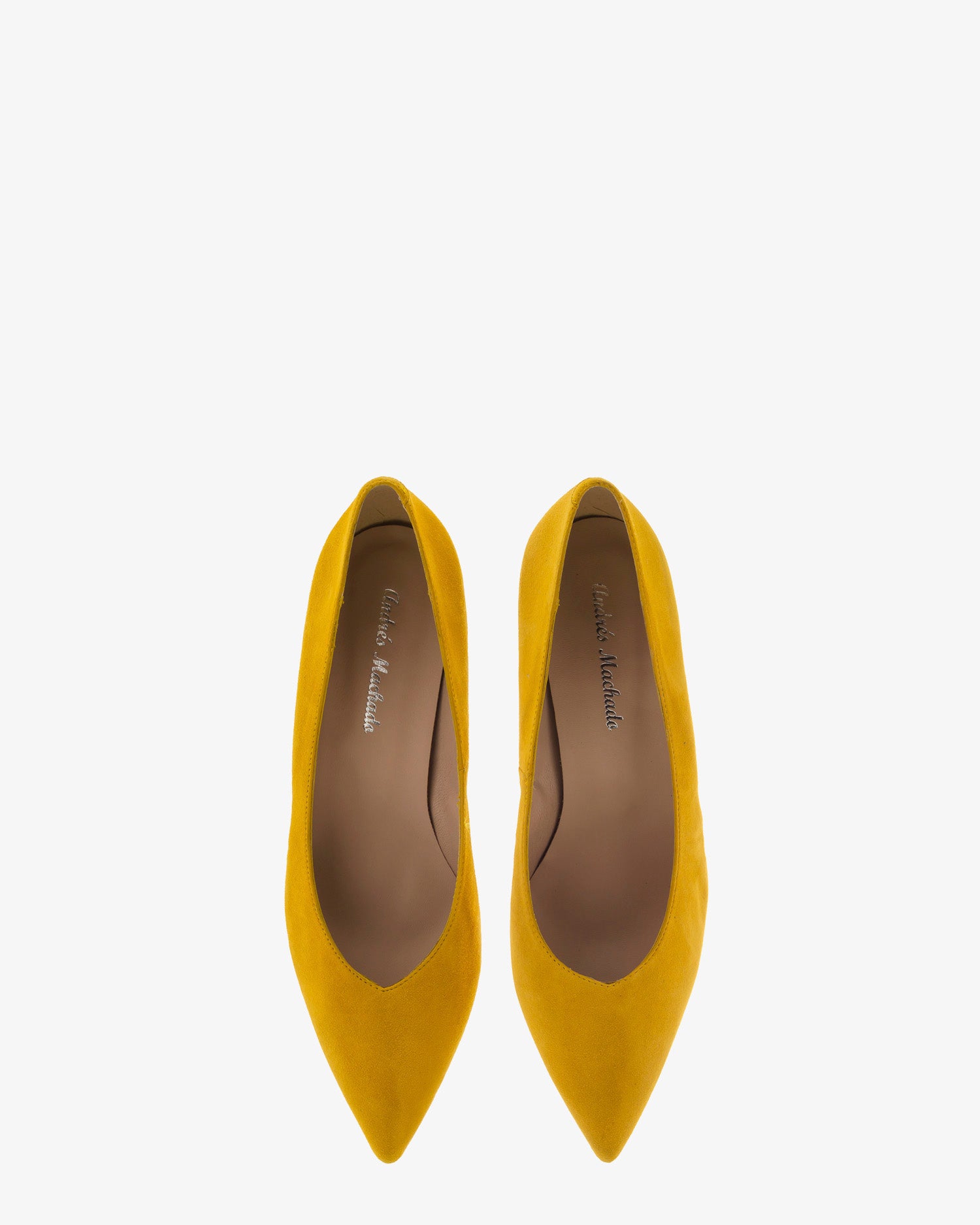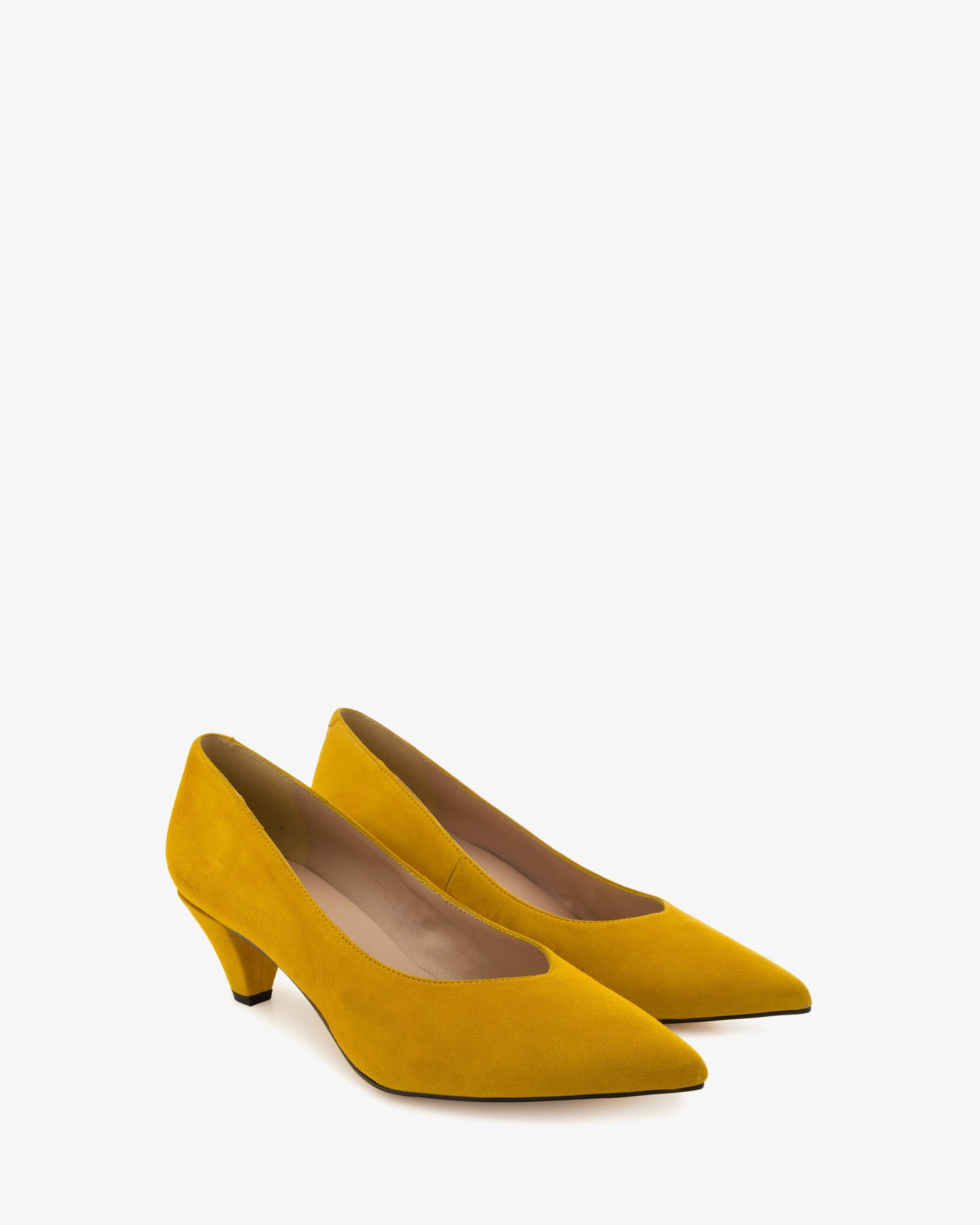 Court shoes made of Mustard coloured genuine suede leather. Fine tip and V-neck upper. Toned-covered mid-heel of 2.36"/ 6 cm for Small sizes from UK 0.5 to 2.5 / EU 32 to 35. Heel of 2.75" / 7 cm for Large sizes from UK 8 to 10.5 / EU 42 to 45. Made in Spain.