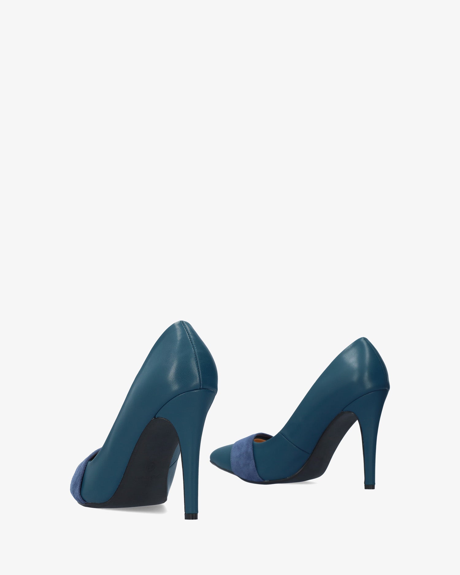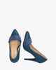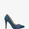 Fine tip stilettos in dark blue faux leather. Matching decorative strap in faux suede. Pointed toe. The thin lined heel measures 3,9" for small sizes from 32 to 35 and 4,68" for big sizes from 42 to 45.