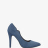 Fine tip stilettos in dark blue faux suede. Decorative ruffled edge detail on both sides of the shoe. Pointed toe. The thin lined heel measures 9,5 cm for small sizes from 32 to 35 and 11 cm for big sizes from 42 to 45.