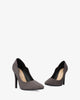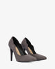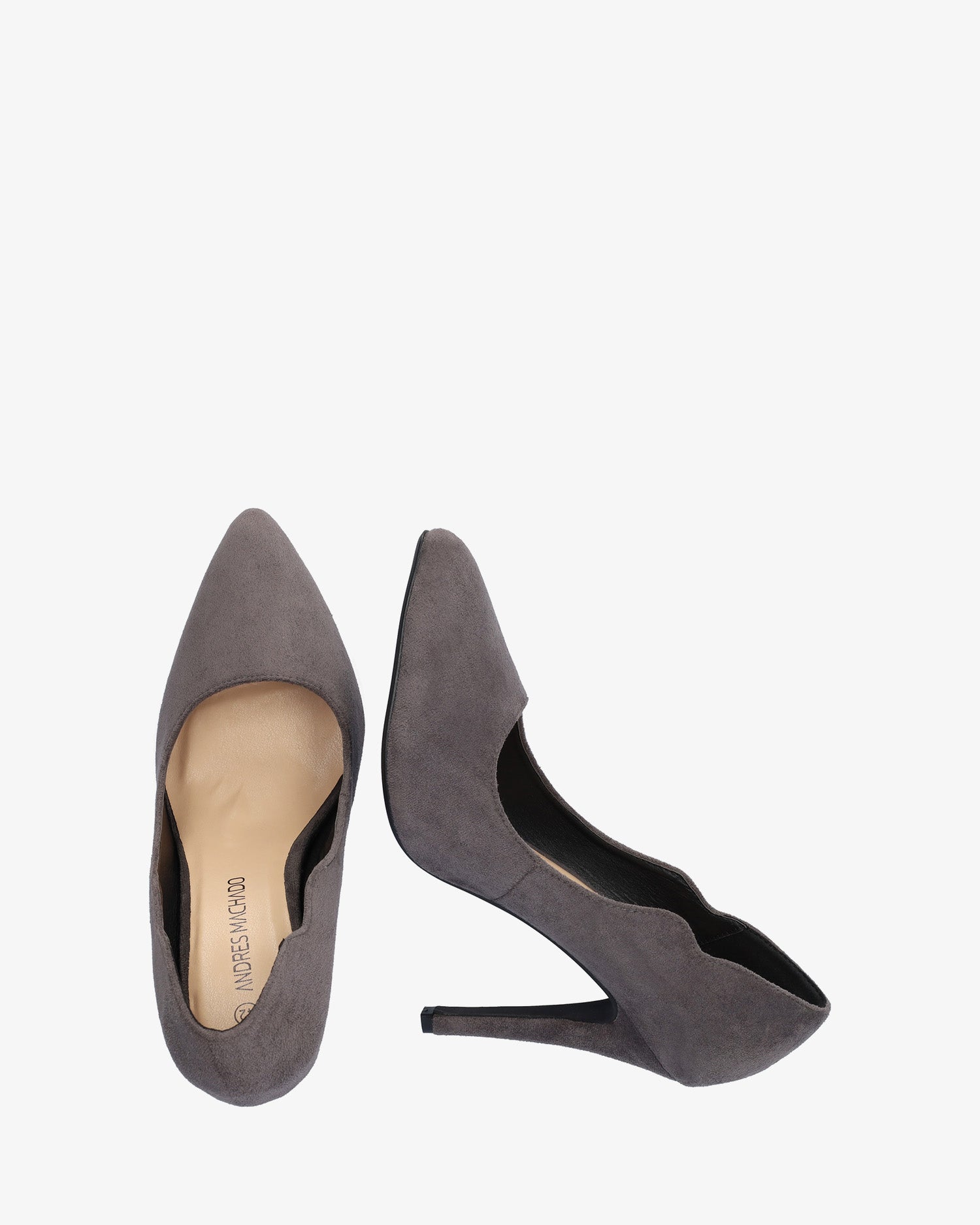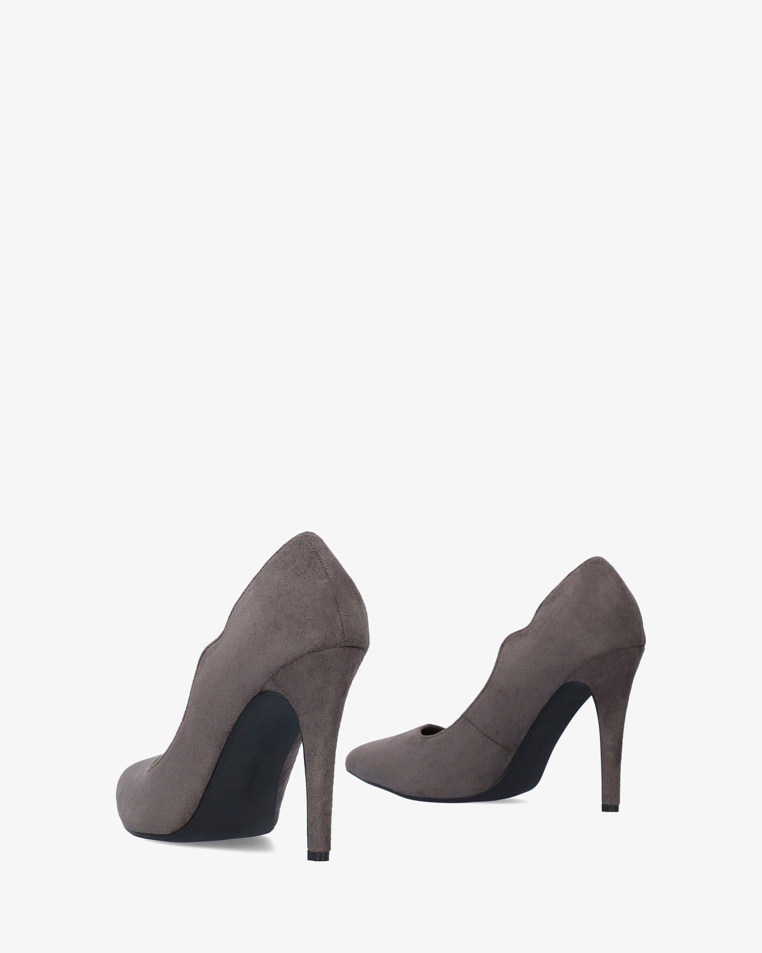 Fine-tip stilettos in grey faux suede. Decorative ruffled edge detail on both sides of the shoe. Pointed toe. The thin lined heel measures 9,5 cm for small sizes from 32 to 35 and 11 cm for big sizes from 42 to 45.