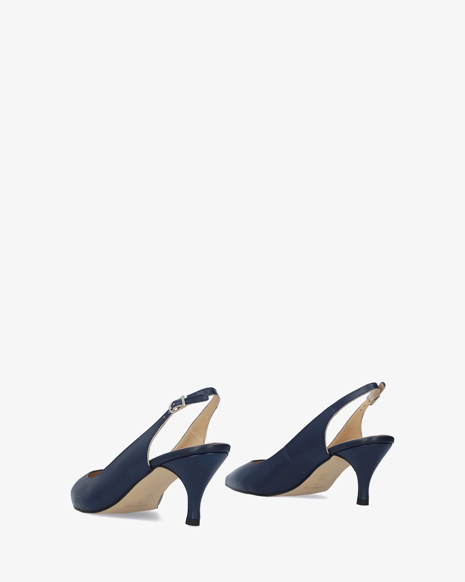 Slingback shoes in navy genuine leather. Fine toe and slingback buckle closure. Toned covered heel of 2.75" / 7 cm for Petite sizes from UK 0.5 to 2.5 / EU 32 to 35. Heel of 3.14" / 8 cm for Large sizes from UK 8 to 10.5 / EU 42 to 45. Made in Spain.