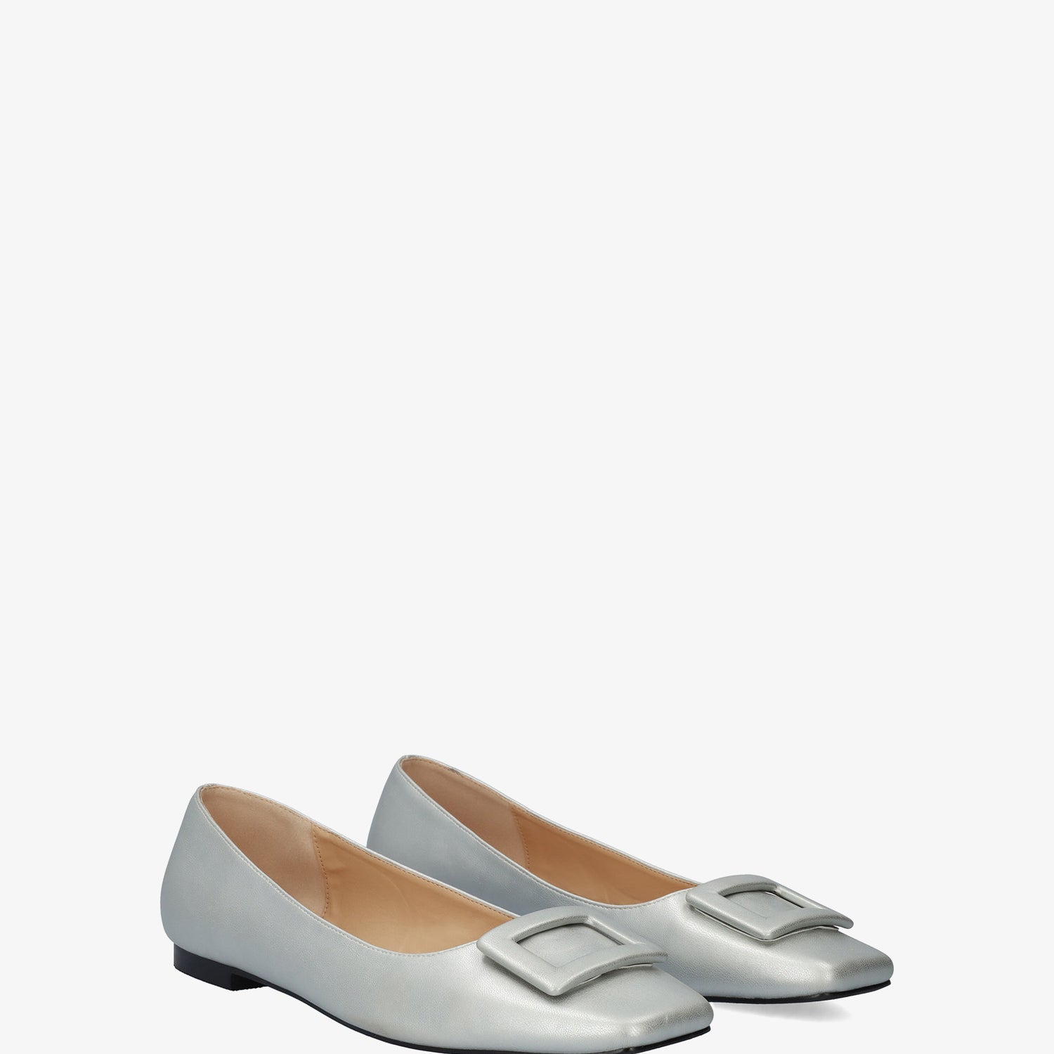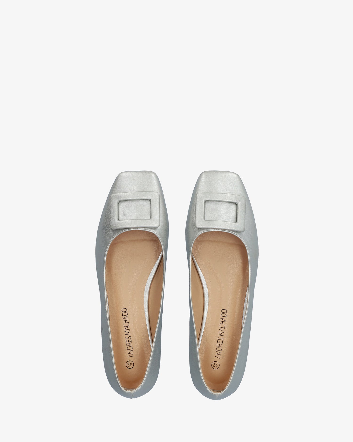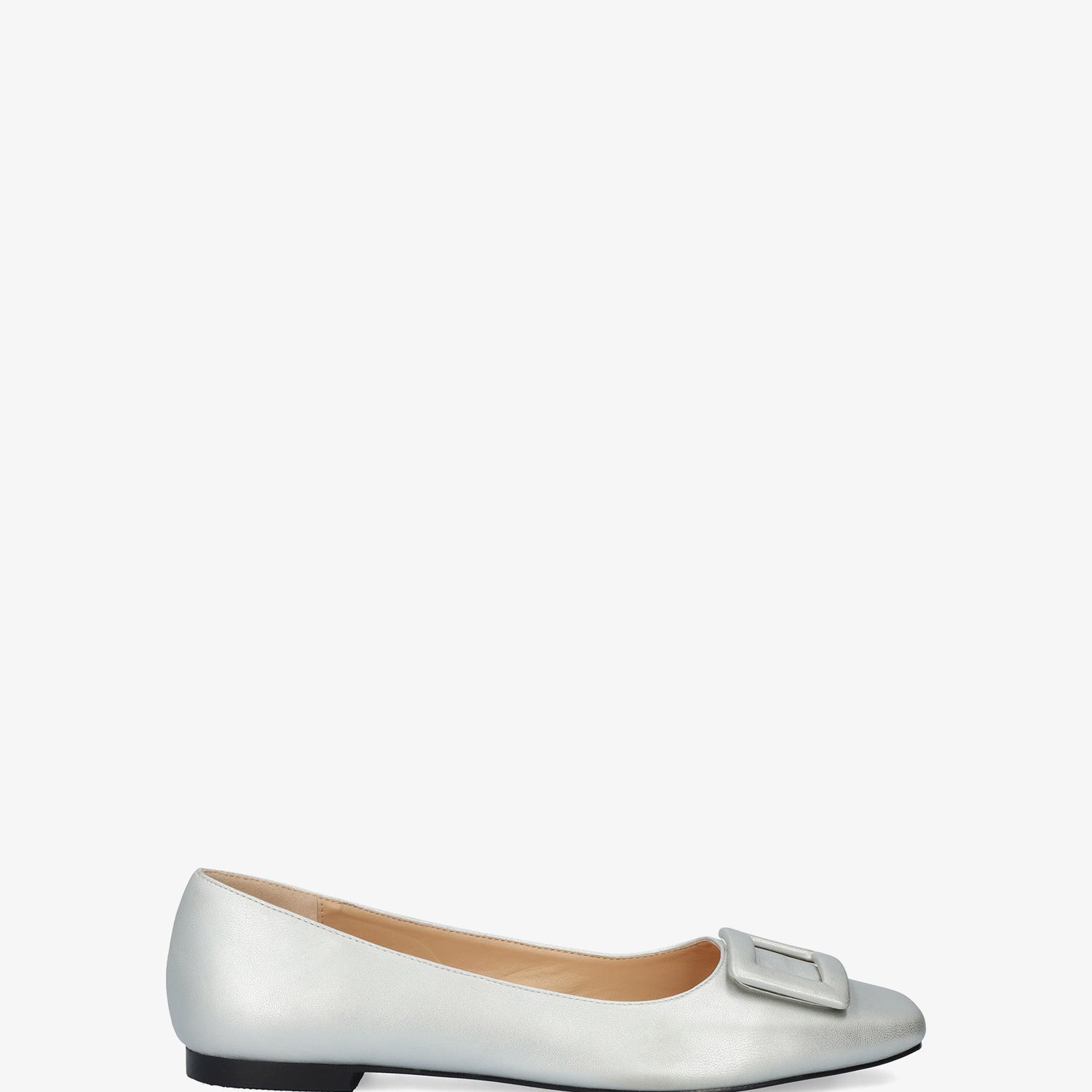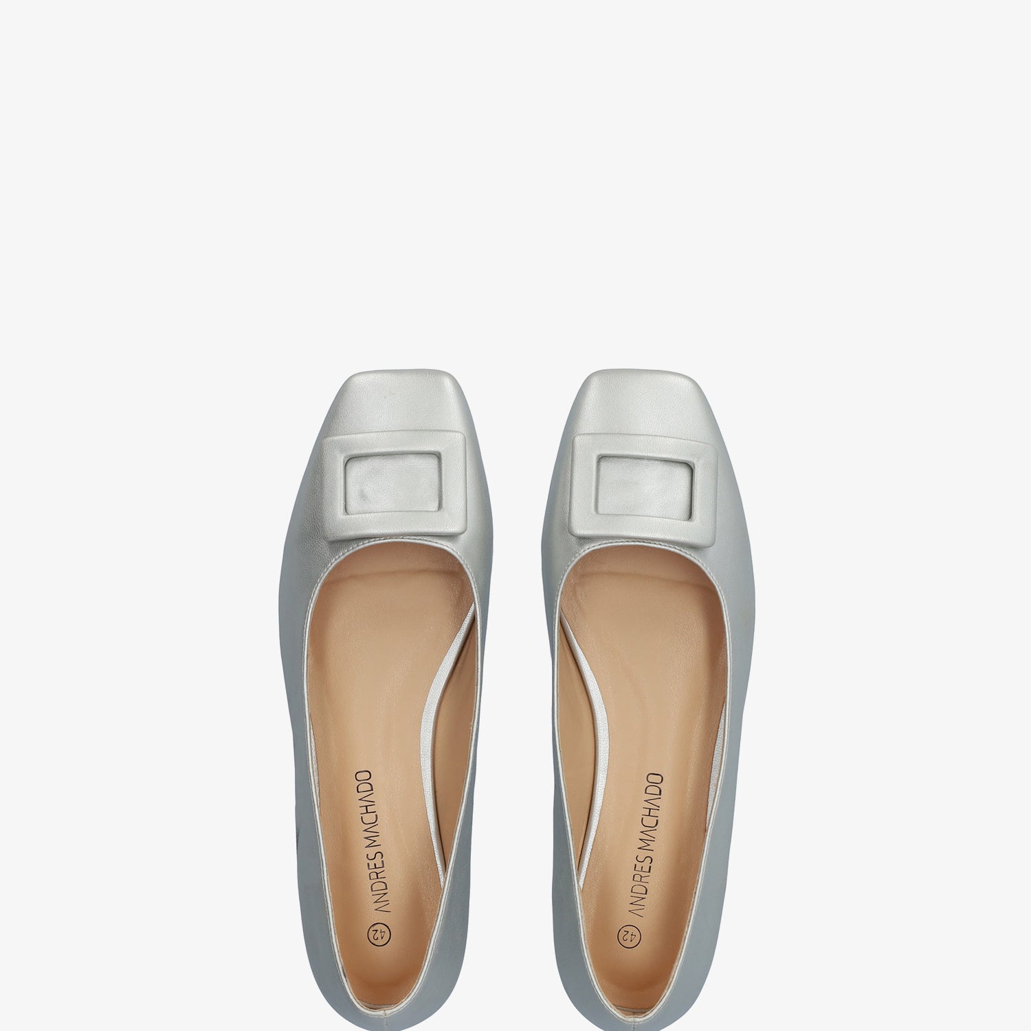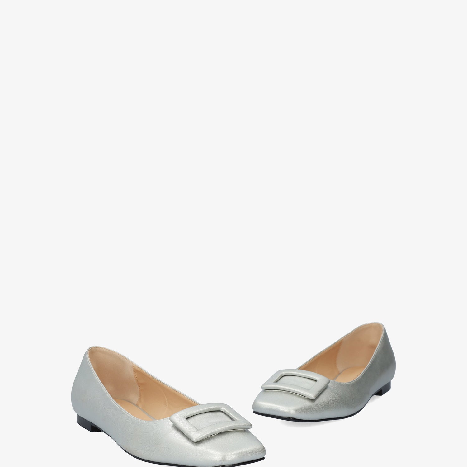Flat ballerina in silver faux leather. The design features a squared toe with a matching rectangular buckle lined in soft material. Mini-block heel for large sizes from 42 to 45 EU.