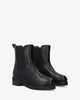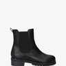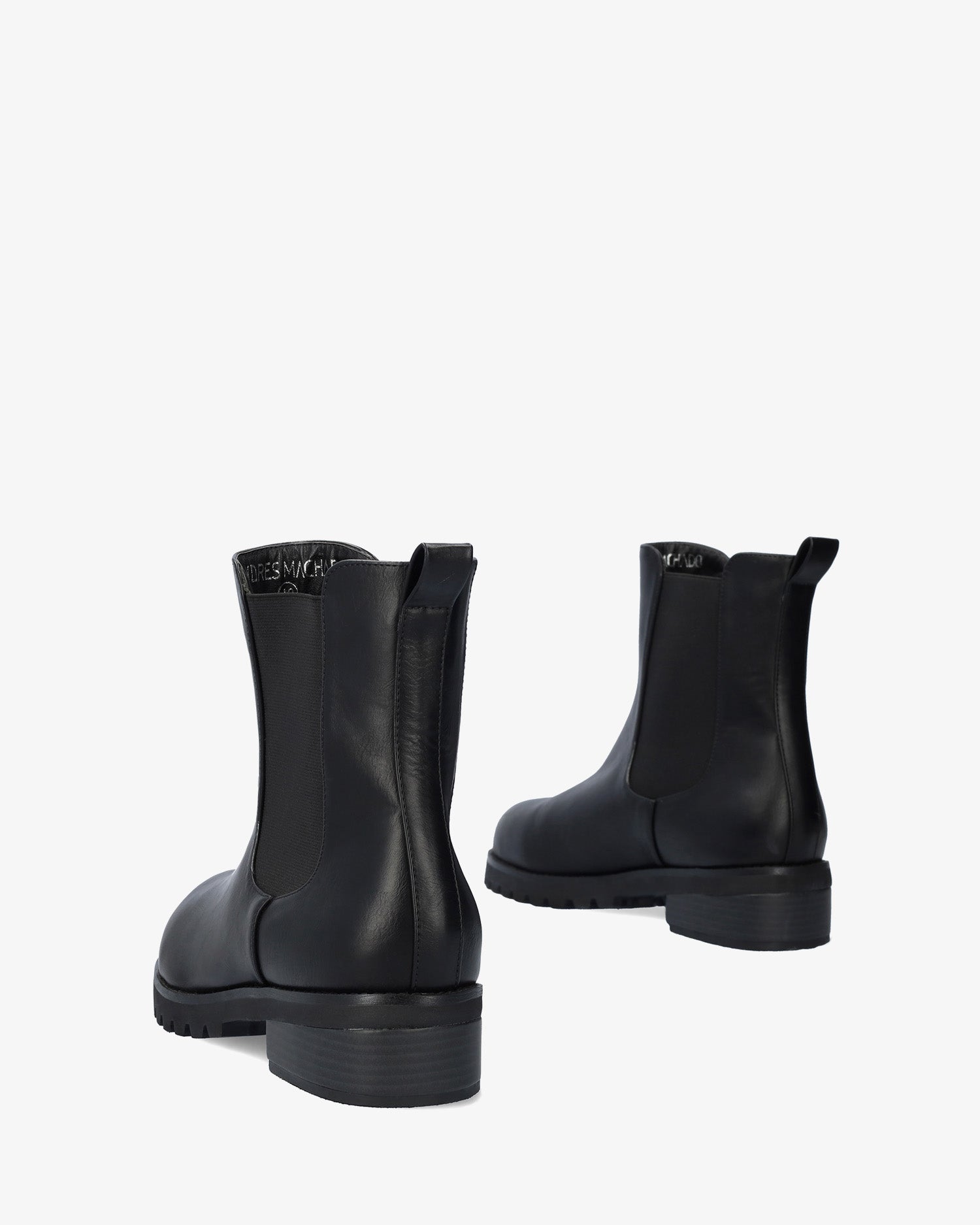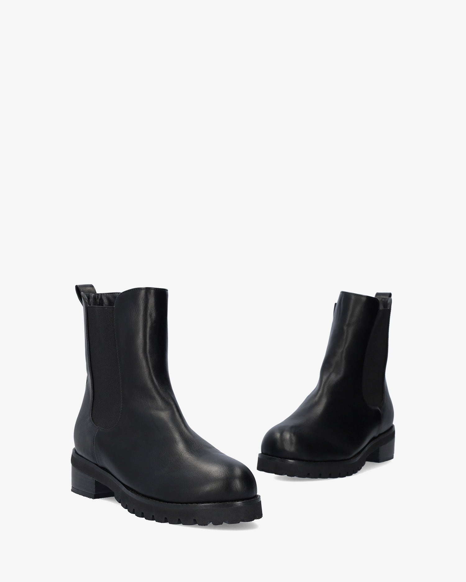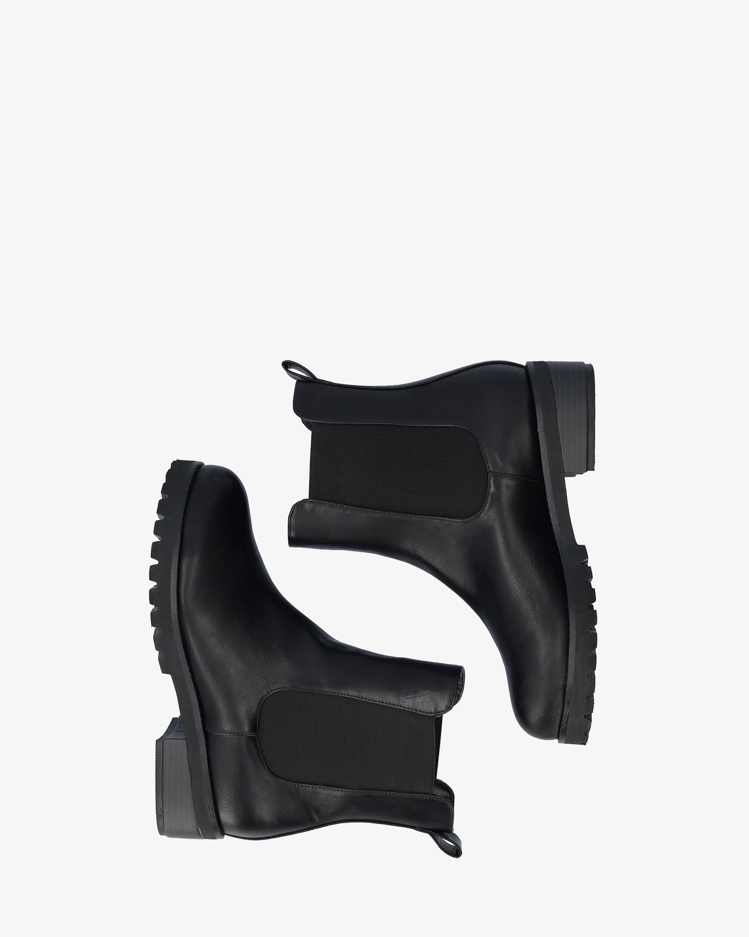 Chelsea style ankle boots in soft black faux leather. Wide black elastic on both sides of the shaft. Matching detail of back pull tab. Rounded toe and black track outsole. The heel is 4cm high for small sizes from 32 to 35 EU and 5,5cm high for large sizes from 42 to 45 EU.