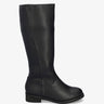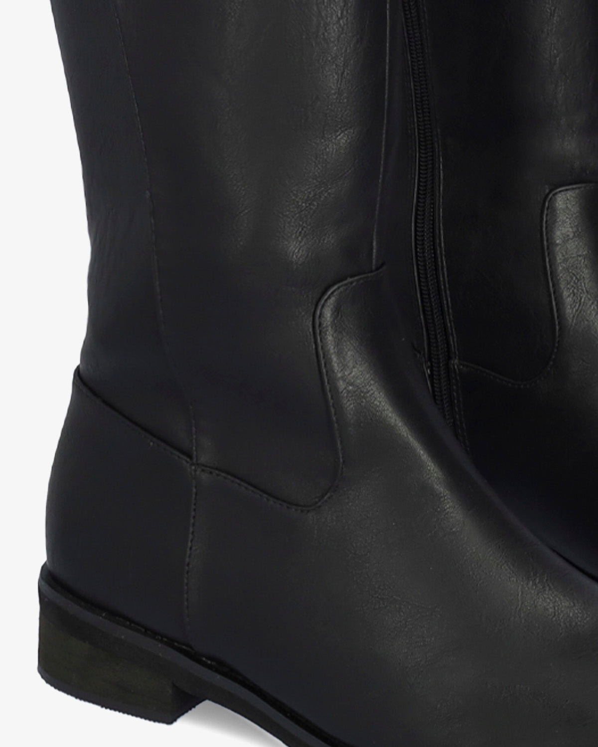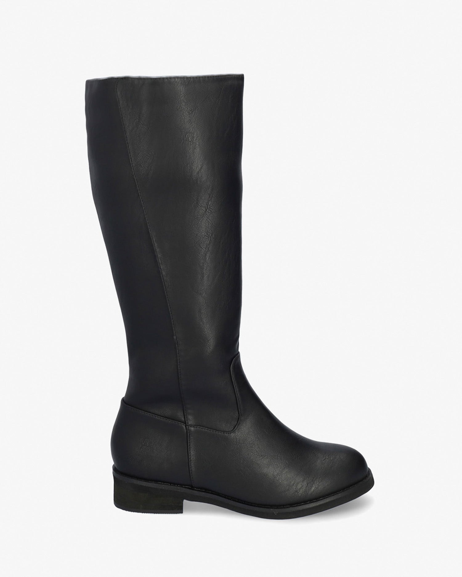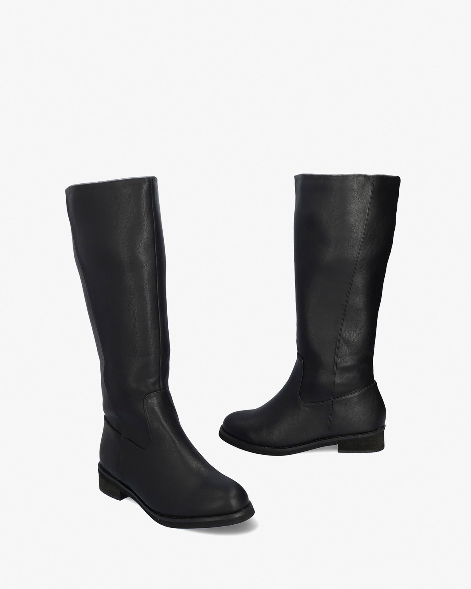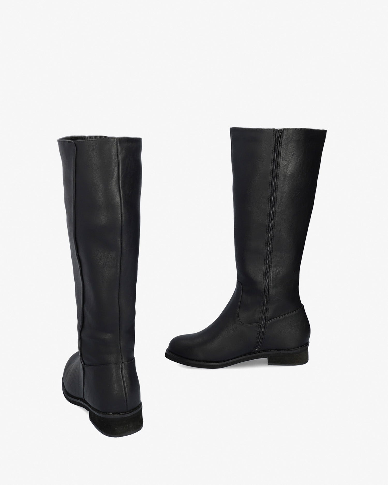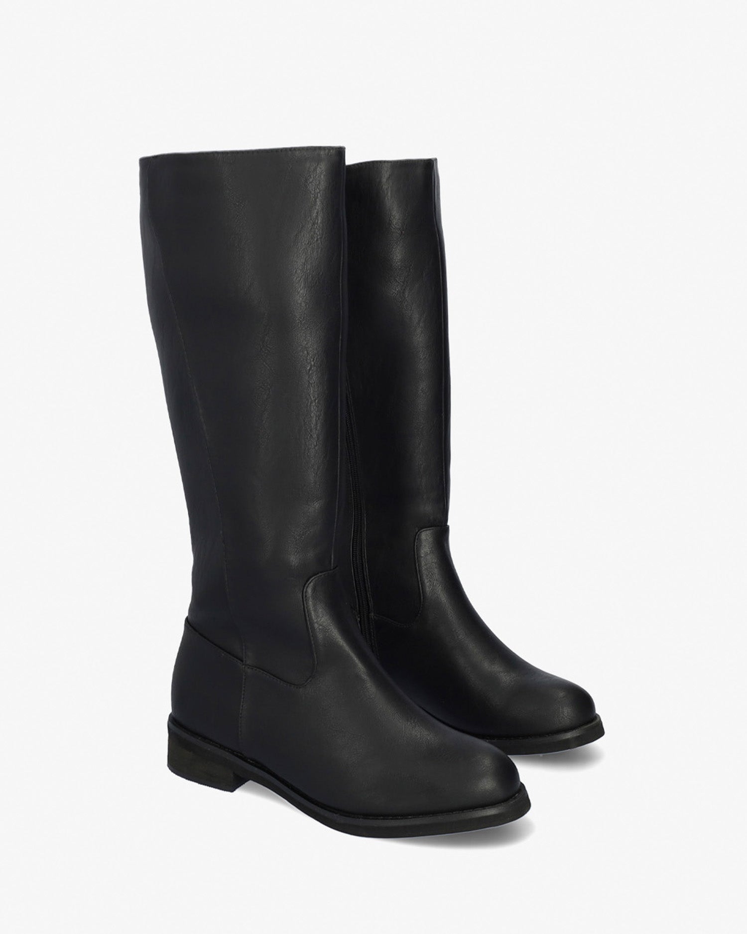 Boots in black faux leather. High boots with matching zipper closure on the inner half of the shaft. Round toe. Small 3cm / 1.18`` heel with sanded wood texture. Available in large sizes from 42 to 45 EU.