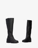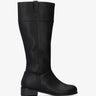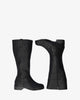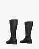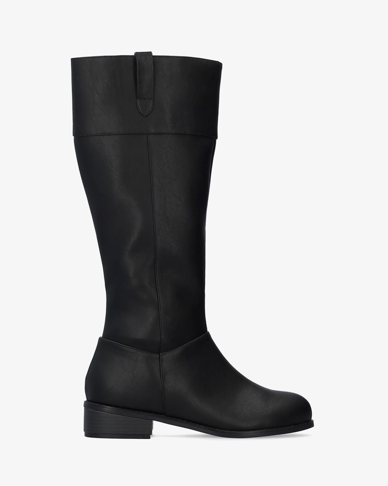 Flat high-calf boots in black faux leather. Matching zipper closure on the inner shaft. Decorative matching strap around the shaft and one handle on each side. Rounded toe.Black outsole. Wooden effect heel is 4cm high for large sizes from 42 to 45 EU.