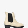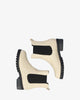 Chelsea style ankle boots in soft cream faux leather. Wide black elastic on both sides of the shaft. Matching detail of back pull tab. Rounded toe and black track outsole. The heel is 4cm high for small sizes from 32 to 35 EU and 5,5cm high for large sizes from 42 to 45 EU.