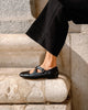 Flat ballerina in leather. Finished with a square toe and featuring two wide, colour-matched straps crossed over the instep, with a side buckle fastening. Available in small sizes from 32 to 35 and large sizes from 42 to 45. Made in Spain.