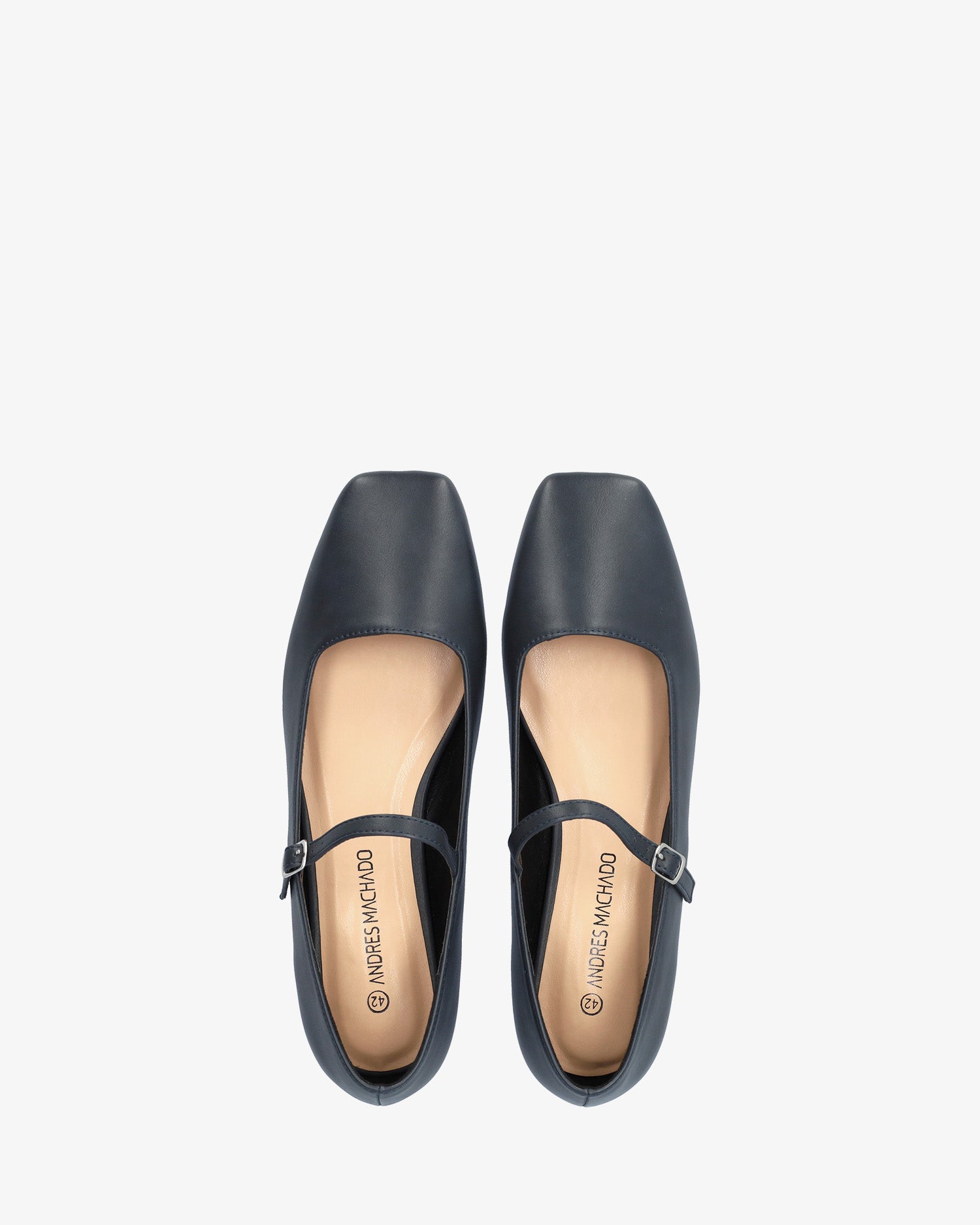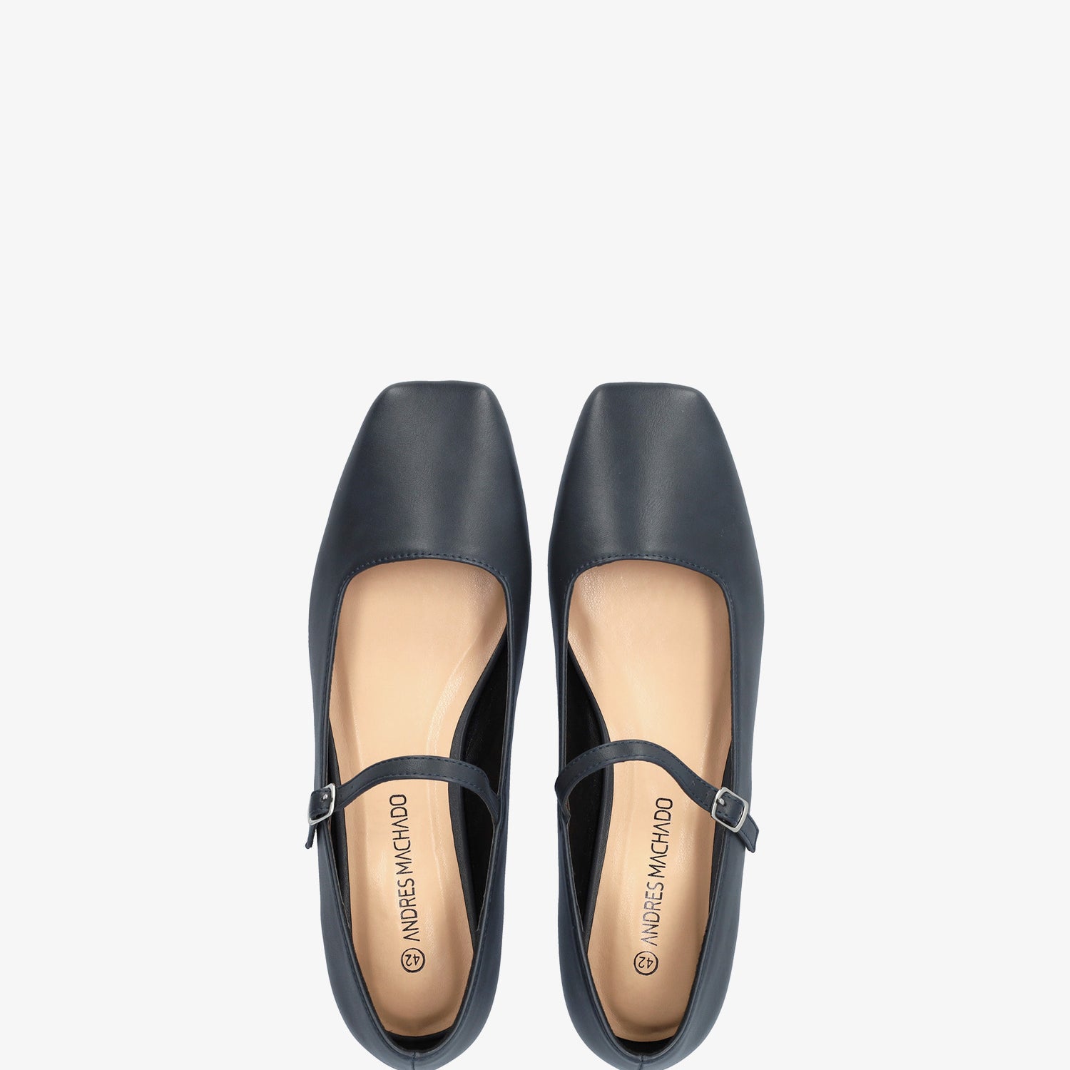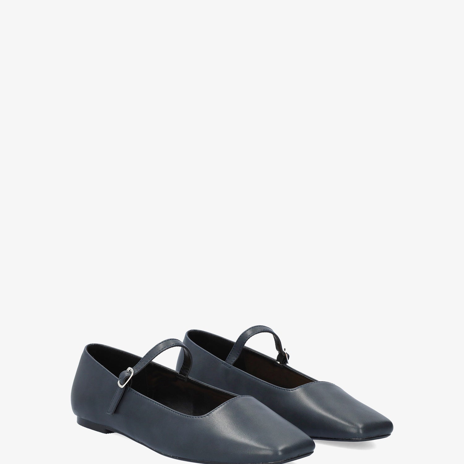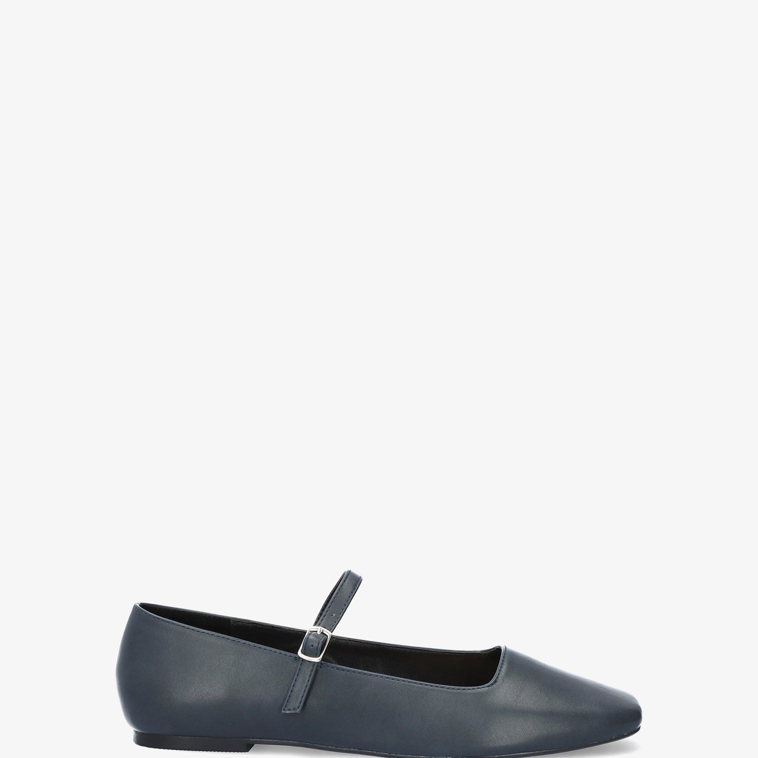 Mary Jane style flat ballerina in soft navy coloured material. Finished in a squared toe and a fine strap over the instep with a metallic buckle. Only available for large sizes from 43 to 46