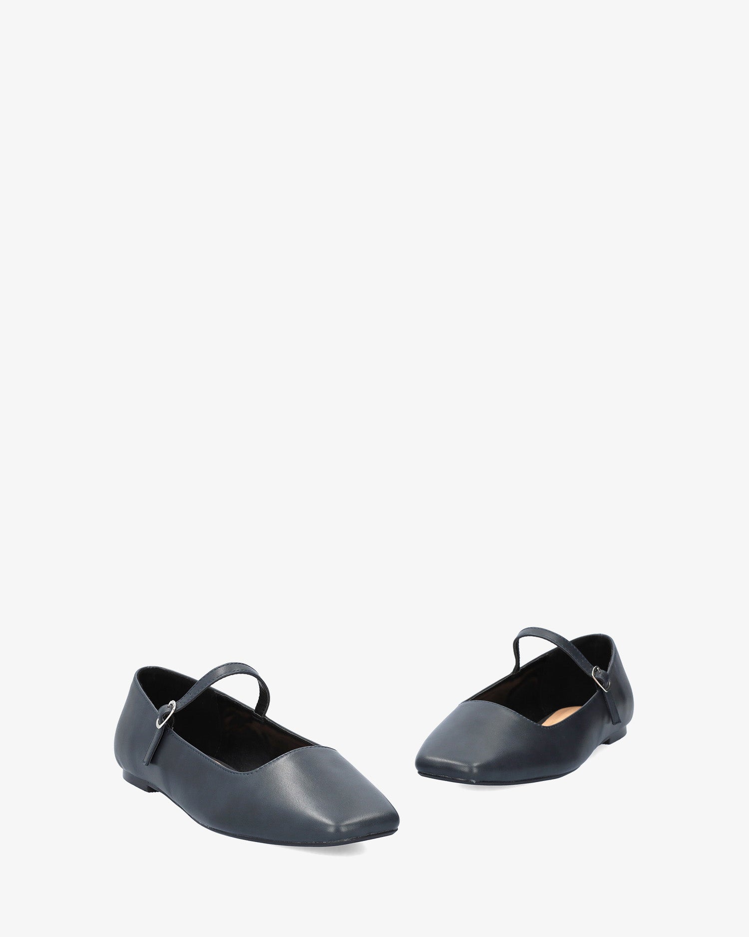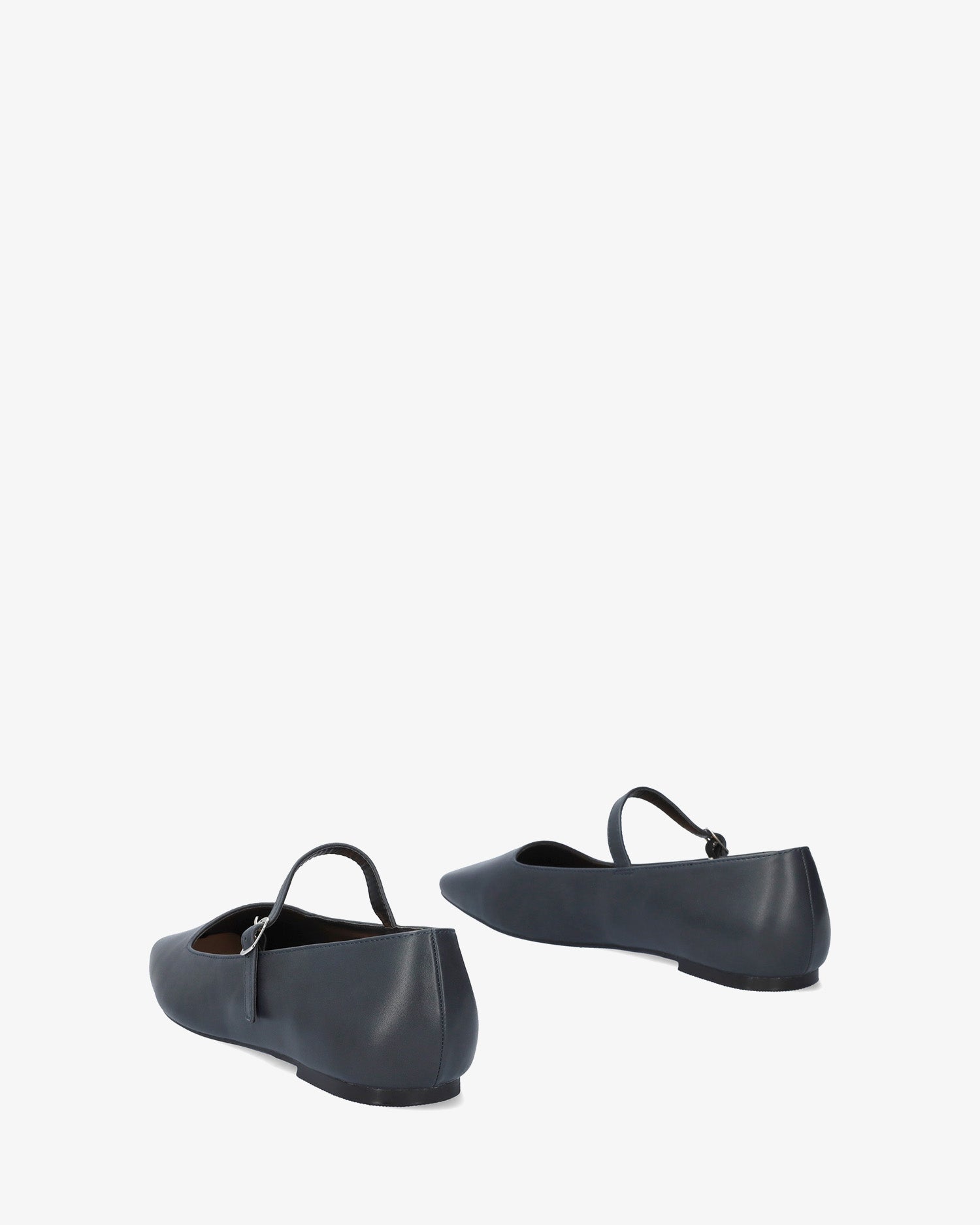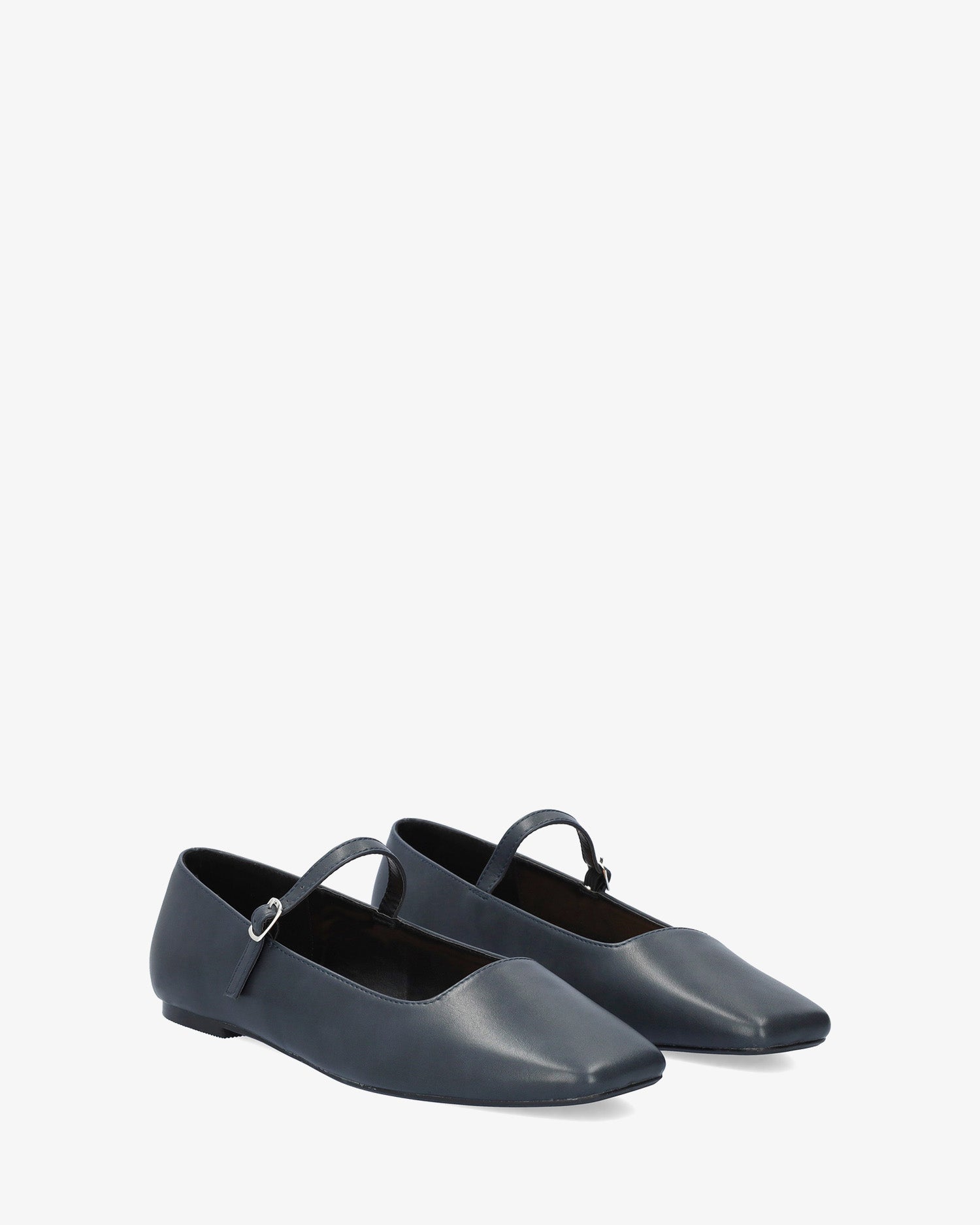Mary Jane style flat ballerina in soft navy coloured material. Finished in a squared toe and a fine strap over the instep with a metallic buckle. Only available for large sizes from 43 to 46