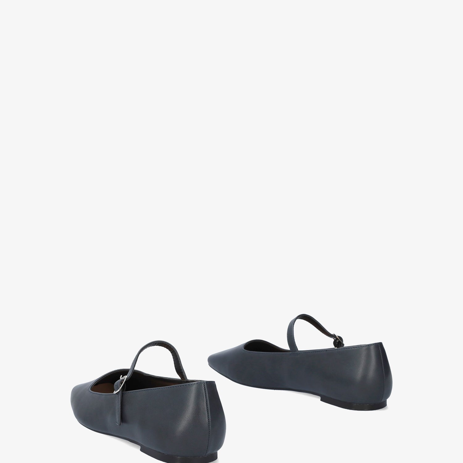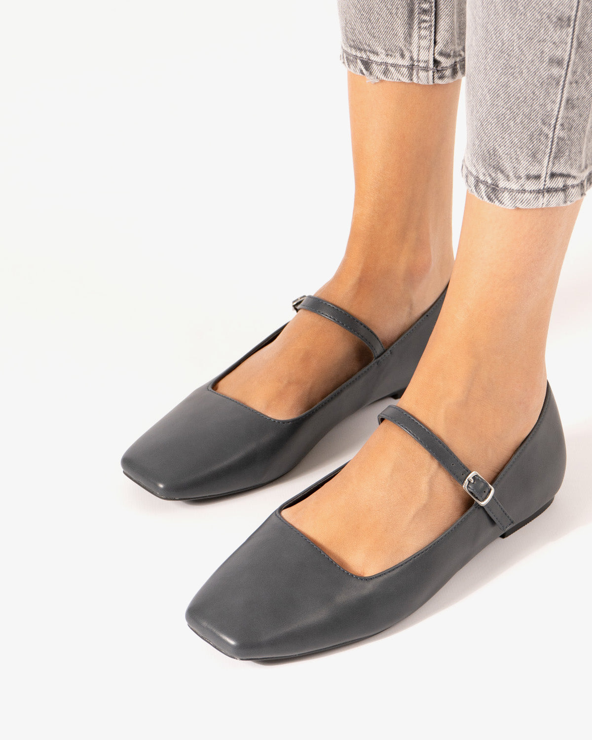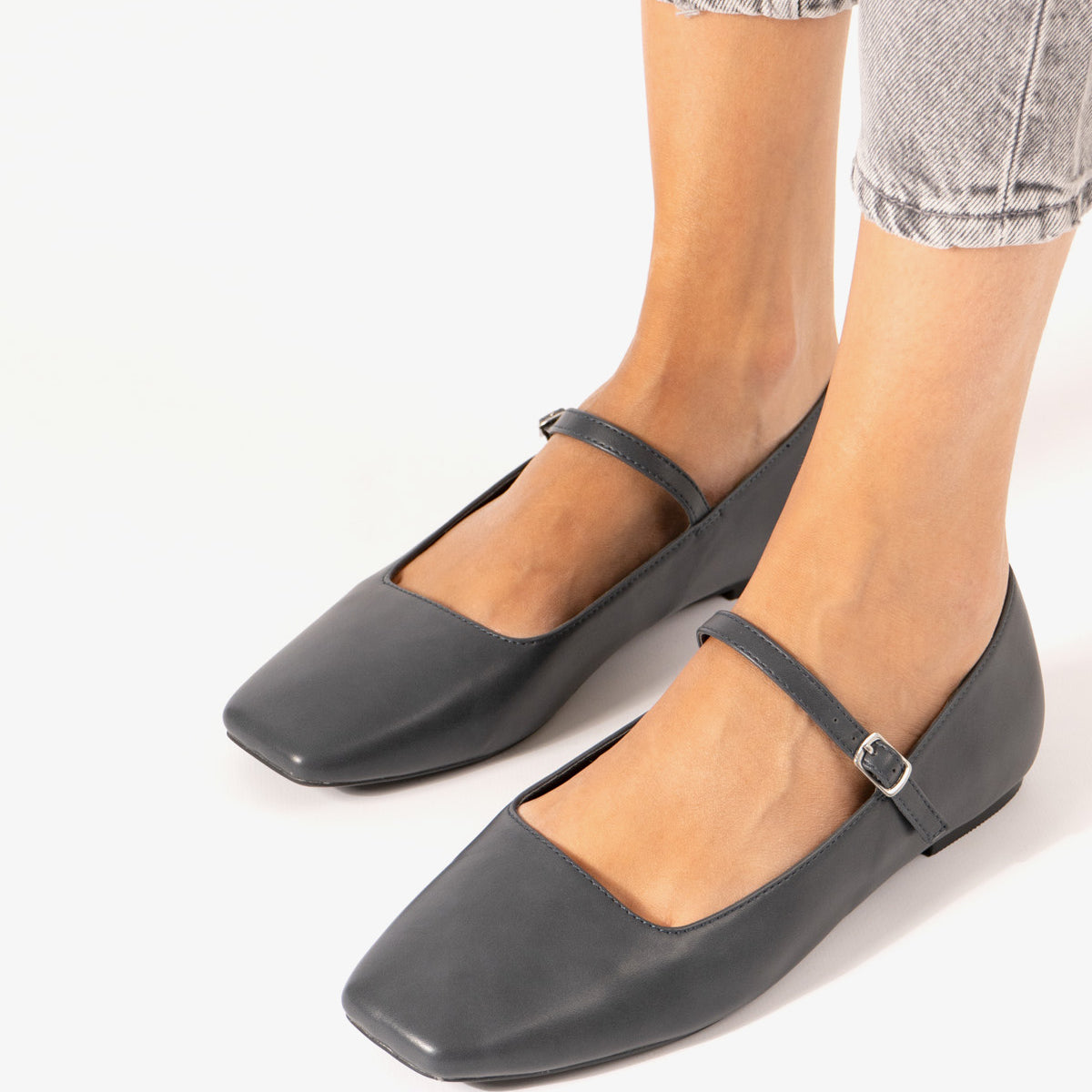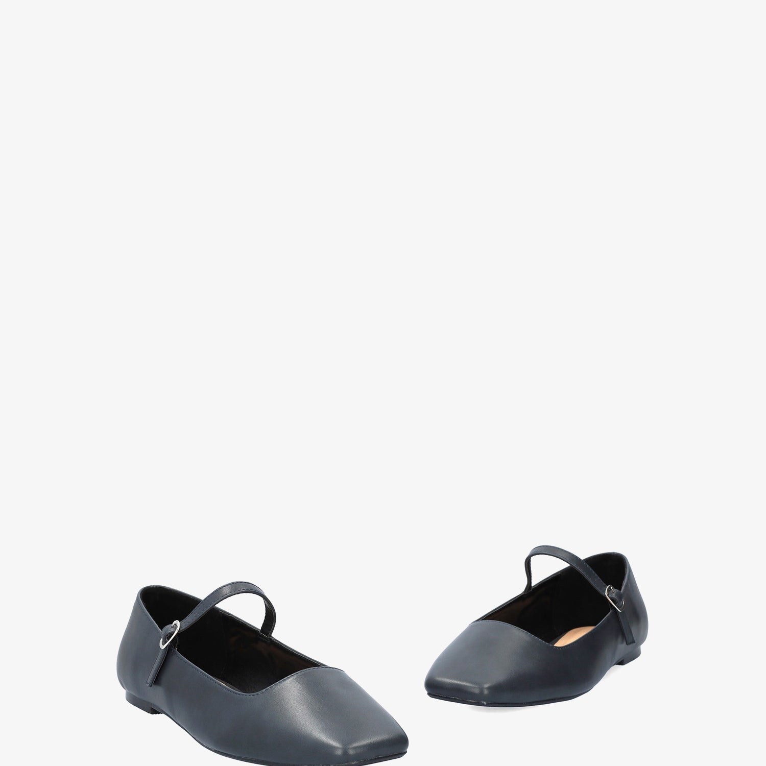 Mary Jane style flat ballerina in soft navy coloured material. Finished in a squared toe and a fine strap over the instep with a metallic buckle. Only available for large sizes from 43 to 46