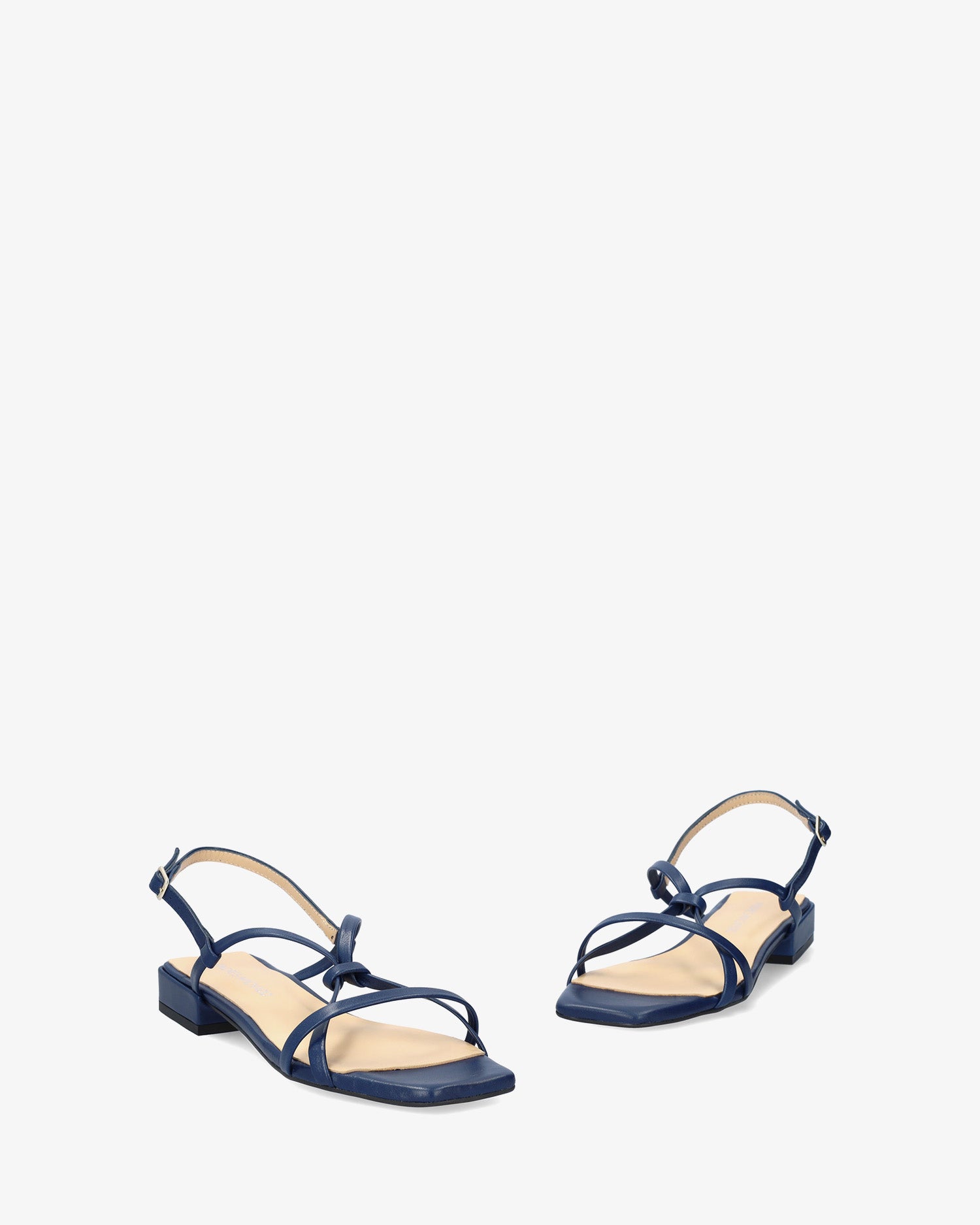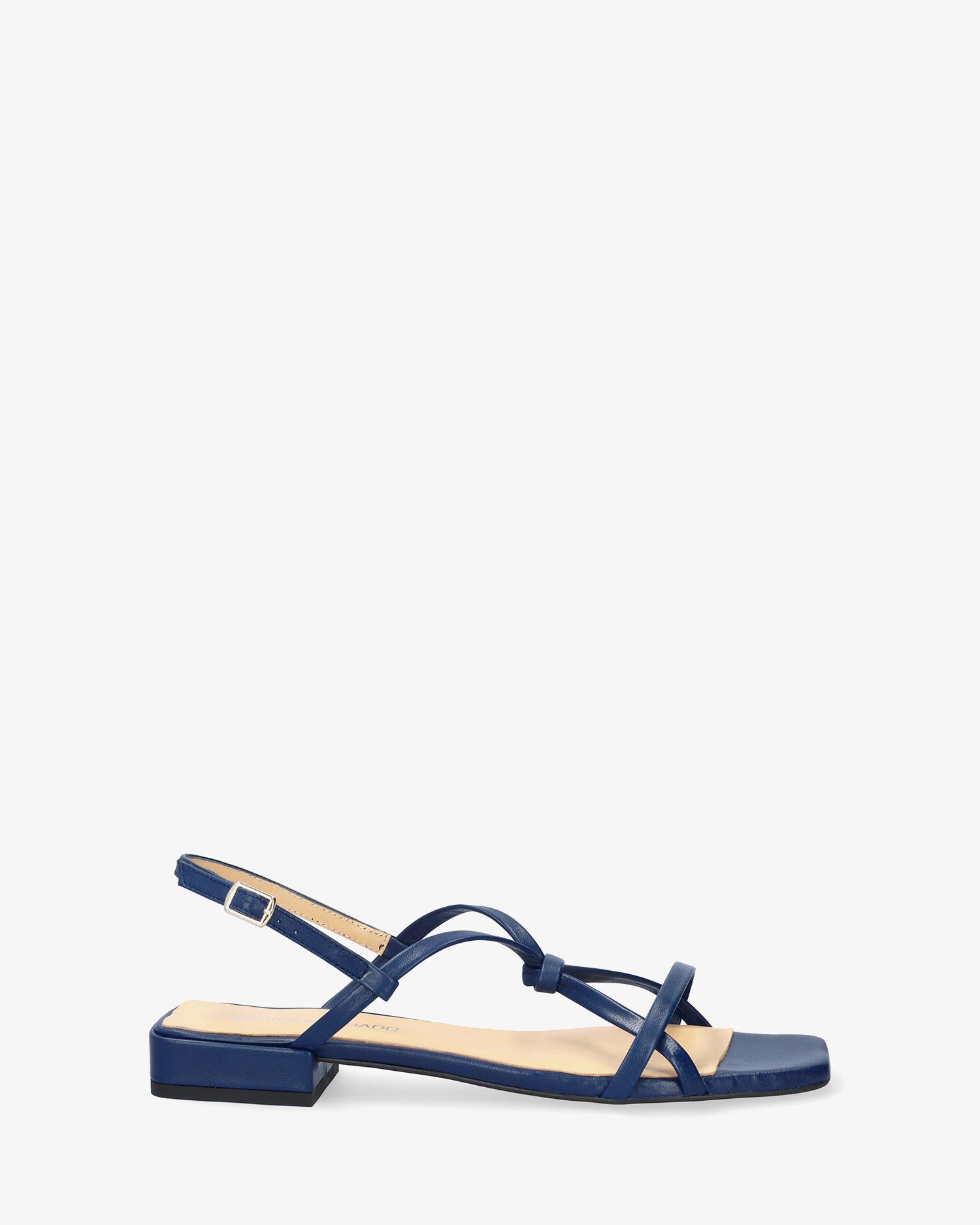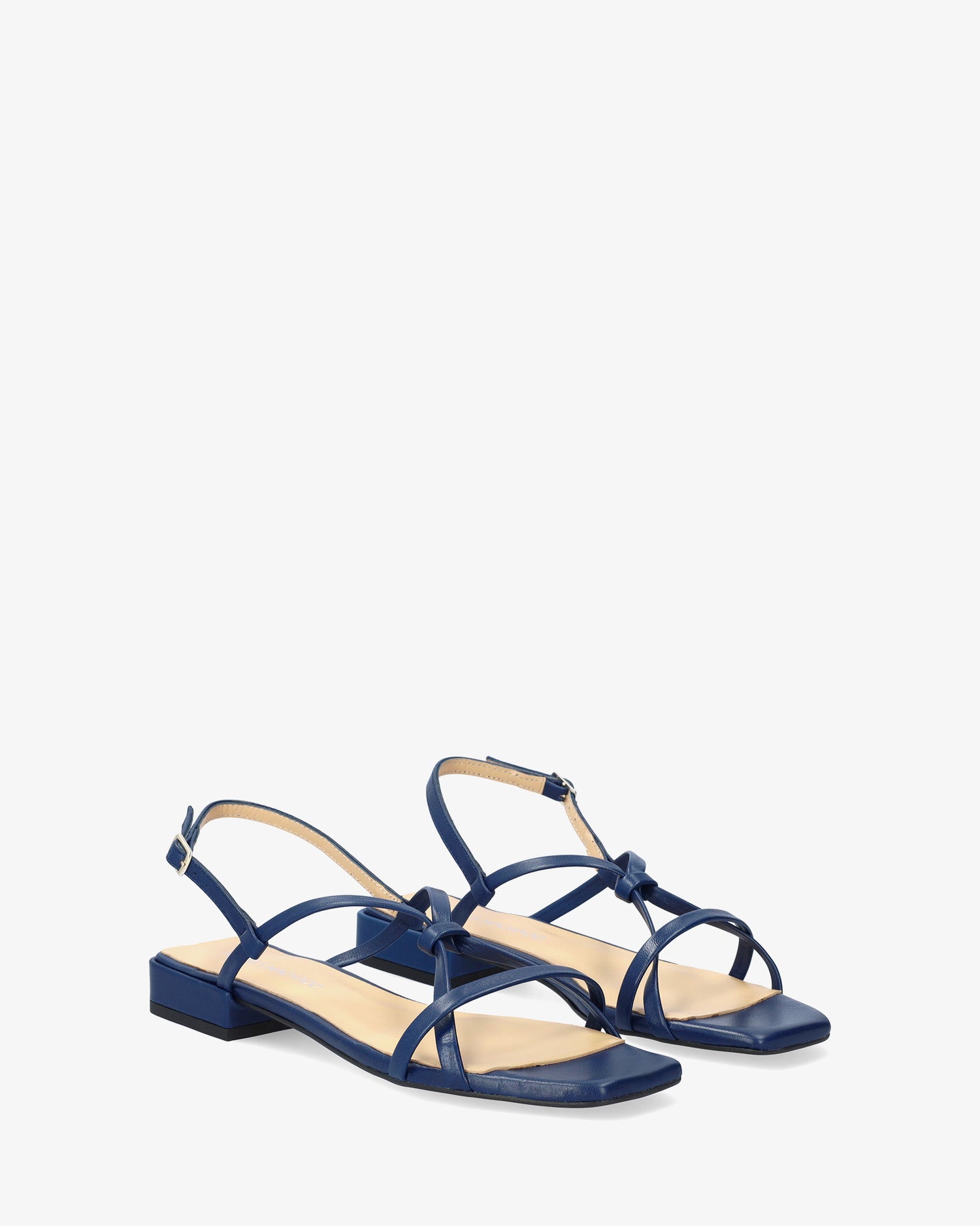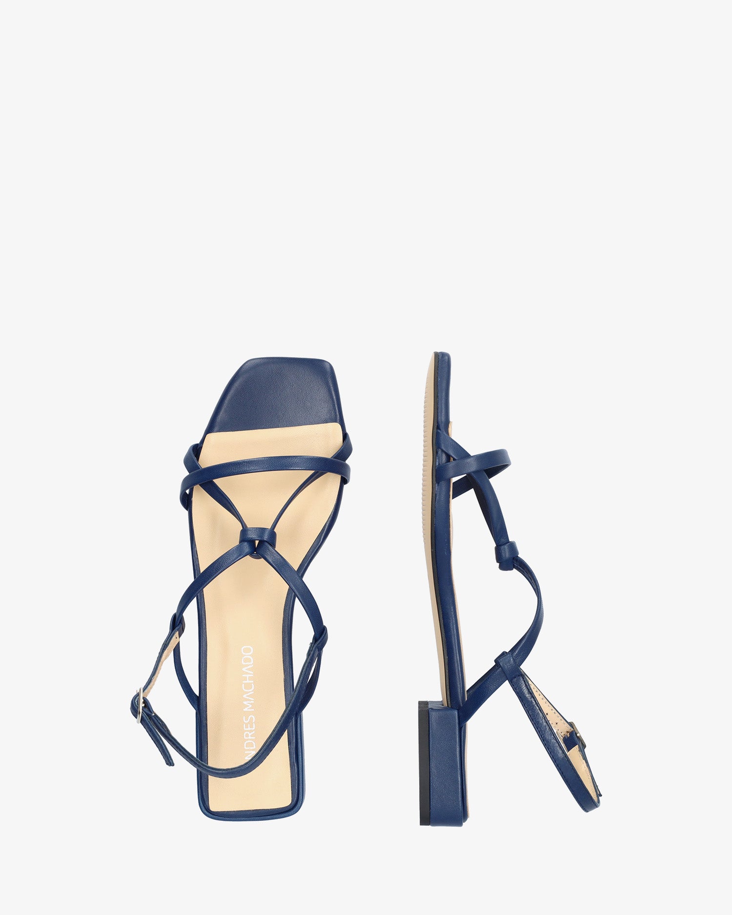 Flat navy leather sandals with a multi strap design knotted on the open squared toe. The closing strap finishes with a buckle on the ankle. The squared block heel measures 0,98" for small sizes from 32 to 35 and 1,18" for large sizes from 42 to 45. Made in Spain.