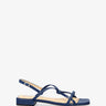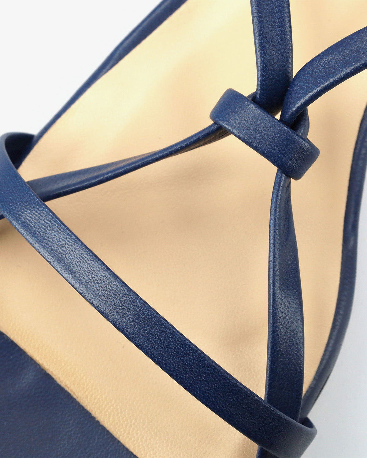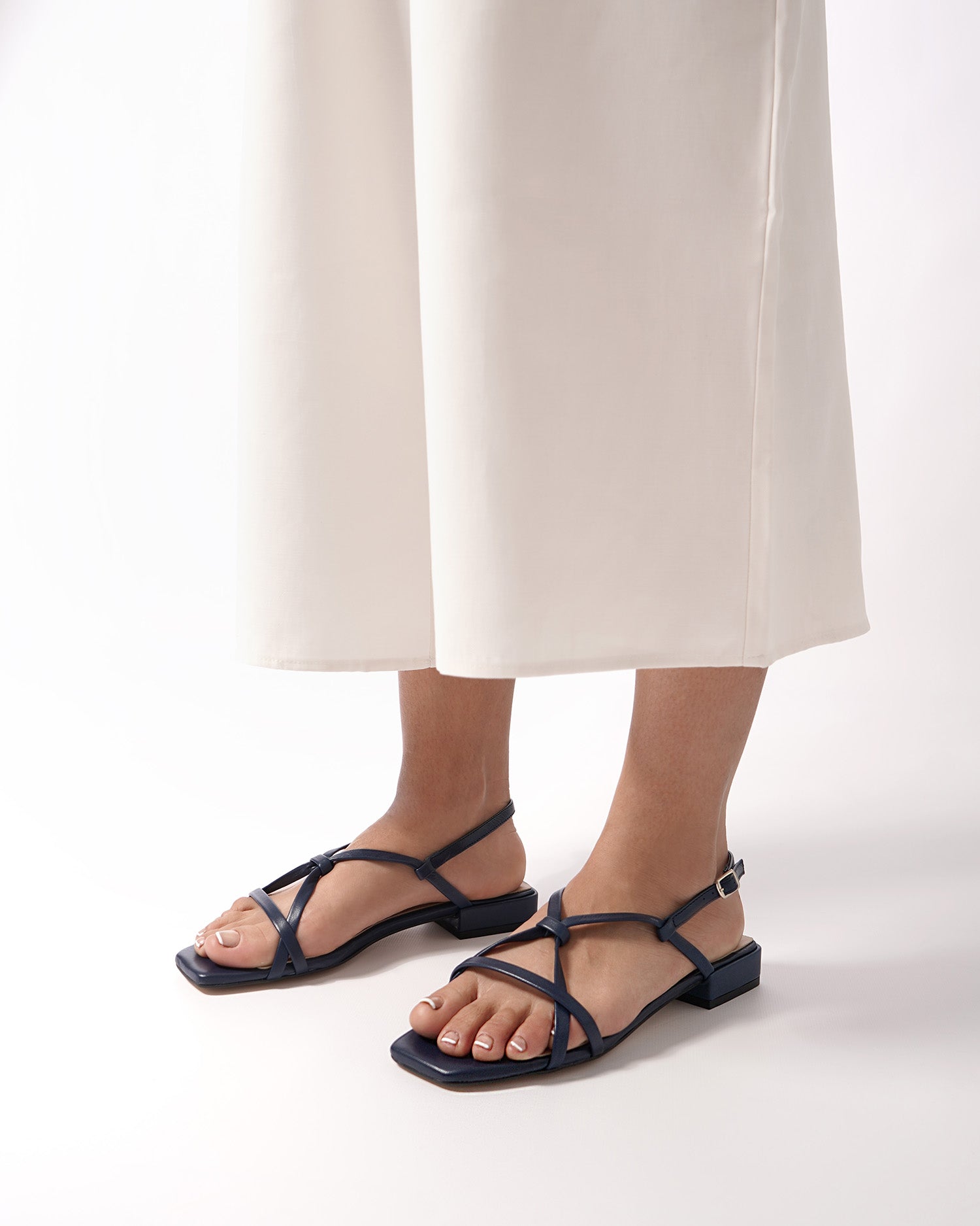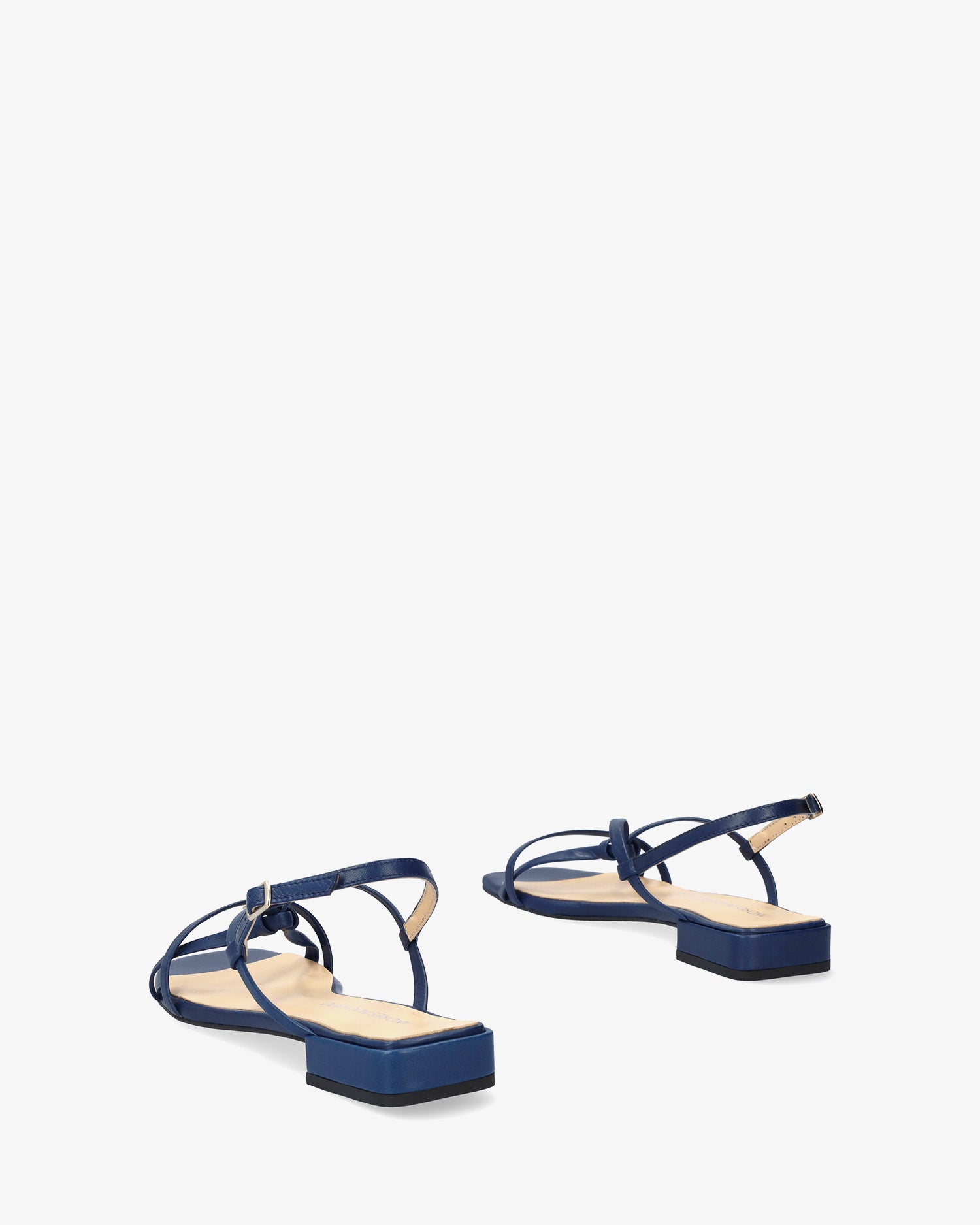 Flat navy leather sandals with a multi strap design knotted on the open squared toe. The closing strap finishes with a buckle on the ankle. The squared block heel measures 0,98" for small sizes from 32 to 35 and 1,18" for large sizes from 42 to 45. Made in Spain.