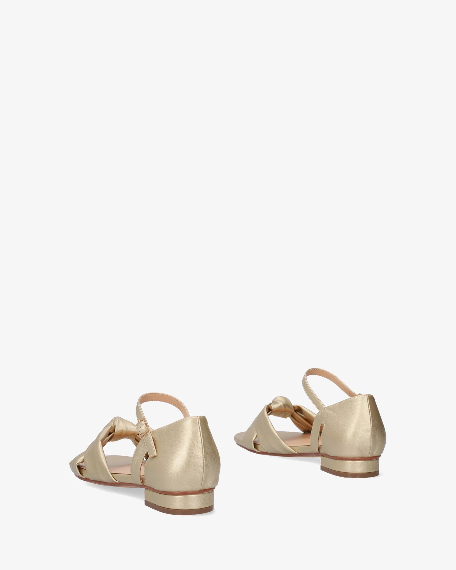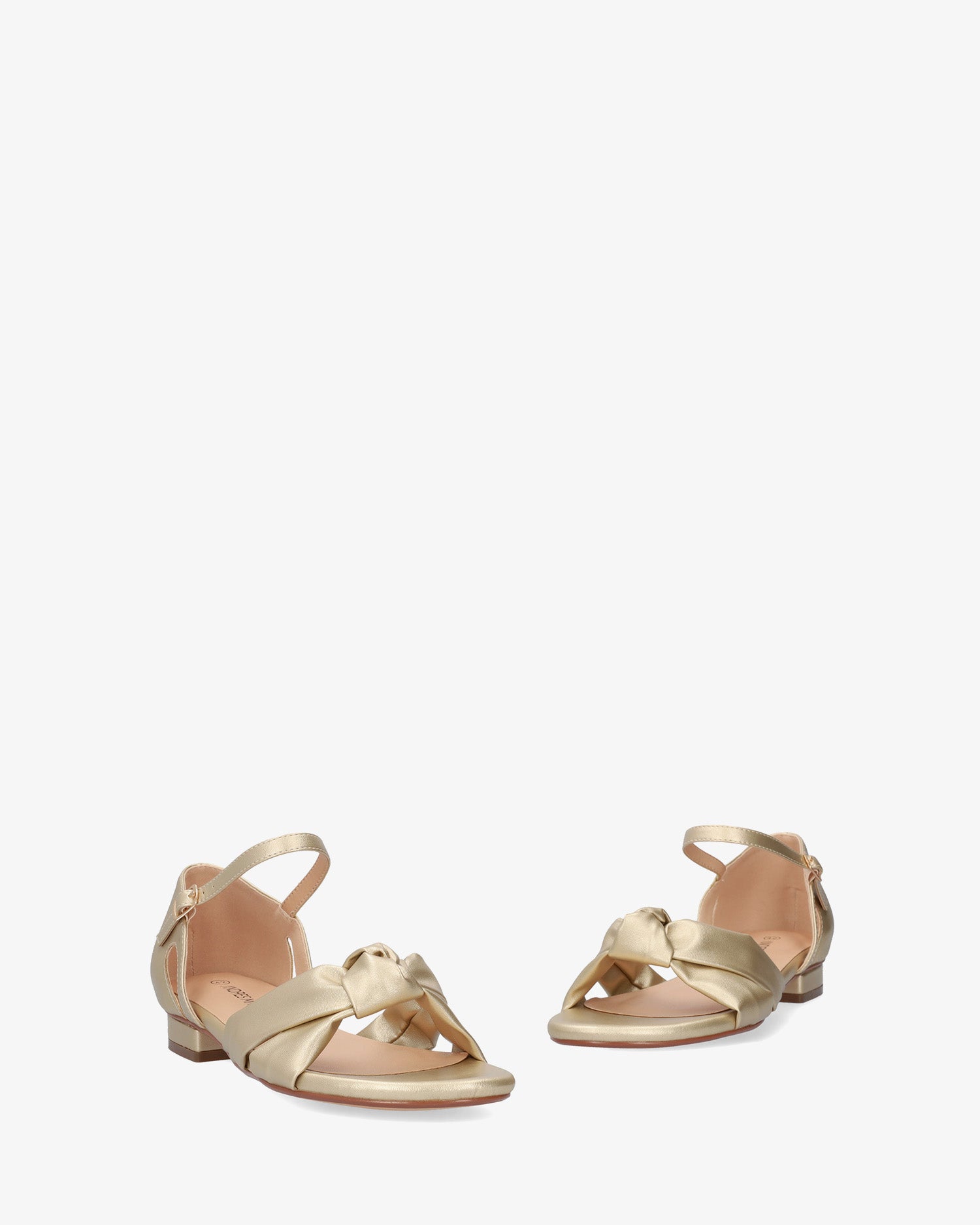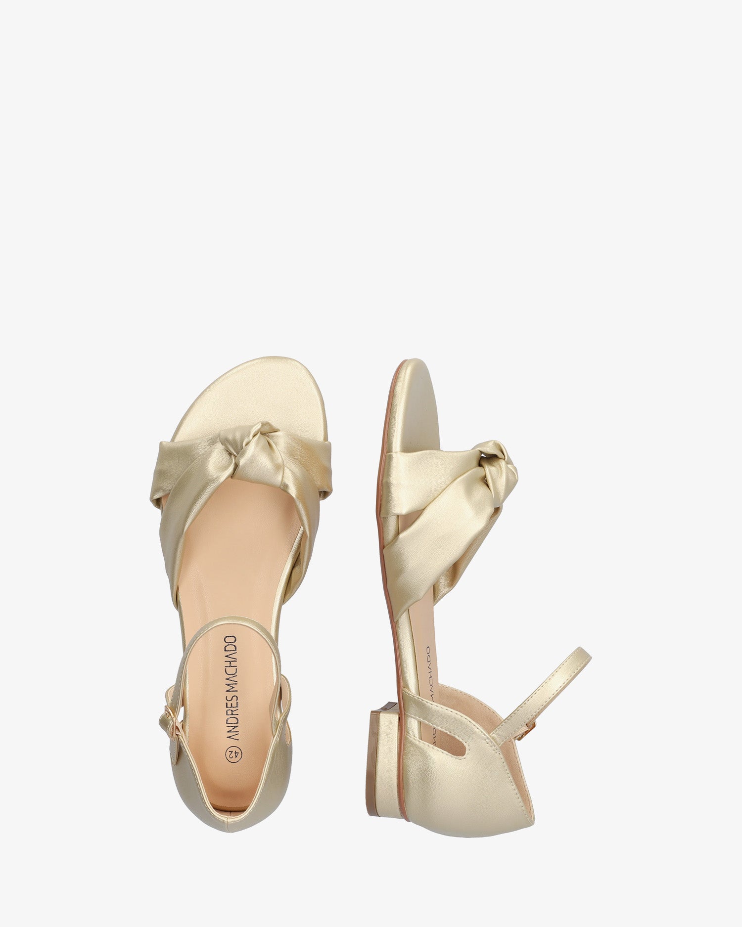 Flat sandals in soft golden colored material. The design features a closed flat heel, and an open rounded toe with two wide straps finishing with a knot over the vamp. Matching buckled strap arount the ankle. The heel height for large sizes from 42 to 45 measures 0,78".