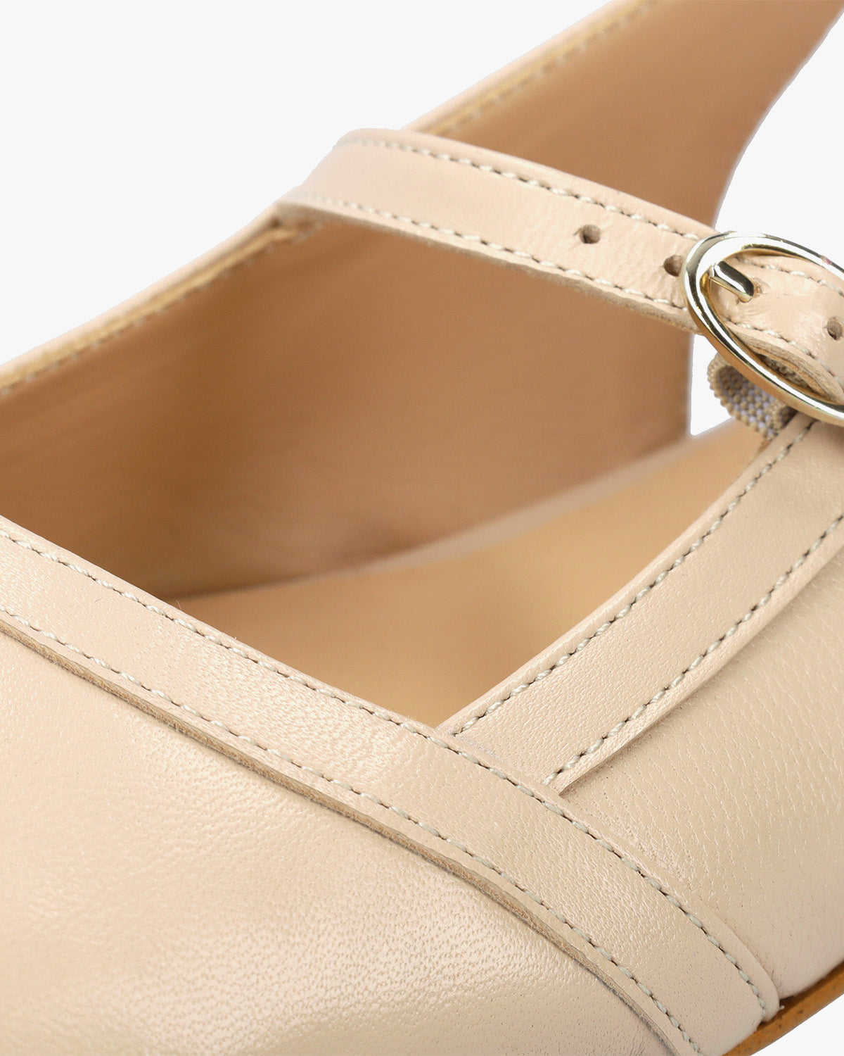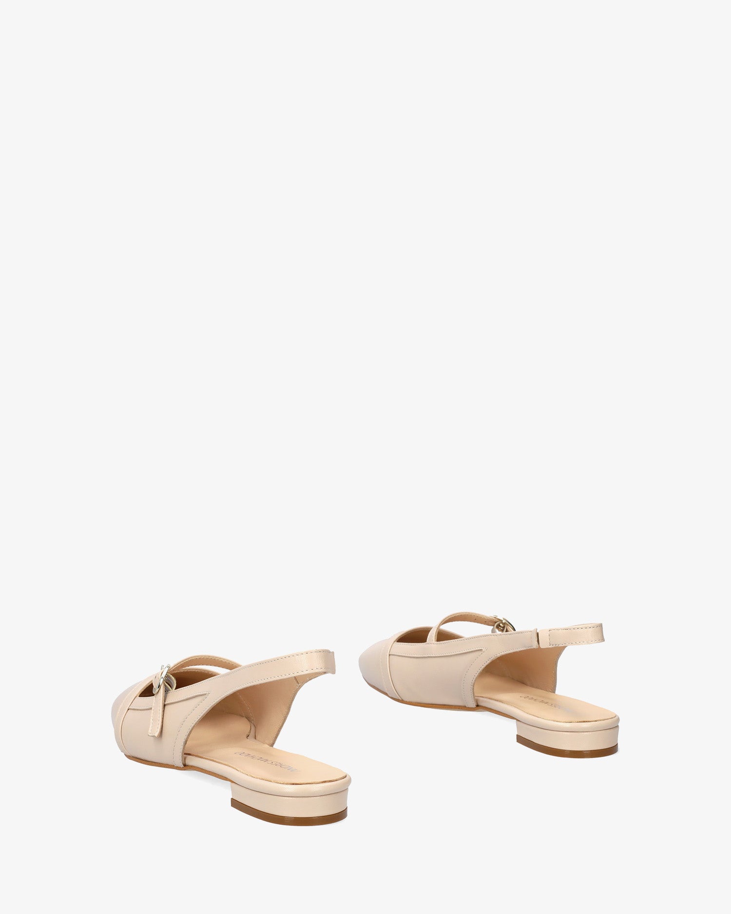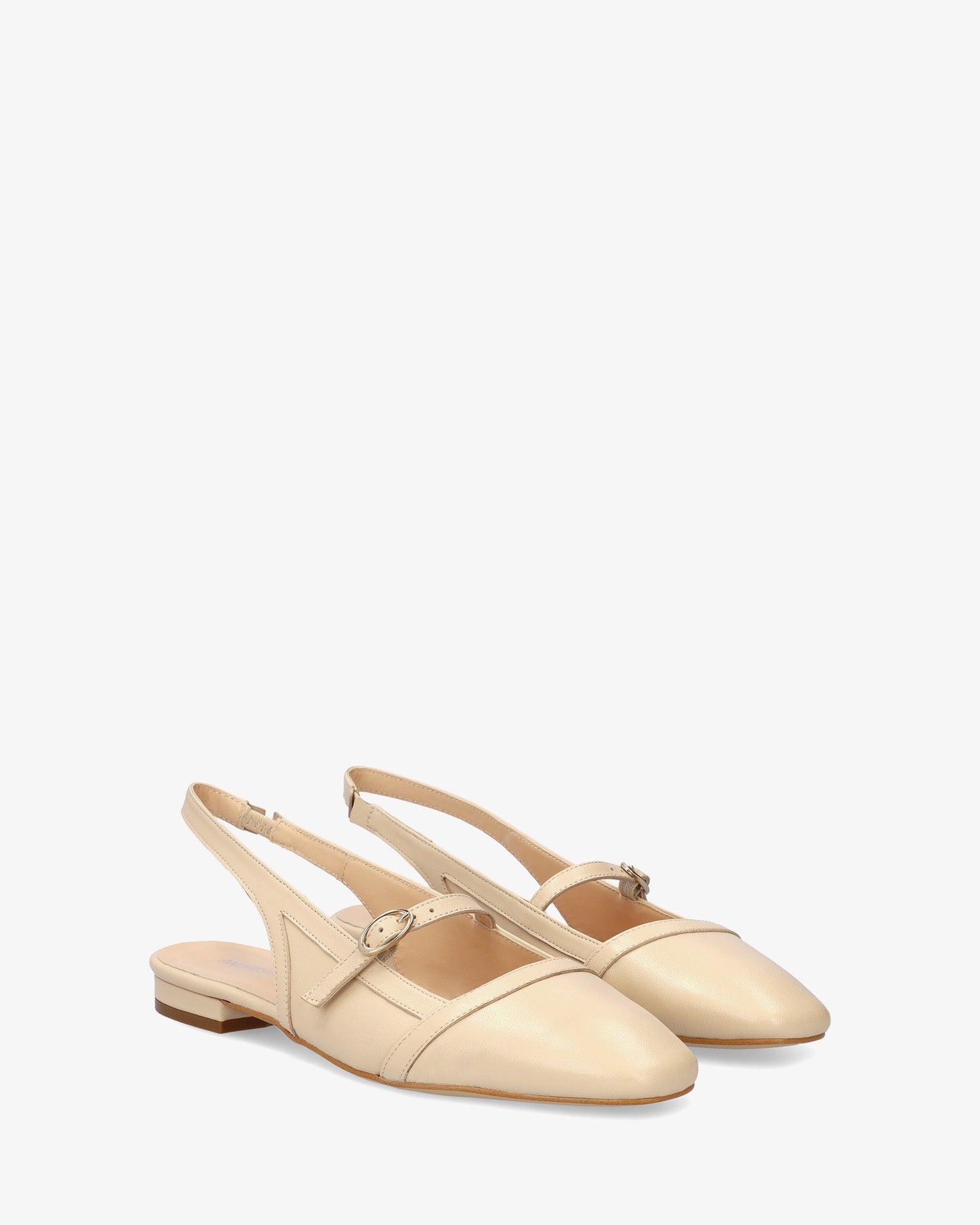 Flat slingback ballerina in smooth leather, Beige colour. Features a closed, rounded toe design with a thin tone-matching strap and a metal buckle on the instep. Beige leather lining. An elasticated ankle strap ensures a secure fit. The thin lined heel measures 0,590 inch for large sizes from 42 to 45. Made in Spain.