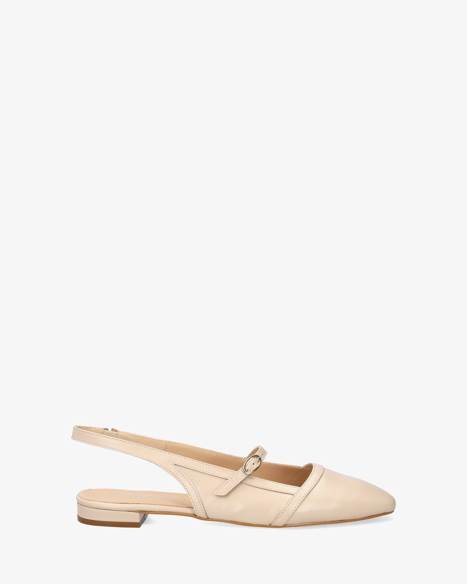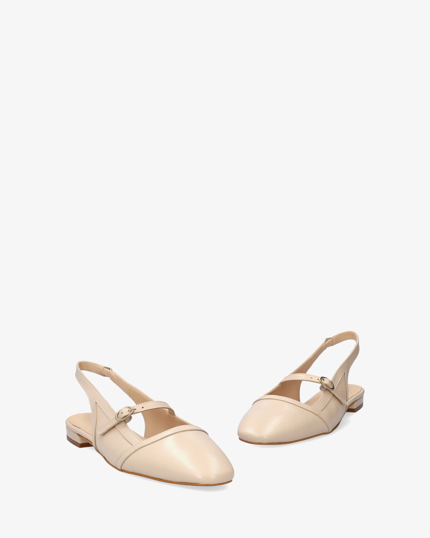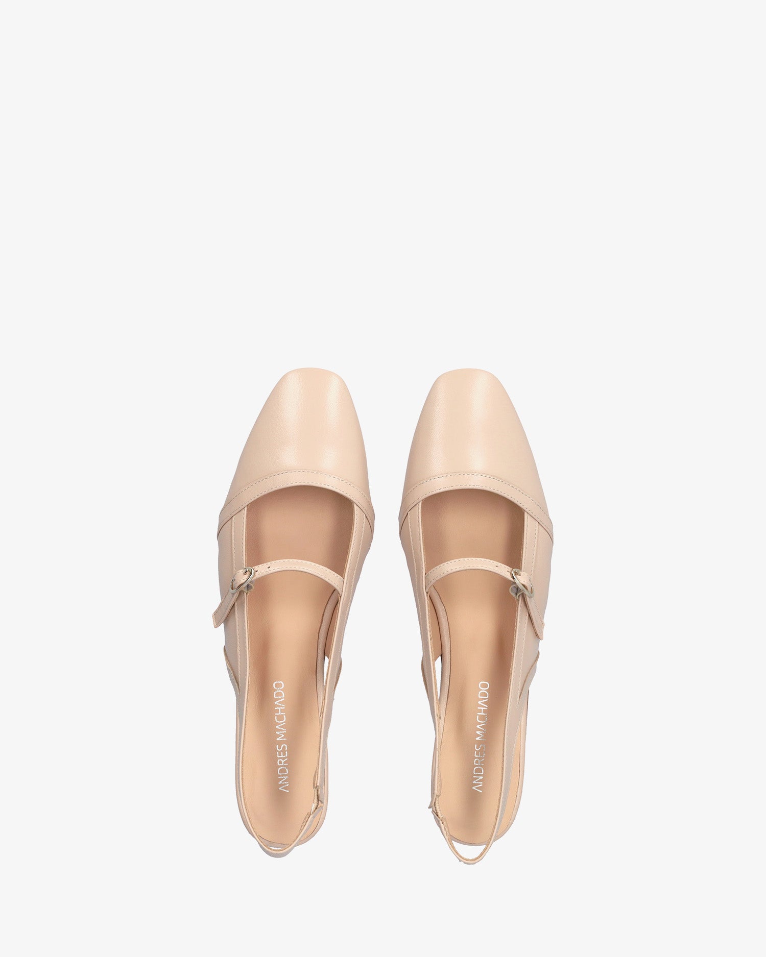 Flat slingback ballerina in smooth leather, Beige colour. Features a closed, rounded toe design with a thin tone-matching strap and a metal buckle on the instep. Beige leather lining. An elasticated ankle strap ensures a secure fit. The thin lined heel measures 0,590 inch for large sizes from 42 to 45. Made in Spain.
