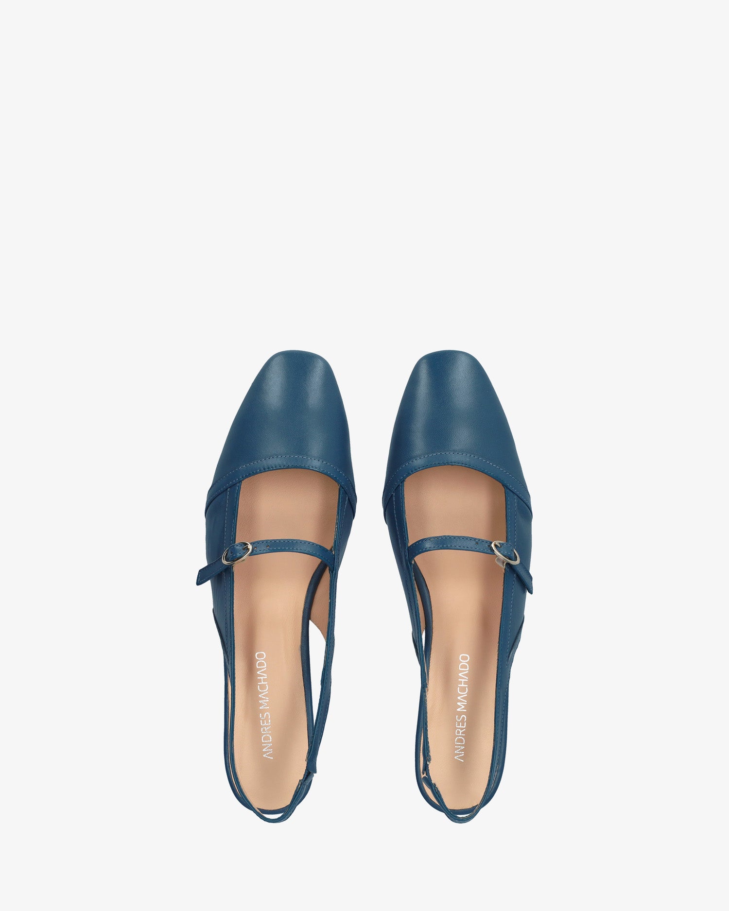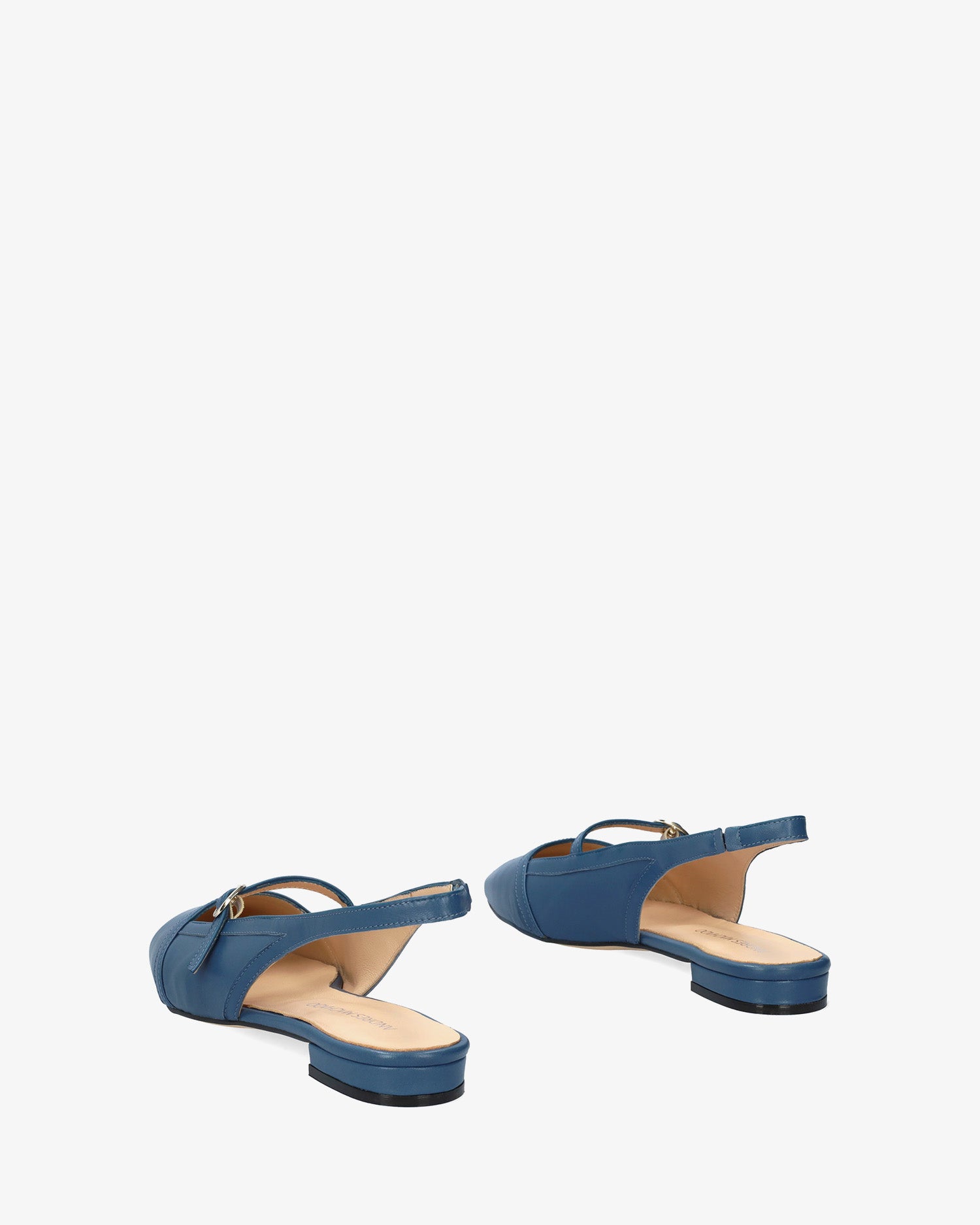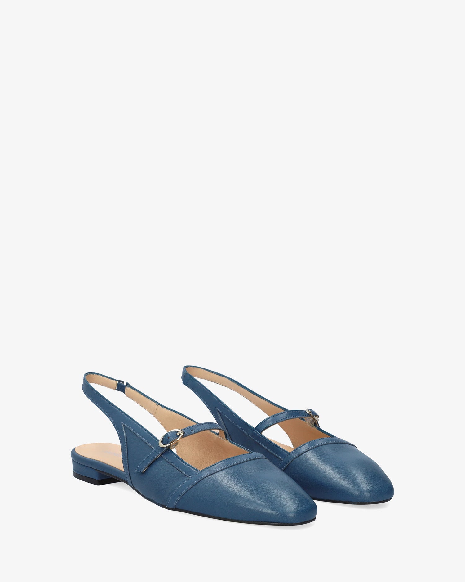 Flat slingback ballerina in smooth leather, Blue colour. Features a closed, rounded toe design with a thin tone-matching strap and a metal buckle on the instep. Beige leather lining. An elasticated ankle strap ensures a secure fit. The thin lined heel measures 0,590 inch for large sizes from 42 to 45. Made in Spain.