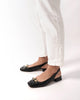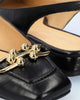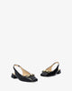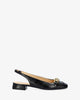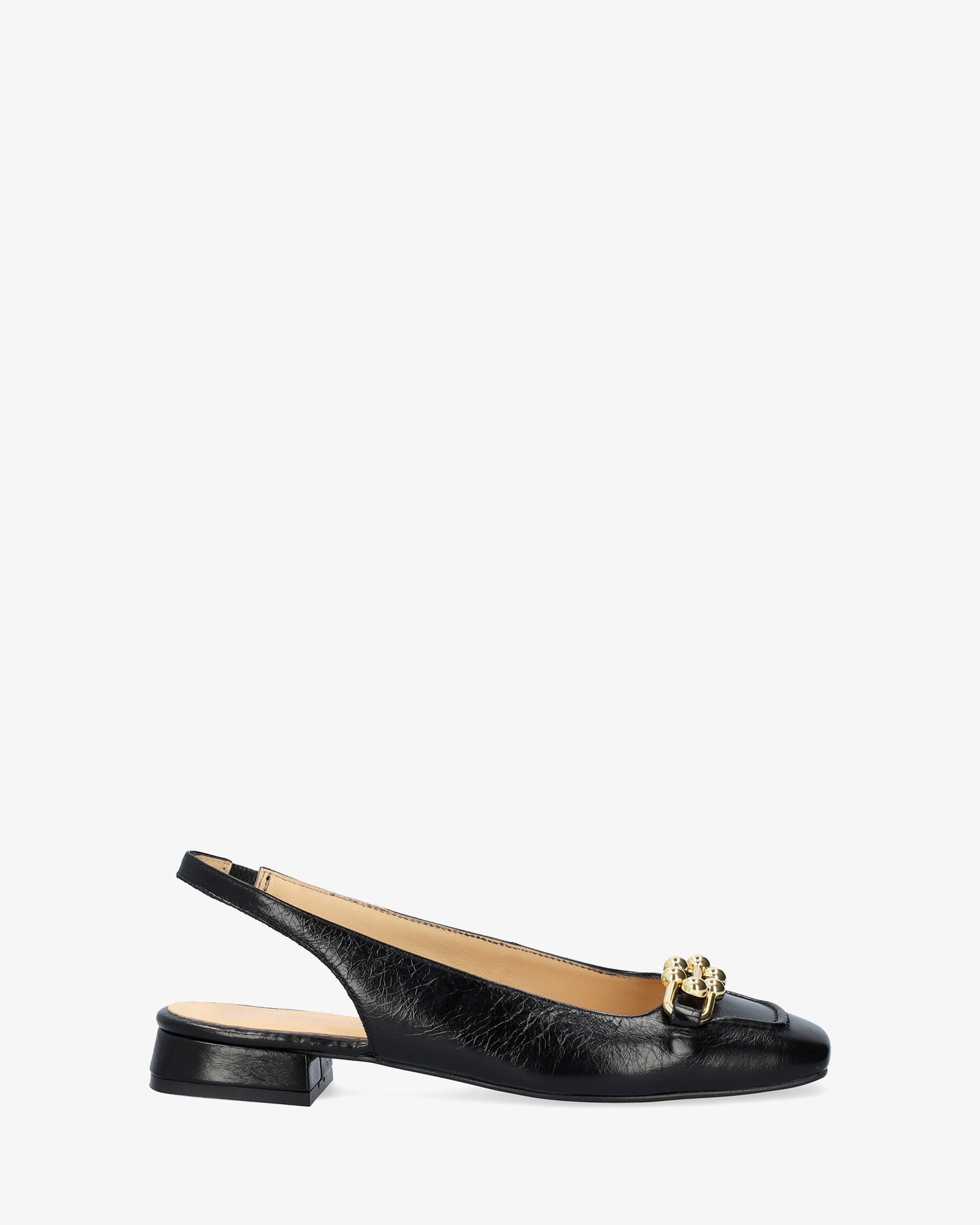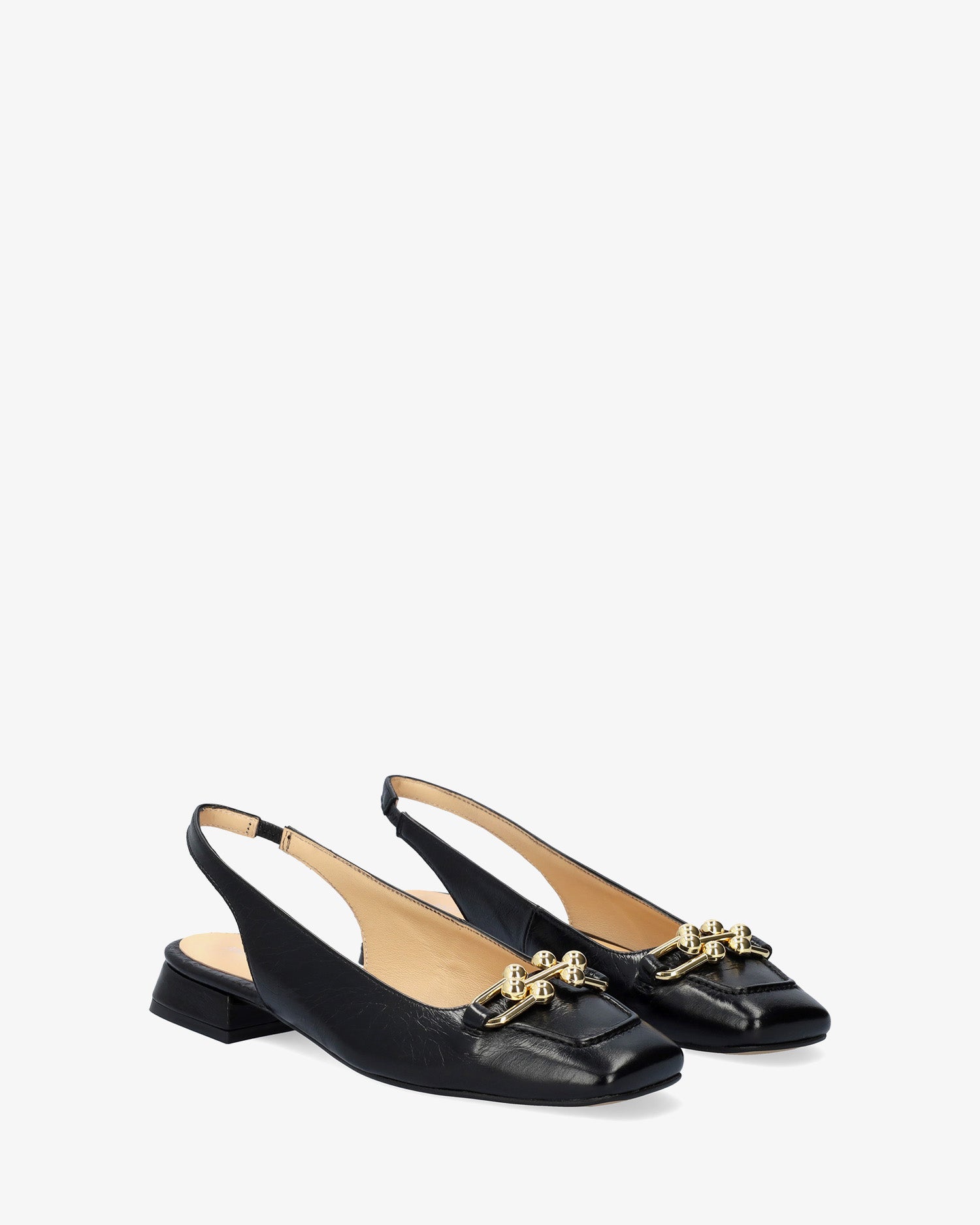 Slingback loafers in black plain leather. The design features a squared toe with a small gold buckle detail over the vamp finished with matching decorative stitching. Ankle strap with tone-on-tone elastic for added support, inner lining in beige colour. The block heel measures 0,98" for small sizes from 32 to 35 and 1,18" for large sizes from 42 to 45. Made in Spain.