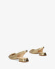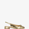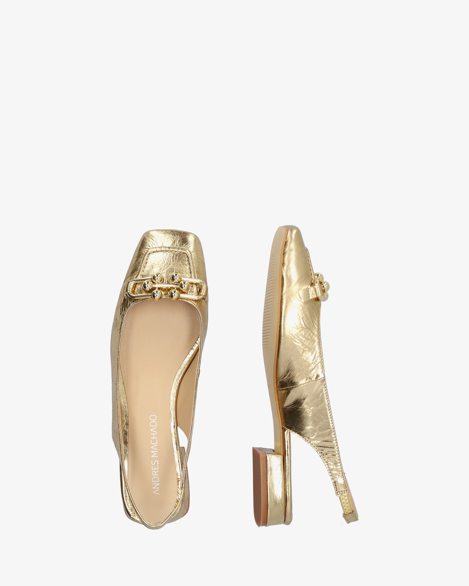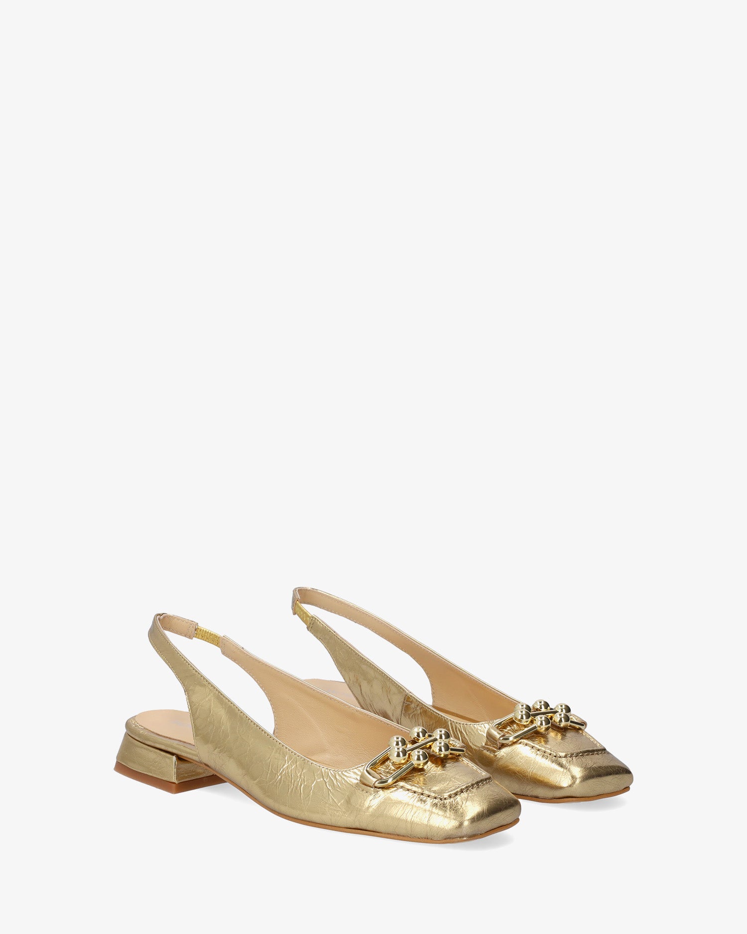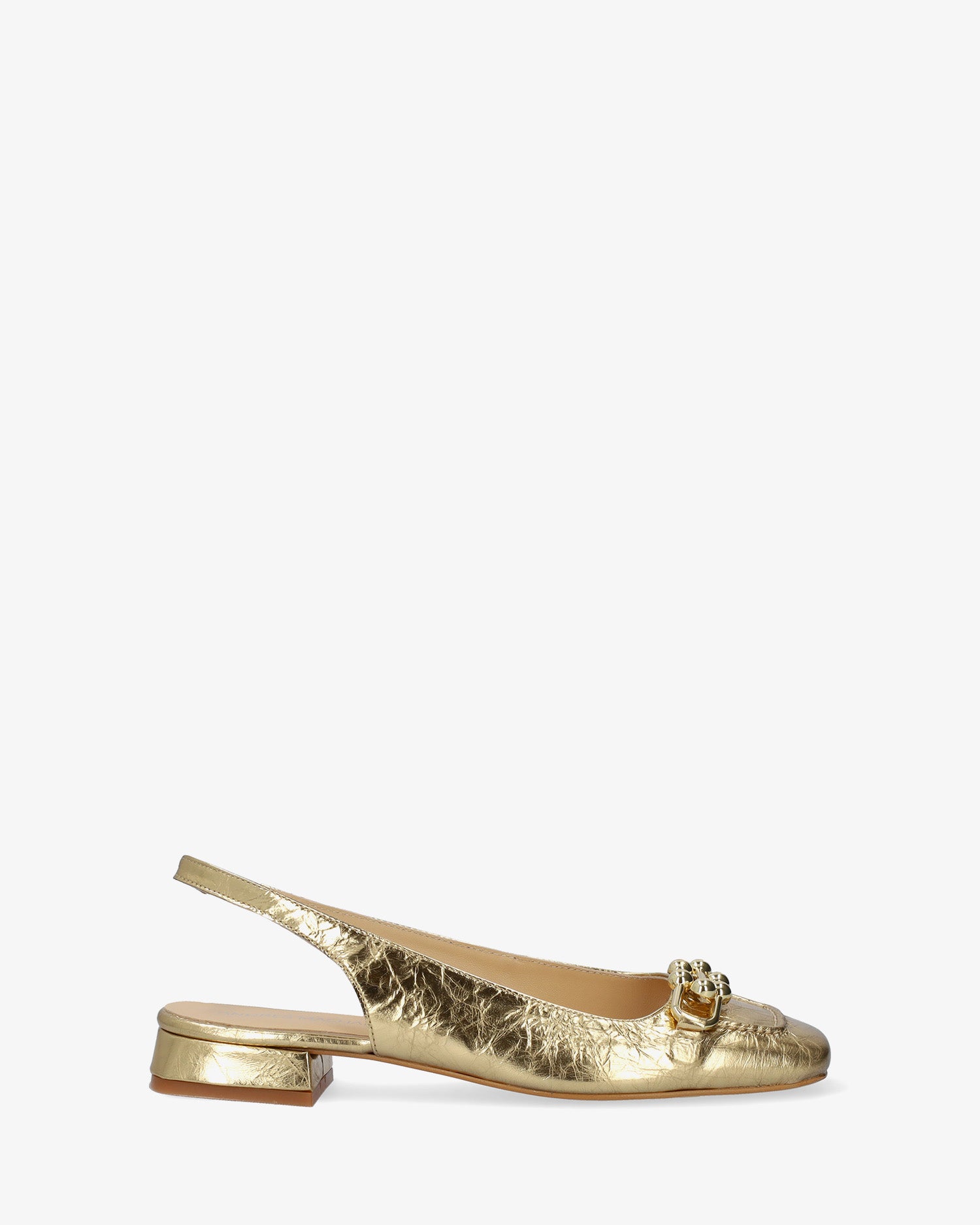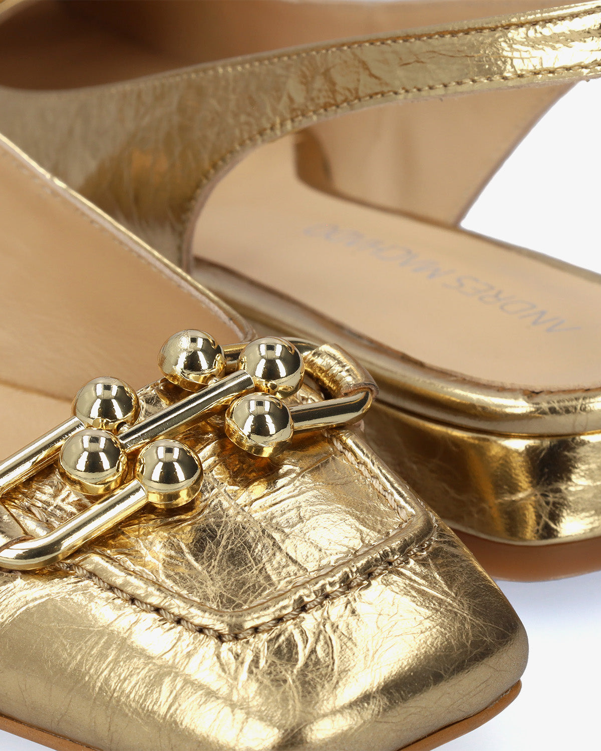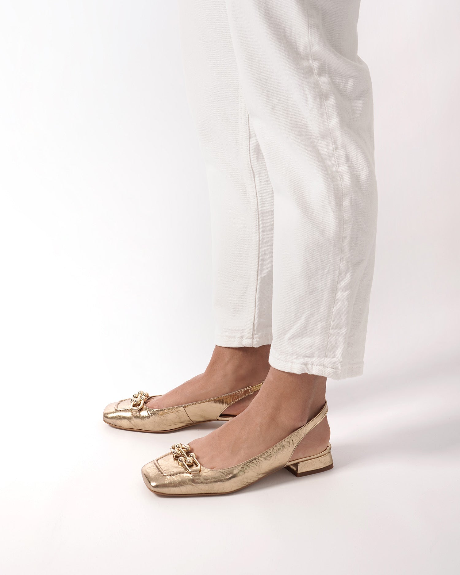 Slingback loafers in golden plain leather. The design features a squared toe with a small gold buckle detail over the vamp finished with matching decorative stitching. Ankle strap with tone-on-tone elastic for added support, inner lining in beige colour. The block heel measures 0,98" for small sizes from 32 to 35 and 1,18" for large sizes from 42 to 45. Made in Spain.