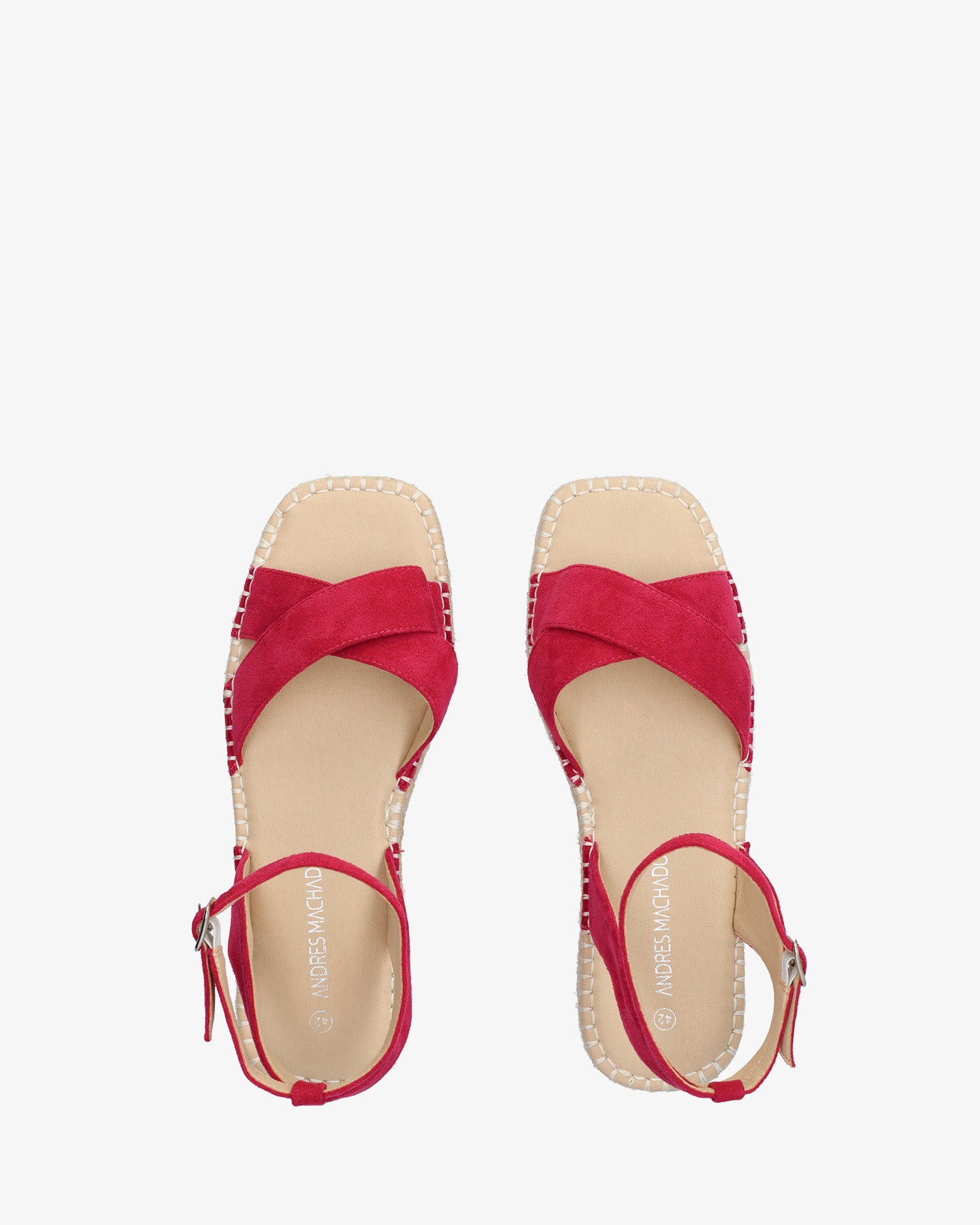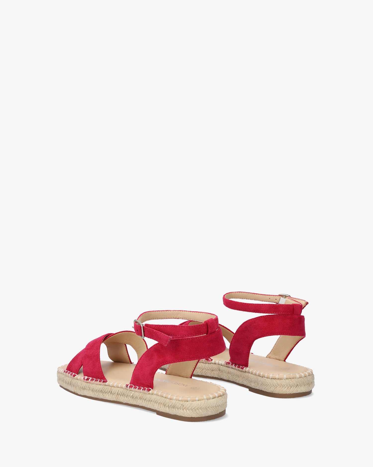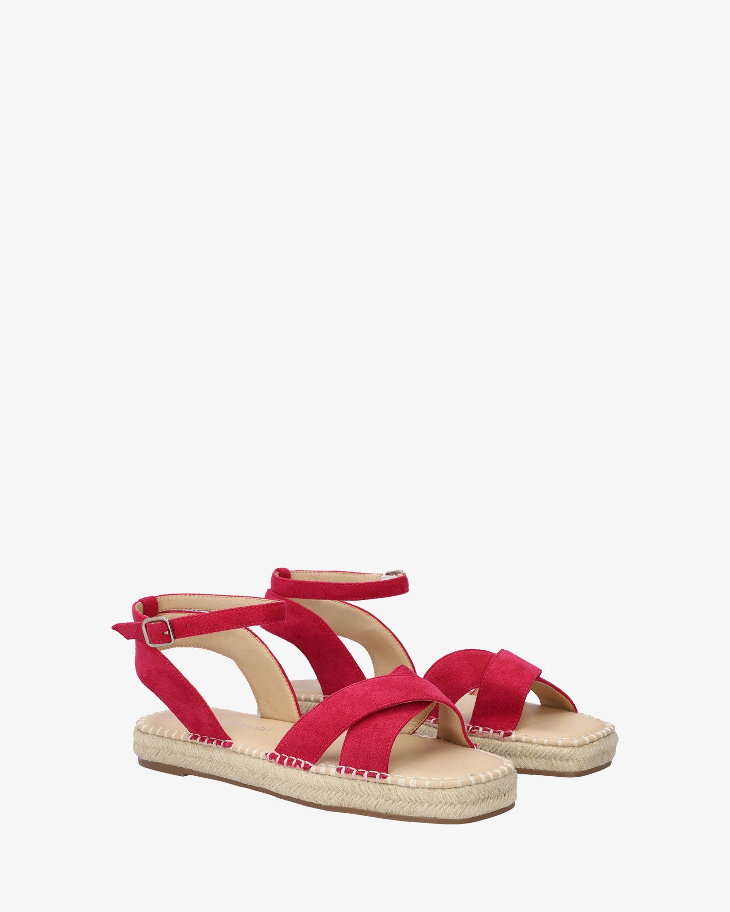 Fuchsia faux suede sandals. Slingback design with matching wide straps crossed over the front. Buckled strap closure around the ankle. Round and open toe.Jute wedge and platform of 1,18"/3cm for large sizes from 42 to 45 EU.