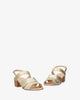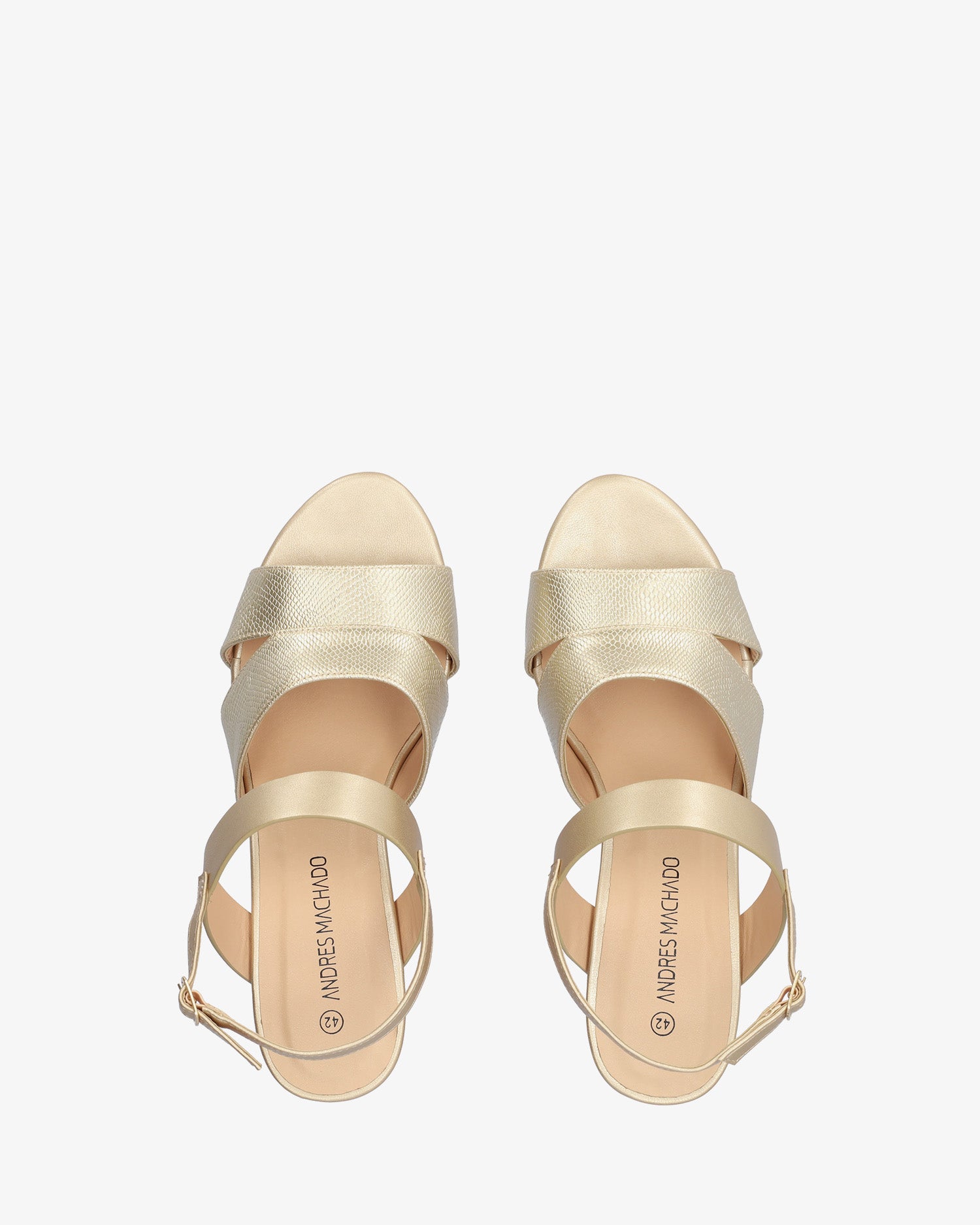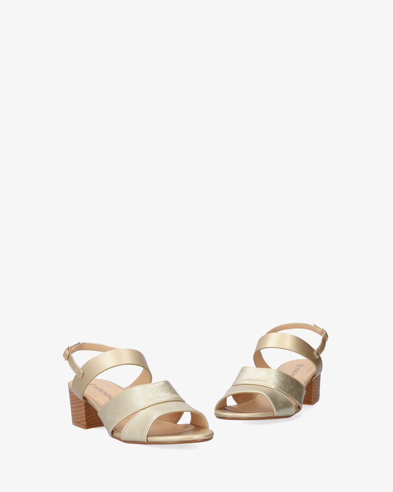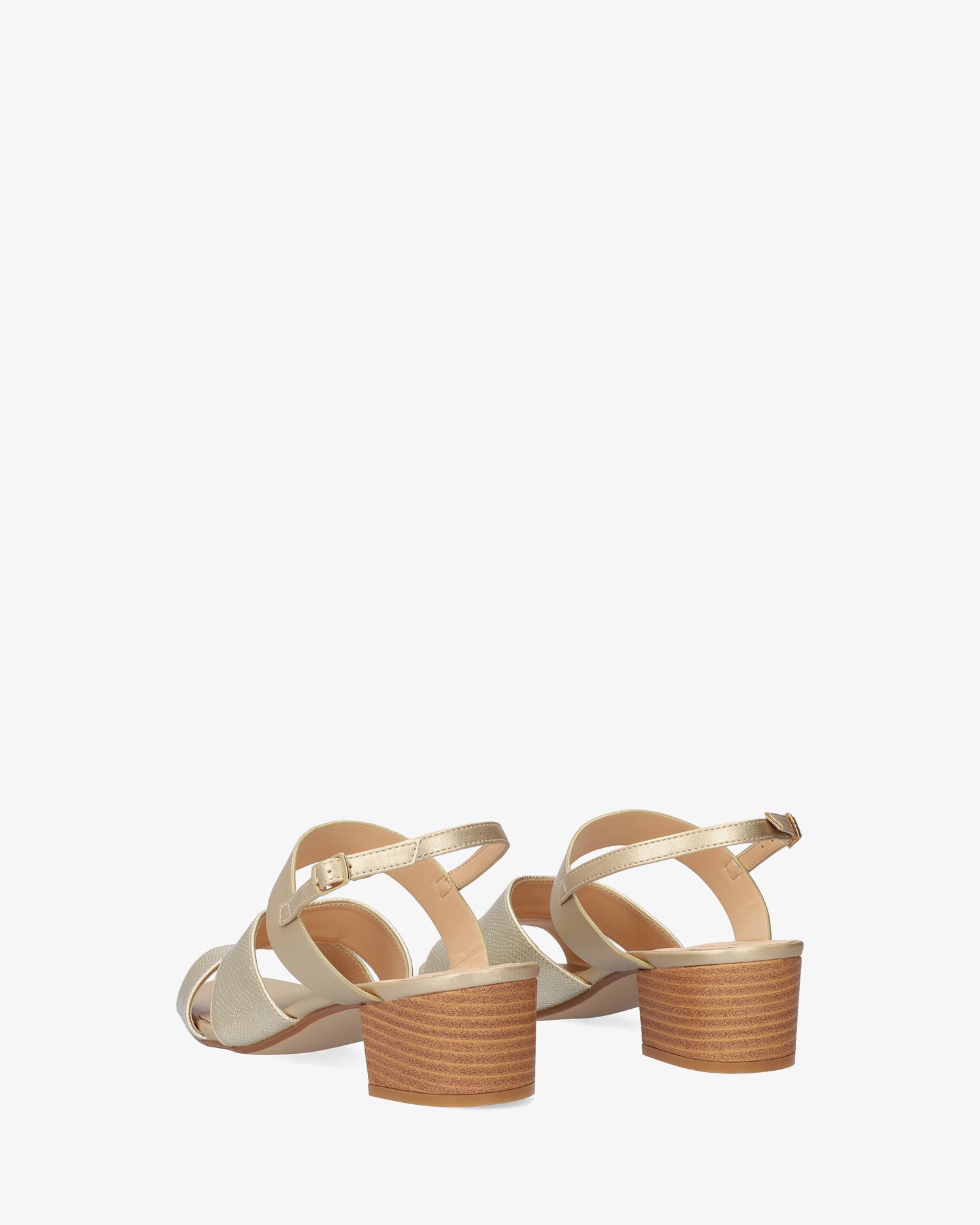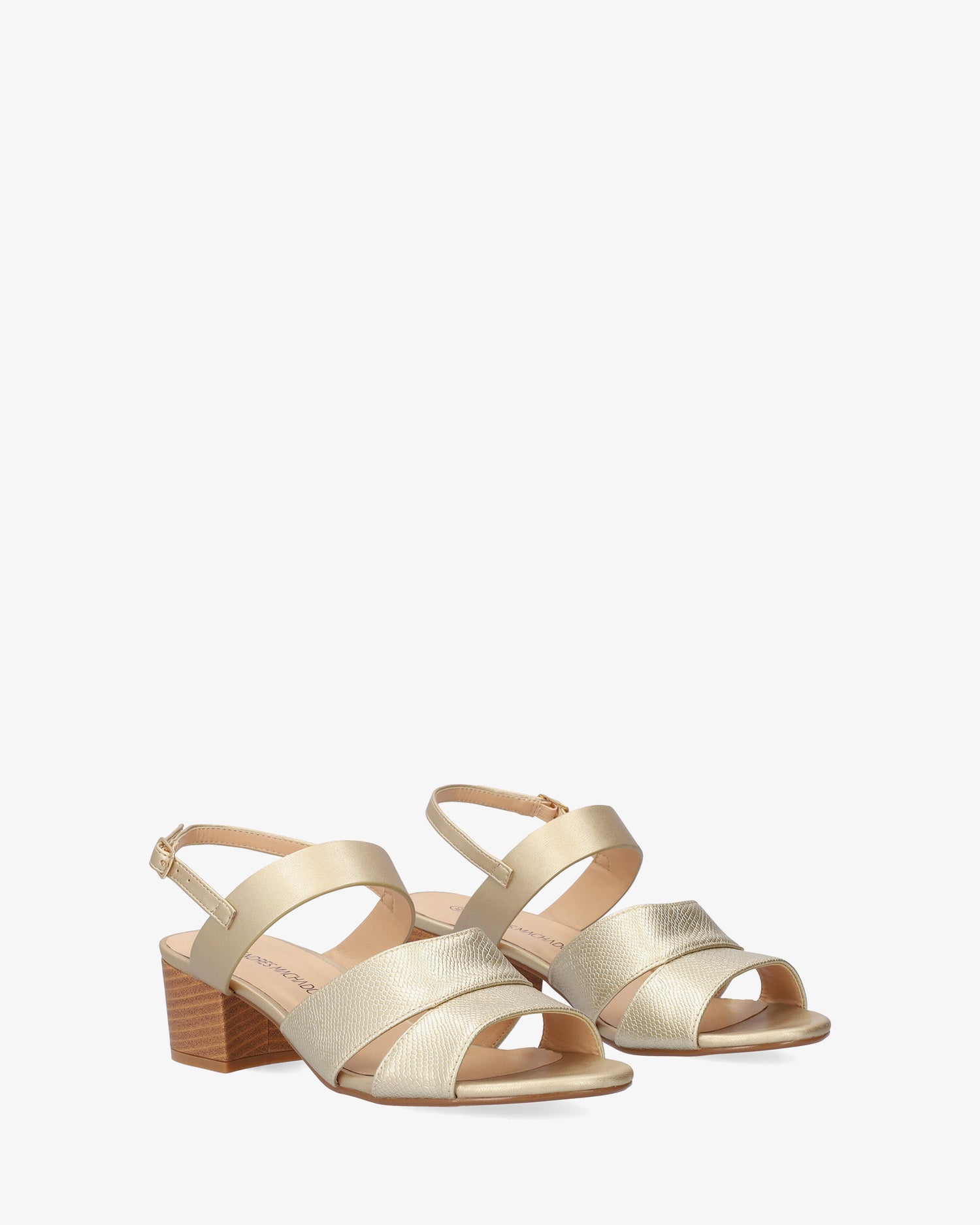 Gold embossed faux leather with wide heel. Slingback design featuring two joined wide straps over vamp and an additional wide strap over the instep. Matching buckled strap closure around the ankle. Round and open toe box. The wood-like heel is 1,97`` for small sizes from 32 to 35 EU. The wood-like heel is 2,16`` for small sizes from 42 to 45 EU. Narrow fit. We recommend taking one size up if you have a wide foot or you are between two sizes.