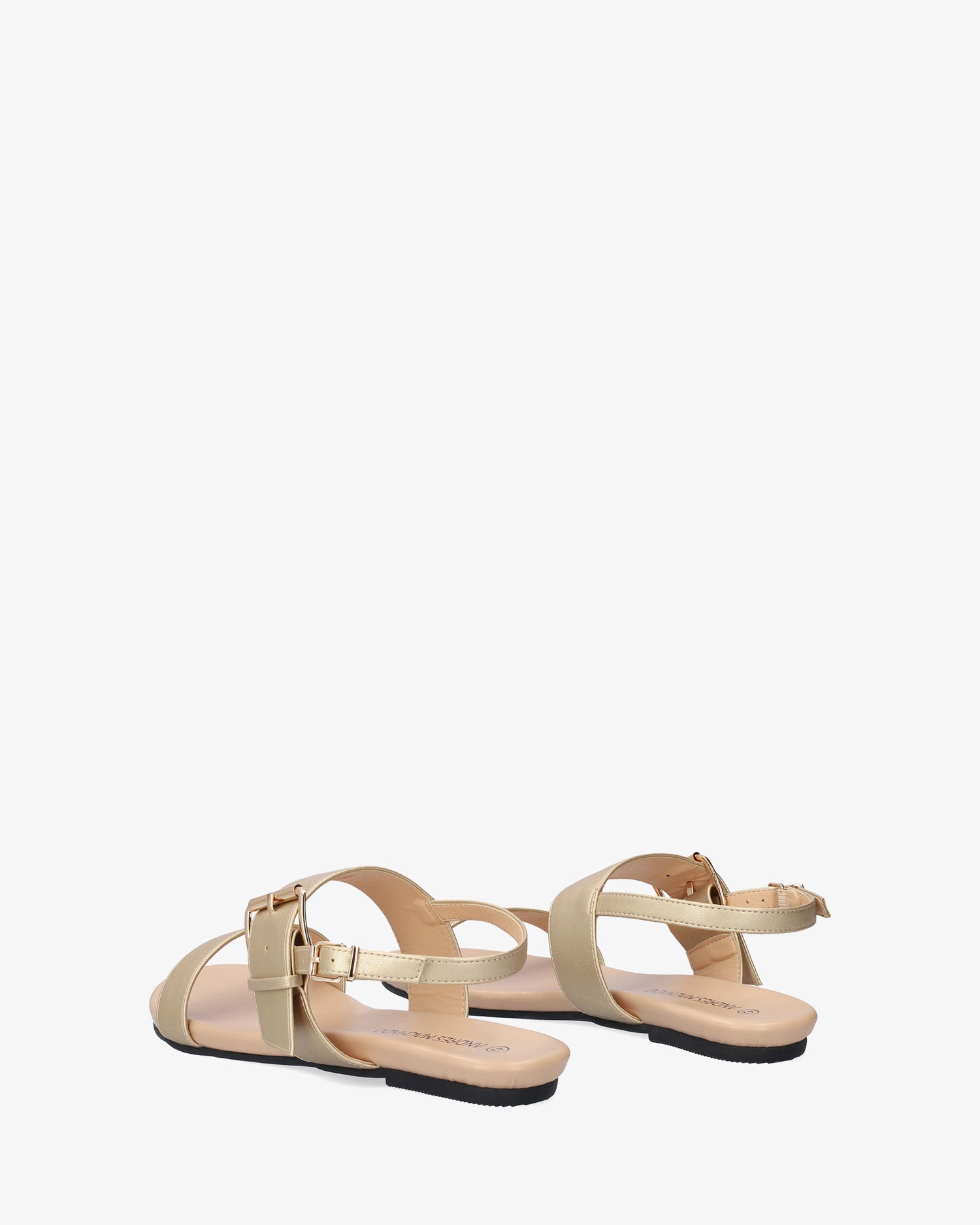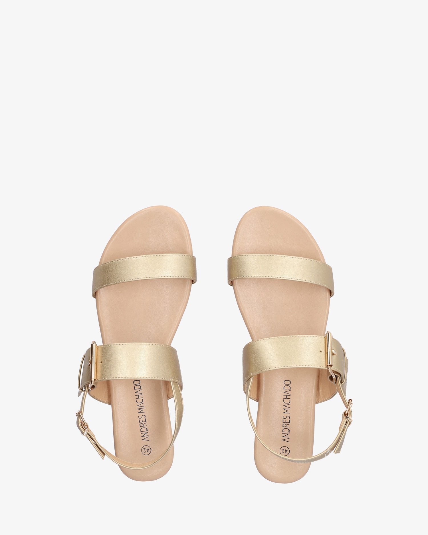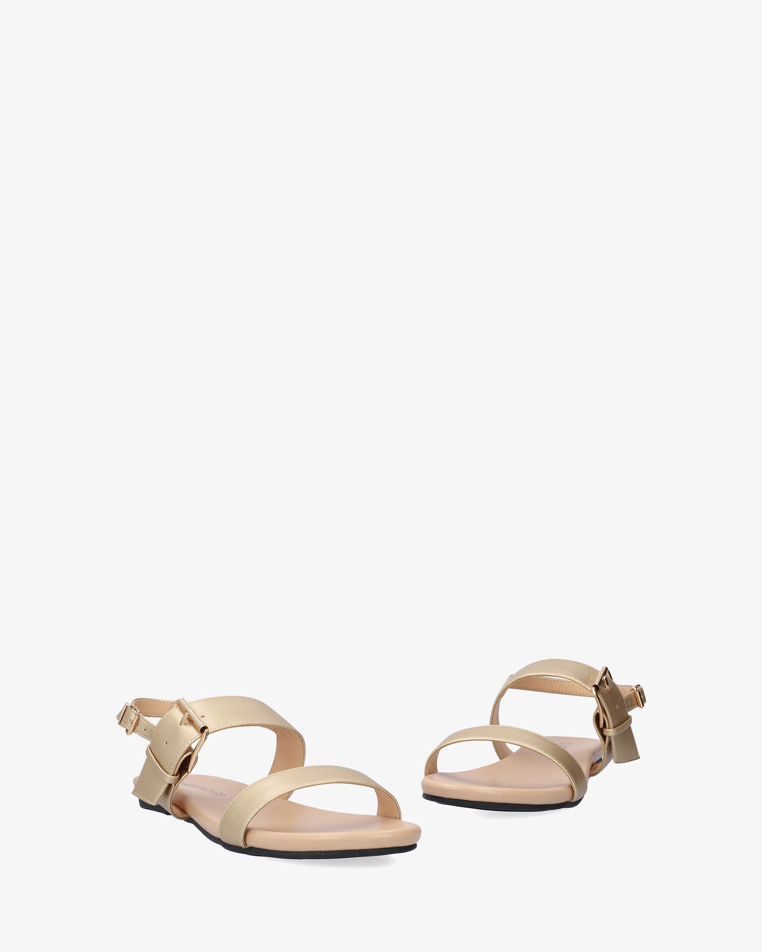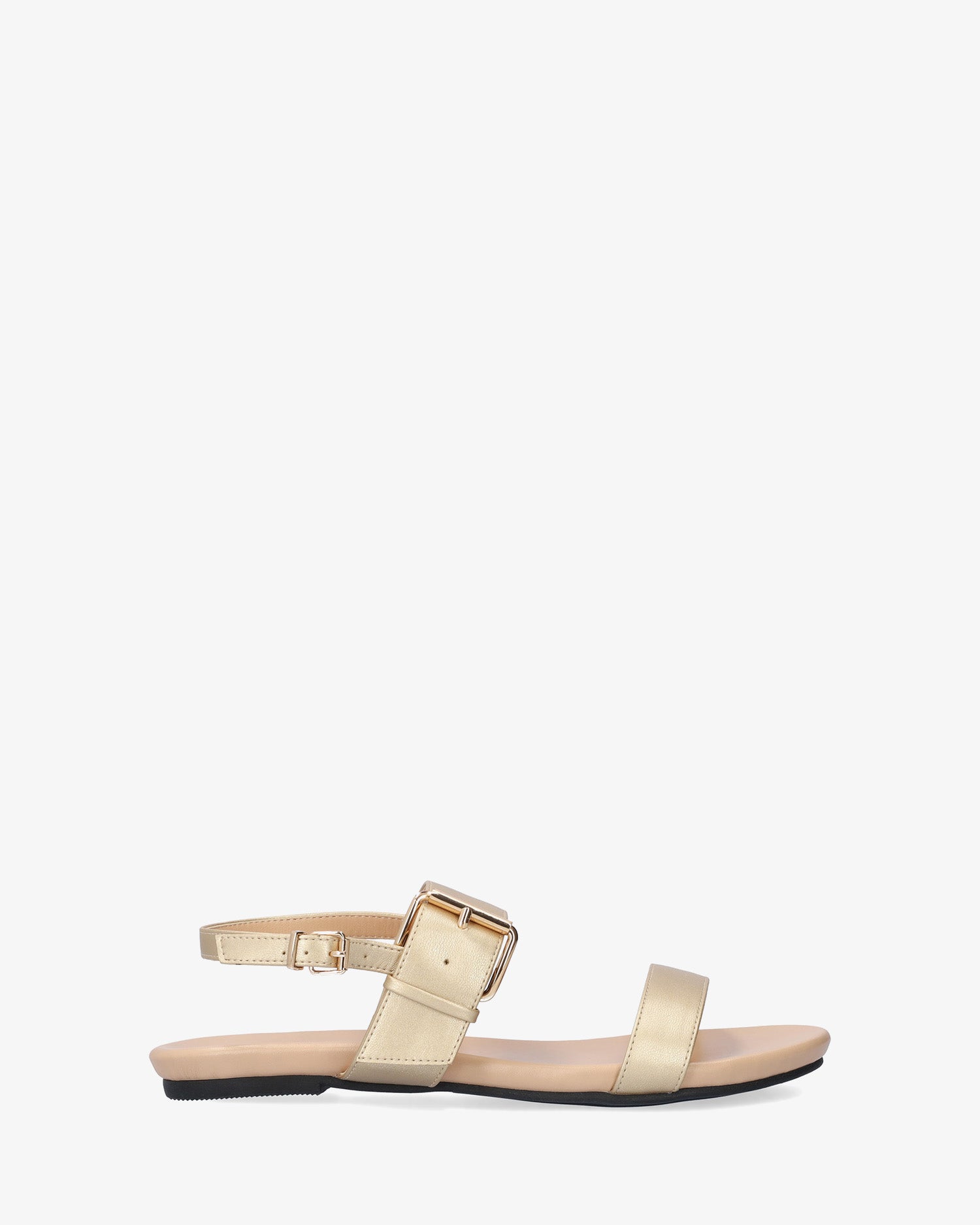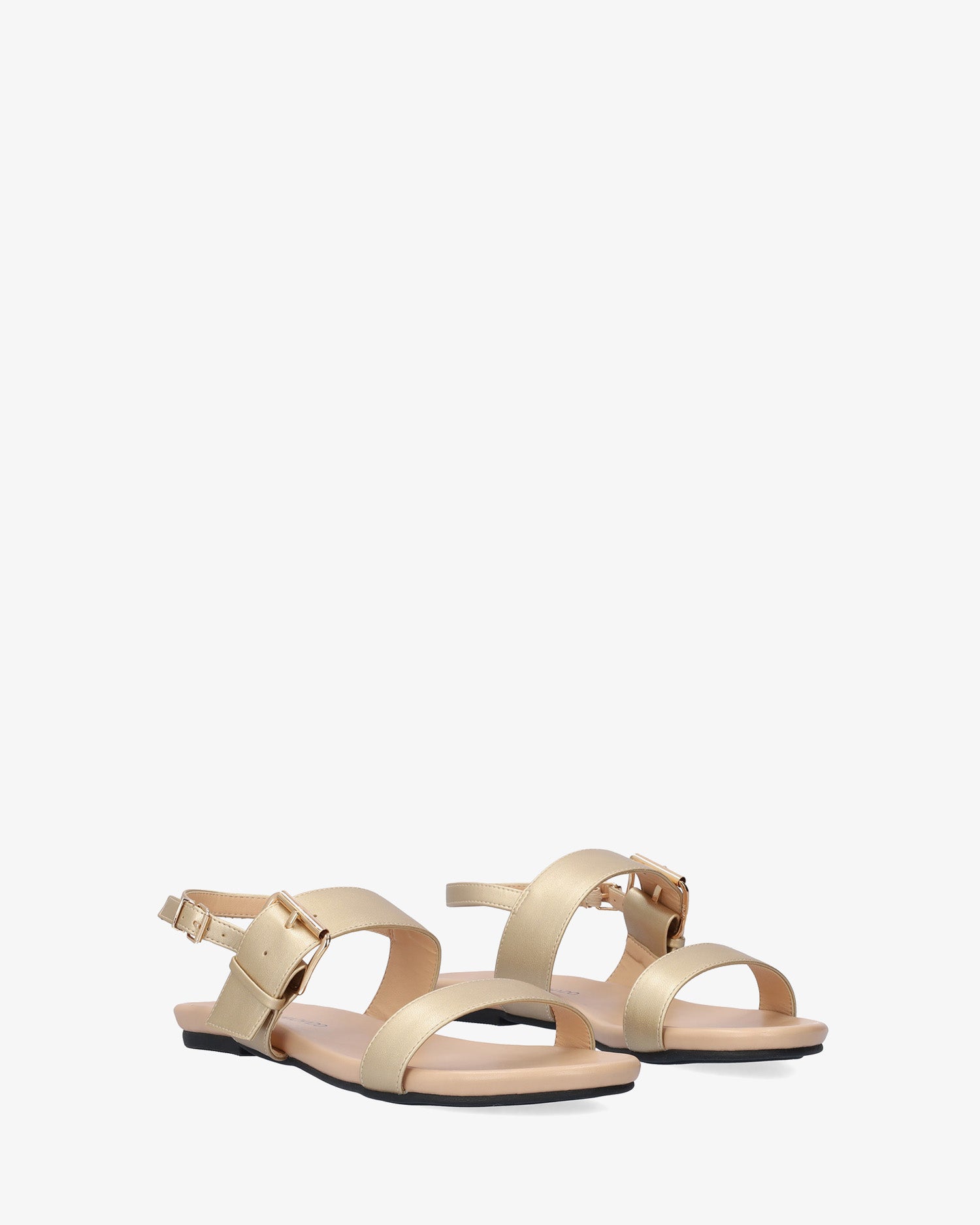 Gold faux leather flat sandals. Slingback design featuring a thin strap over the vamp and a matching wide strap over the instep. Double buckle closure#pc# a big buckle closure on the instep strap and a secondary, small buckle on the ankle strap. Round and open toe box. Cushioned insole. Available in large sizes from 42 to 45 EU.